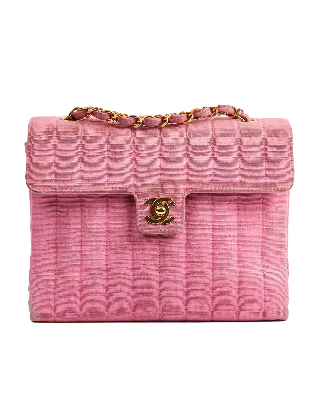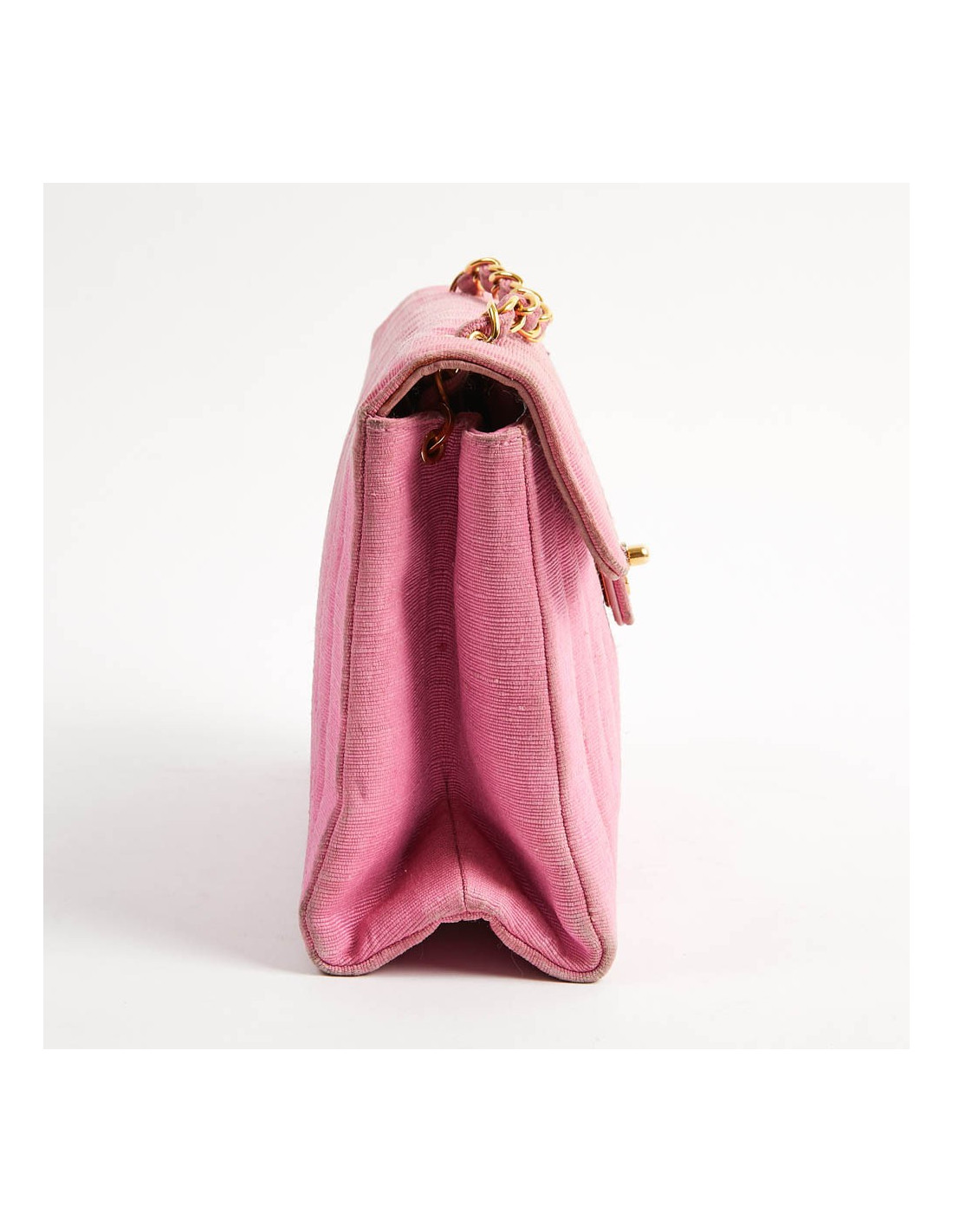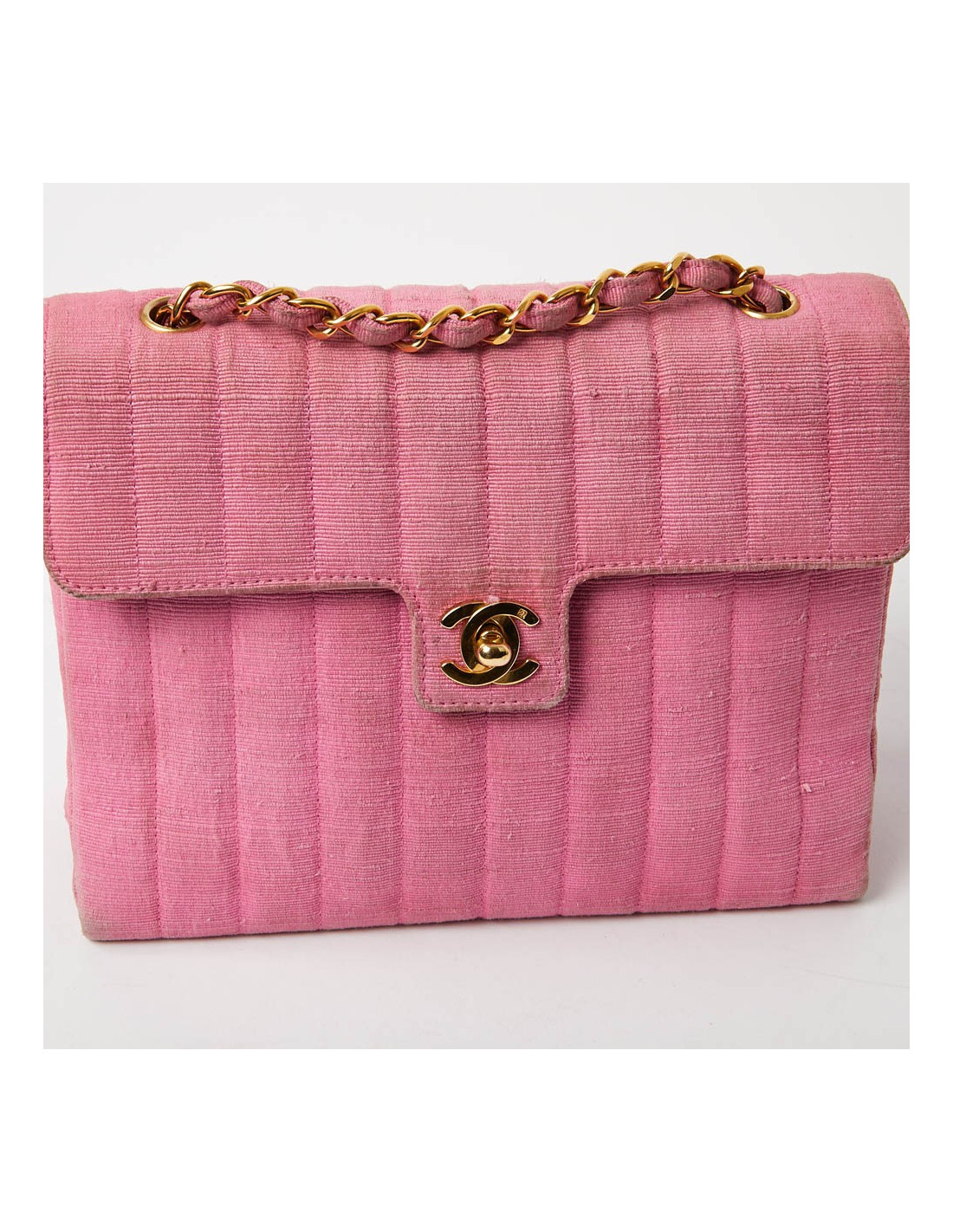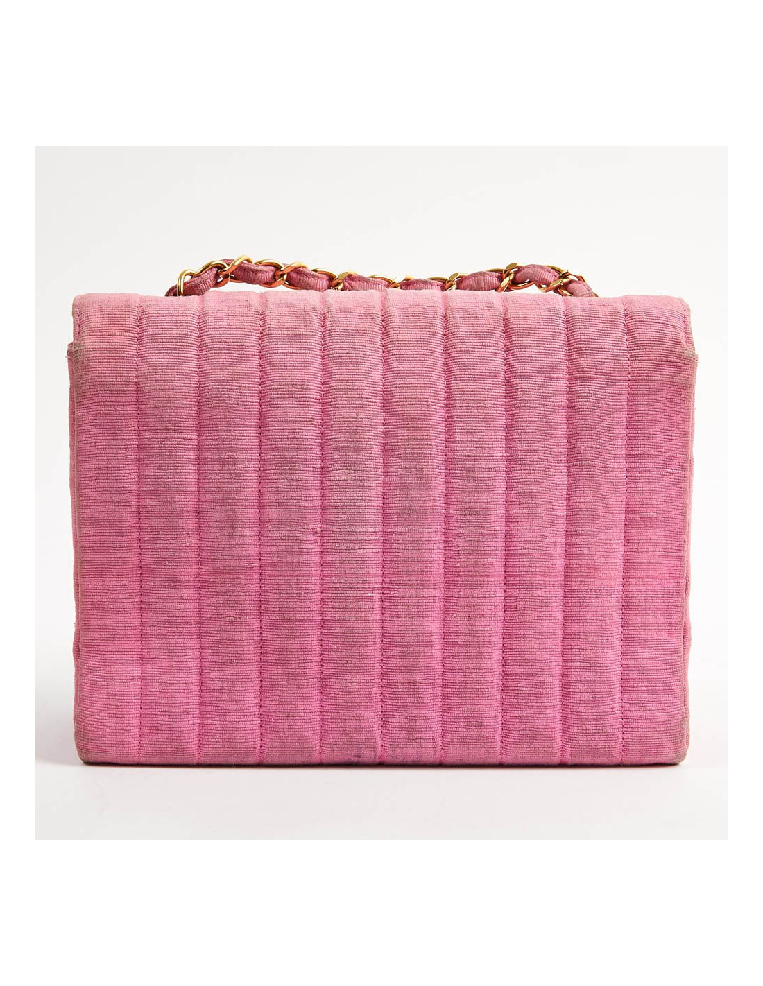 Sac CHANEL des années 90, époque des couleurs vives. Il est en tissu ottoman rose avec la bijouterie dorée. Il est à rabat avec un fermoir CC. La bandoulière est une chaine en métal entremêlée de tissu. A l'intérieur se trouvent 2 poches dont une avec fermeture éclair. iIl est doublé de cuir rose, en parfait état.