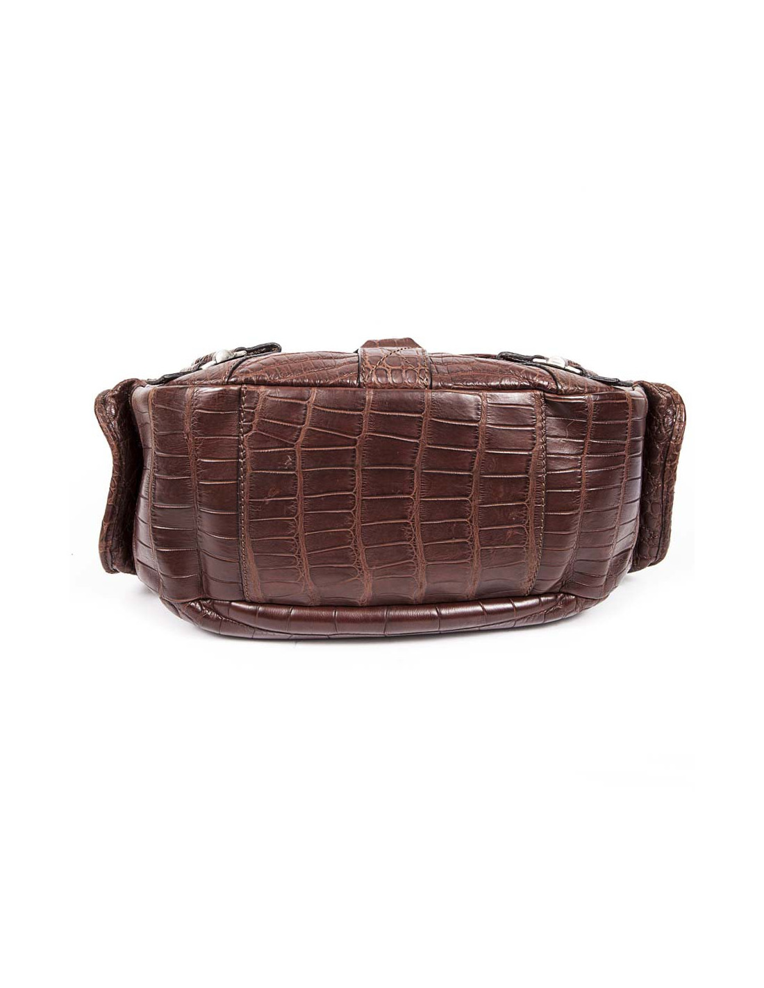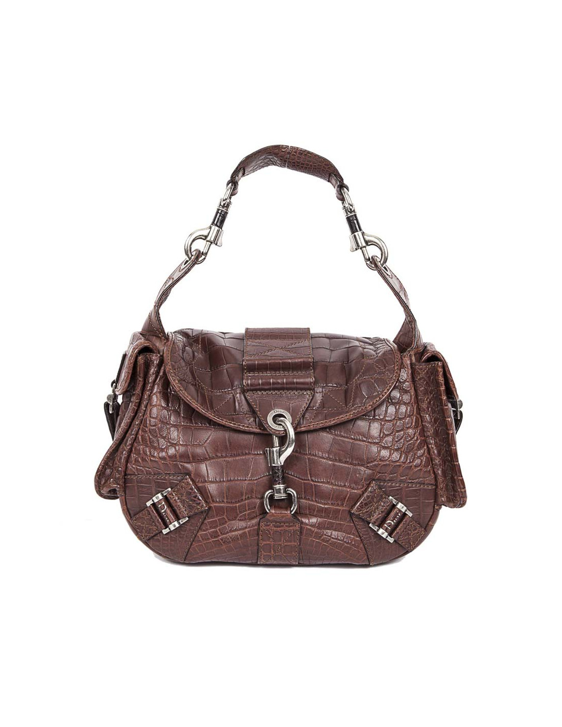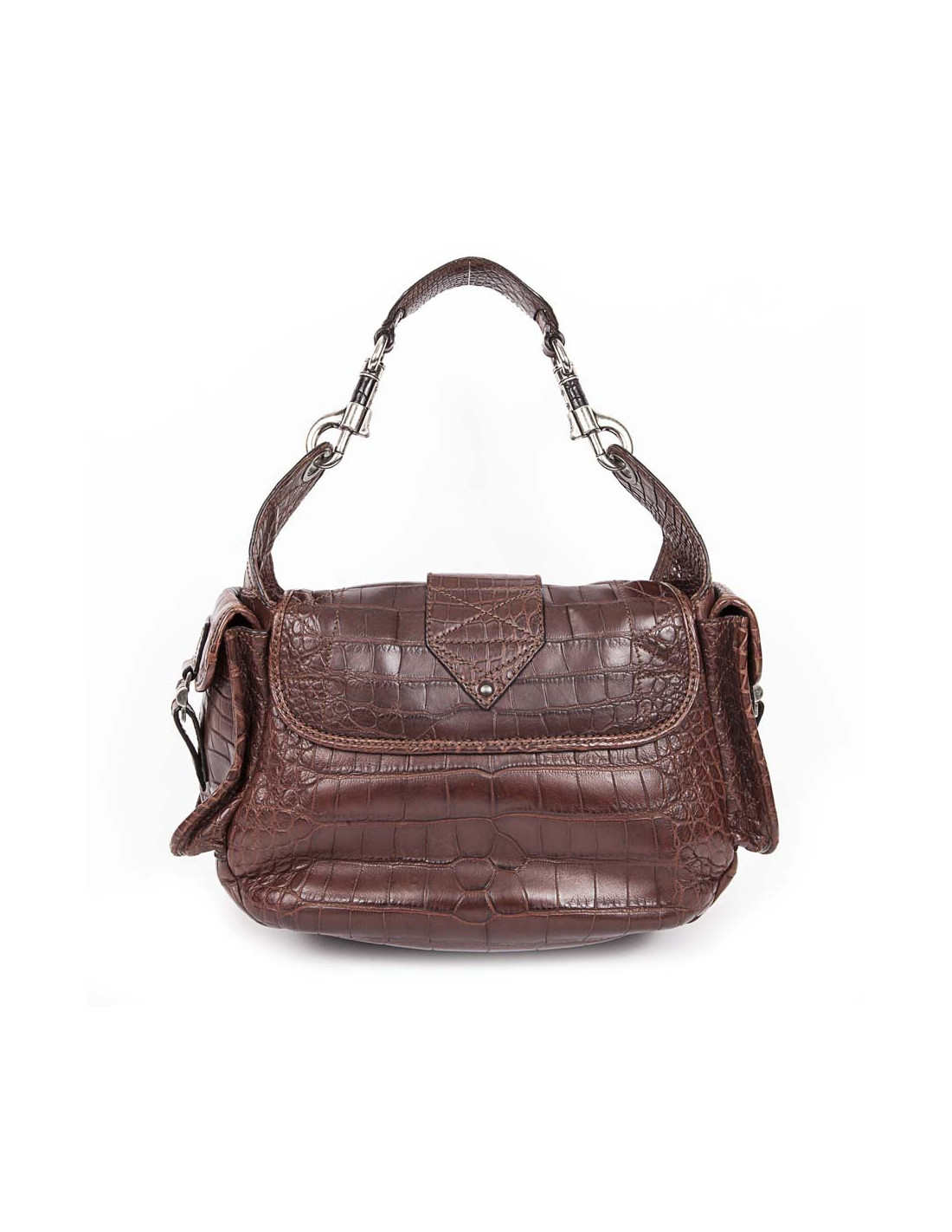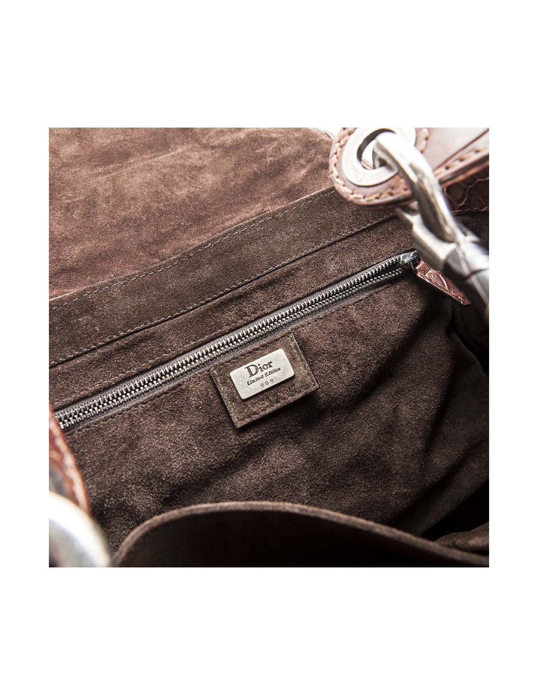 Sac besace de la Maison Dior en crocodile mat de couleur tabac. La bijouterie est en métal argenté vieilli.