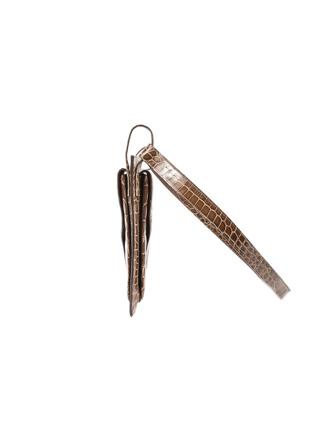 Sac en bandoulière en crocodile de couleur miel de la Maison Bottega Veneta. Il dispose de 3 espaces de rangement: 1 centrale et 1 de chaque côté du sac avec un rabat et une fermeture par bouton pression. La bijouterie est en métal doré. Porté épaule ou en crossover. En très bon état.