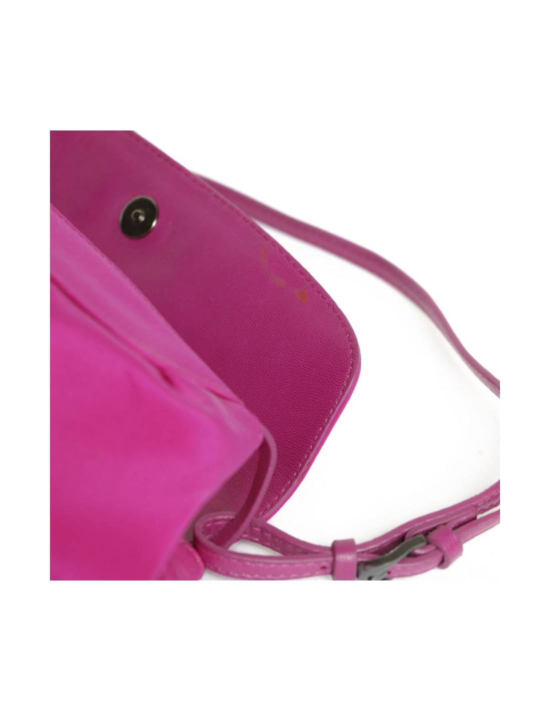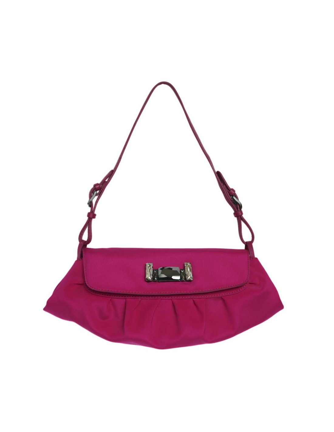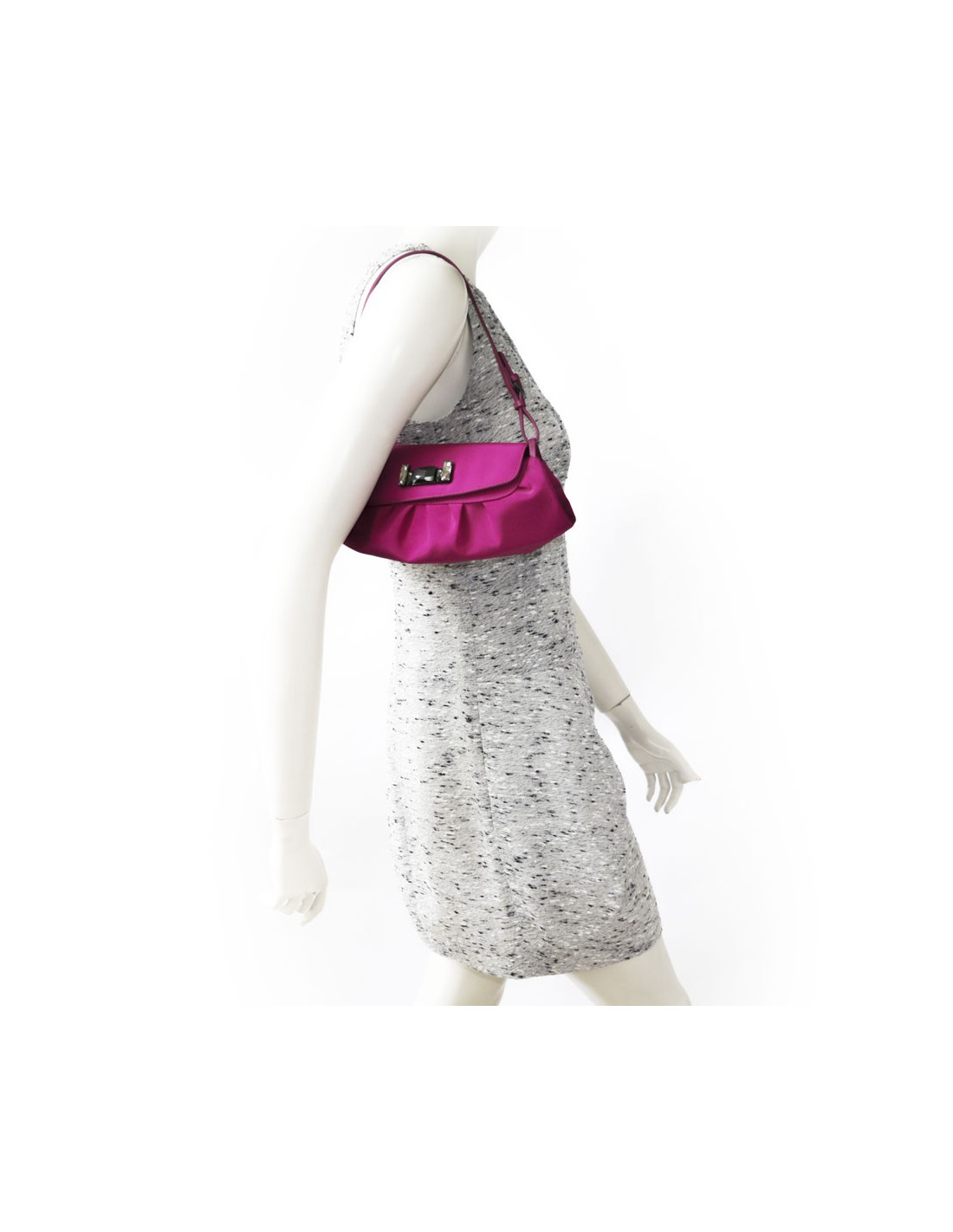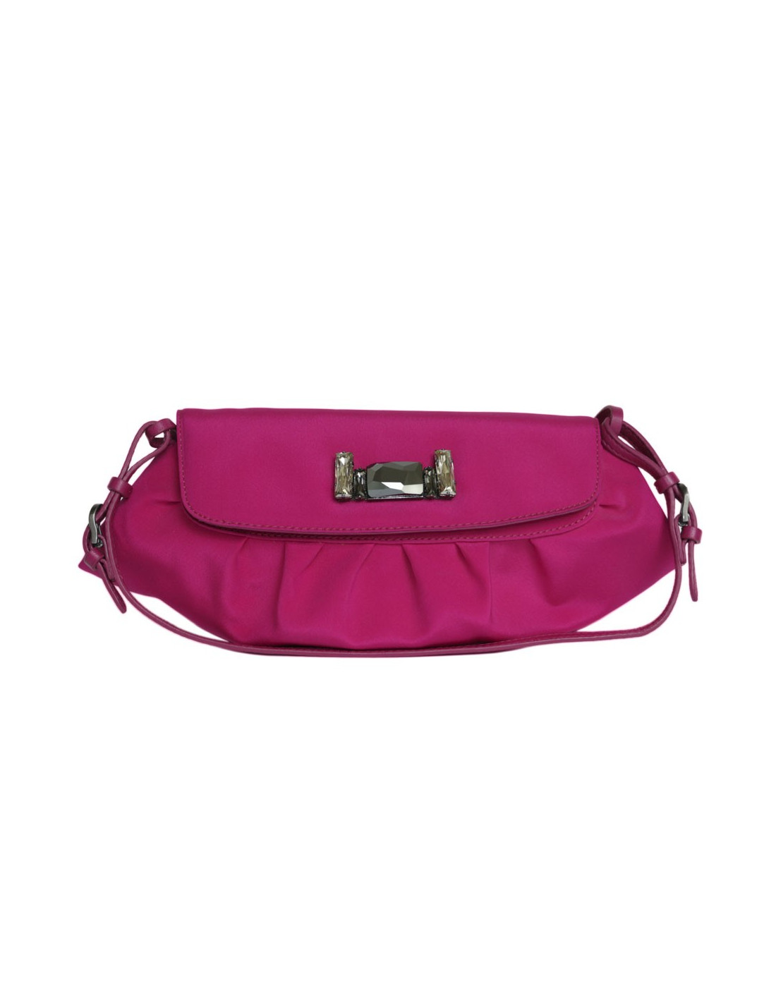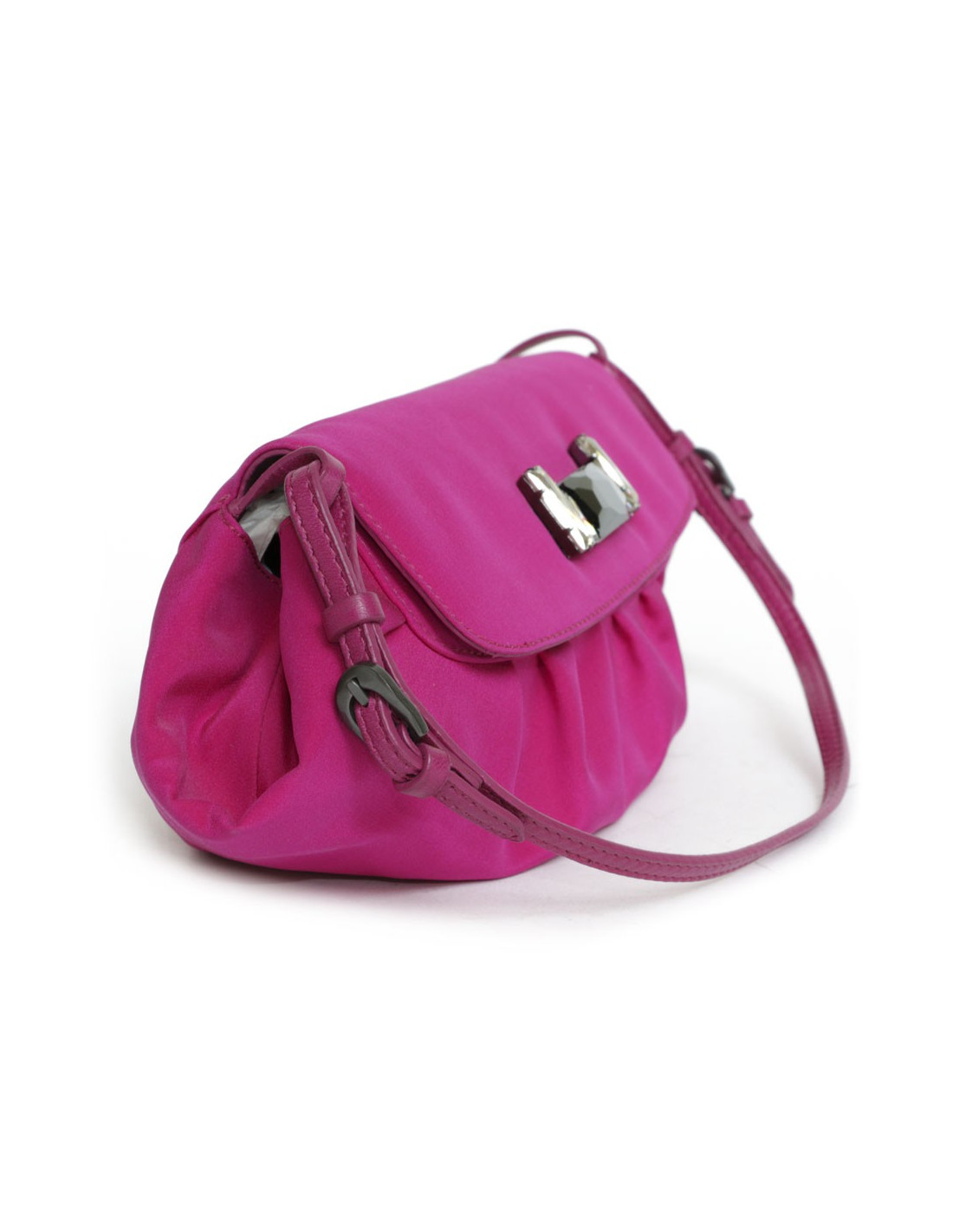 Mini sac en satin de soie rose magenta Jimmy choo. Fermeture par bouton pression. L'intérieur est en satin beige avec une petite poche plaquée. L'anse est en cuir rose. En très bon état.