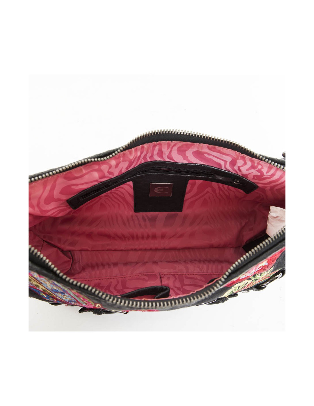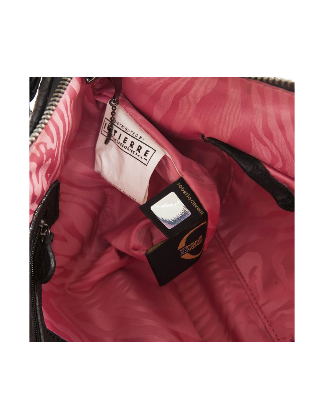 Sac Just Cavalli en toile monogrammée noire et broderies multicolores. Fermeture zippée. Bijouterie argentée. Anse en cuir noir effet python. L'intérieur est en toile rose effet zébré avec 3 poches plaquées dont 1 zippée.