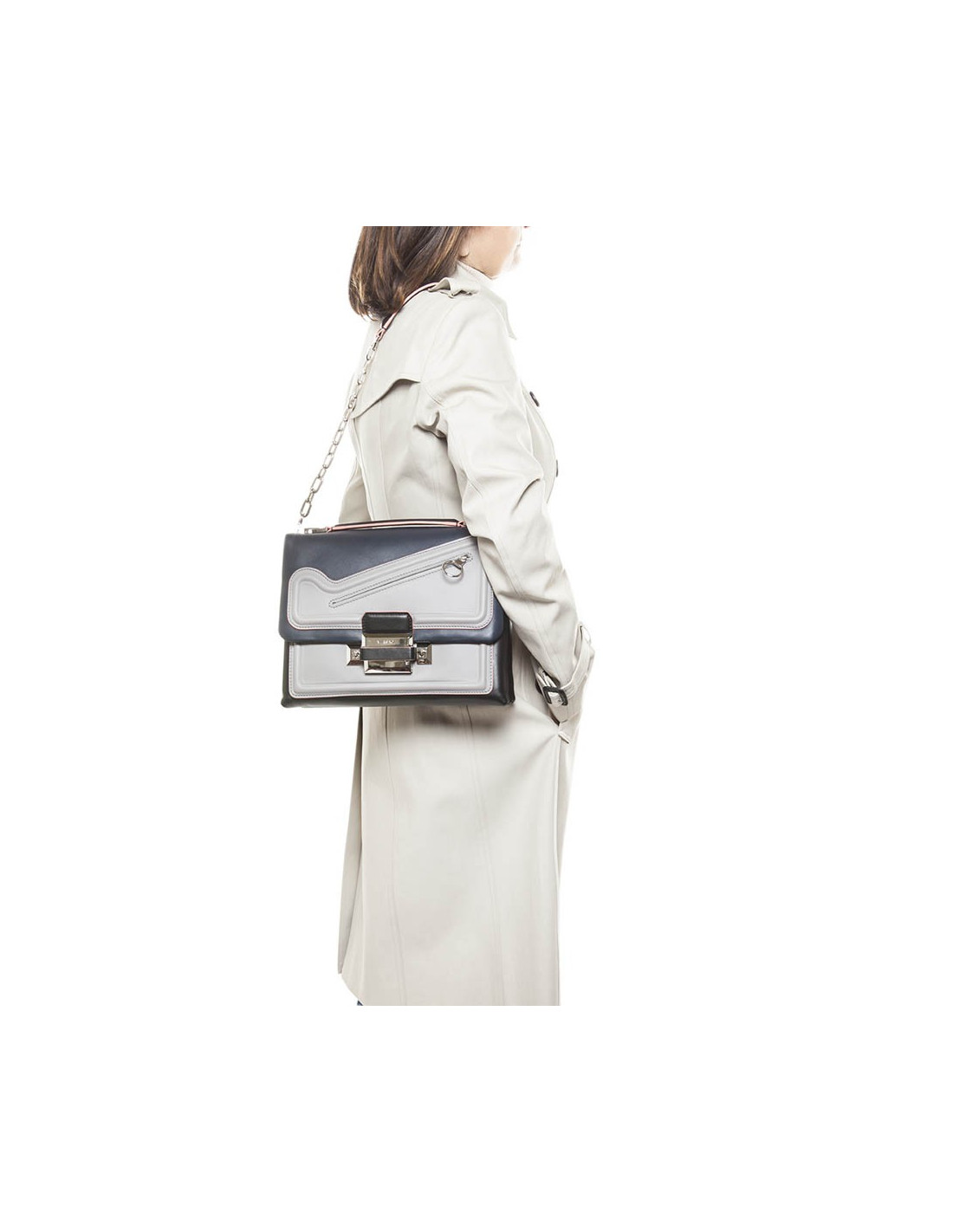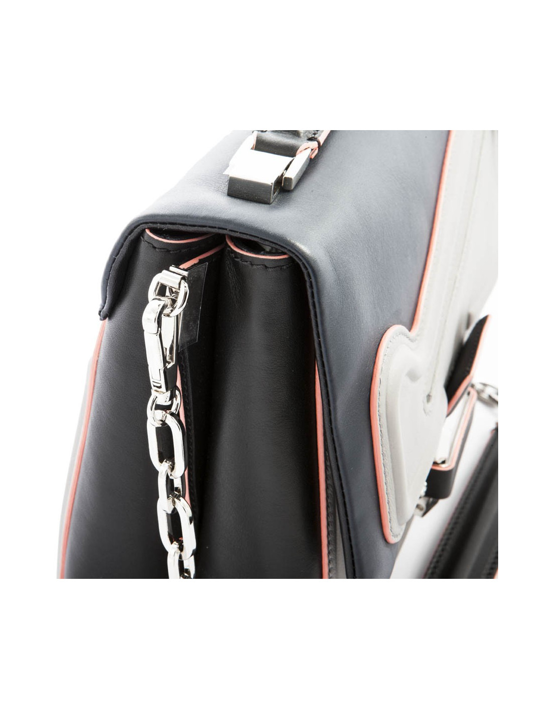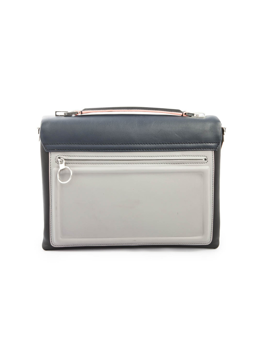 Sac de la Maison Versace en cuir multicolore gris, bleu marine et rose. Bijouterie argentée. L'intérieur est en toile grise avec 2 espaces de rangement séparés par une poche centrale. Numéro de série: CLG 650 ..... Jamais porté.
