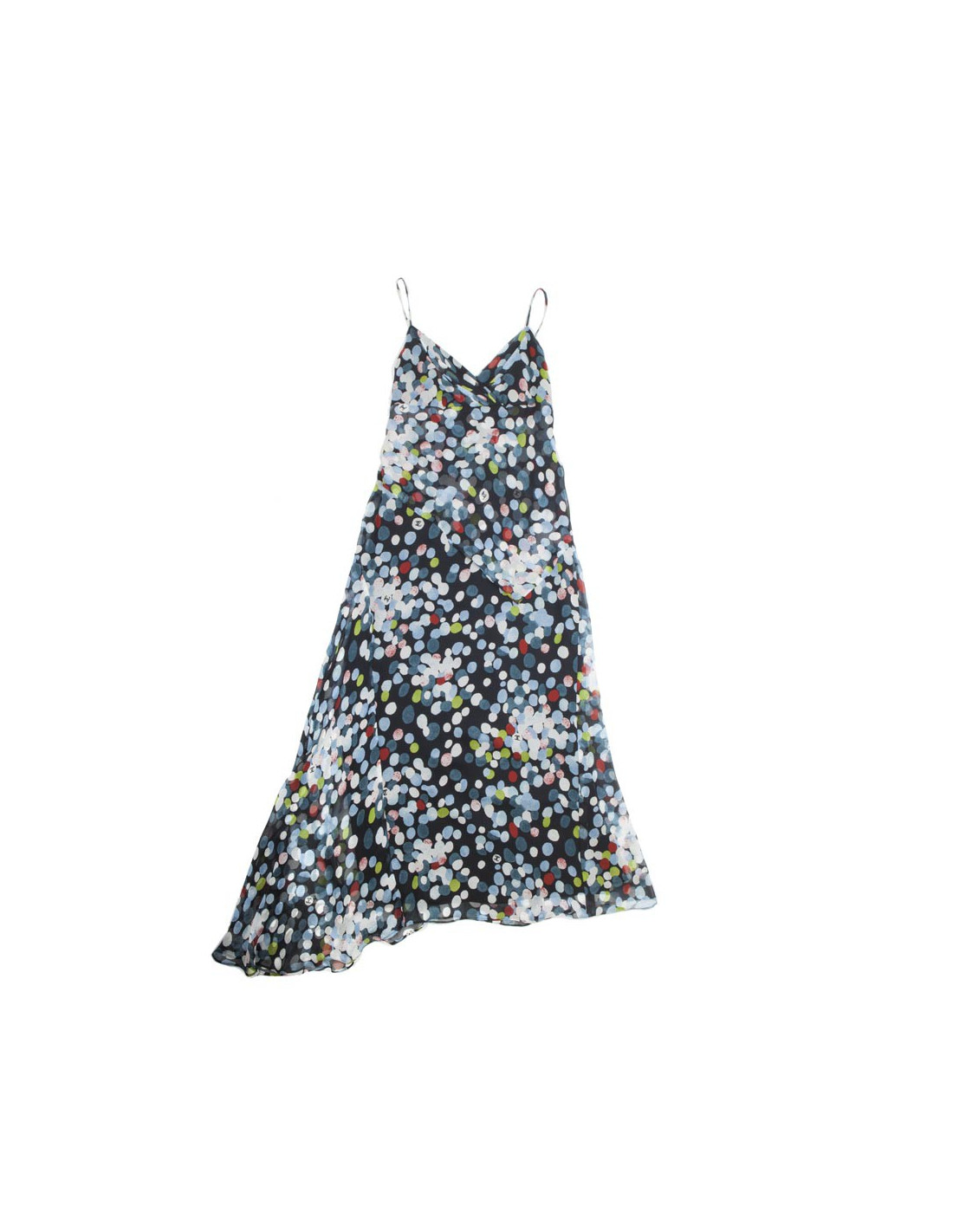 Robe du soir de la Maison Chanel bleu nuit à pois multicolores en 100 % soie. Année 97. Fermeture éclair croisée sur la poitrine, traine côté droit du bas, volant dans le dos avec crochets d'attache invisibles. Quelques sigles "CC". Doublure en soie bleu nuit.