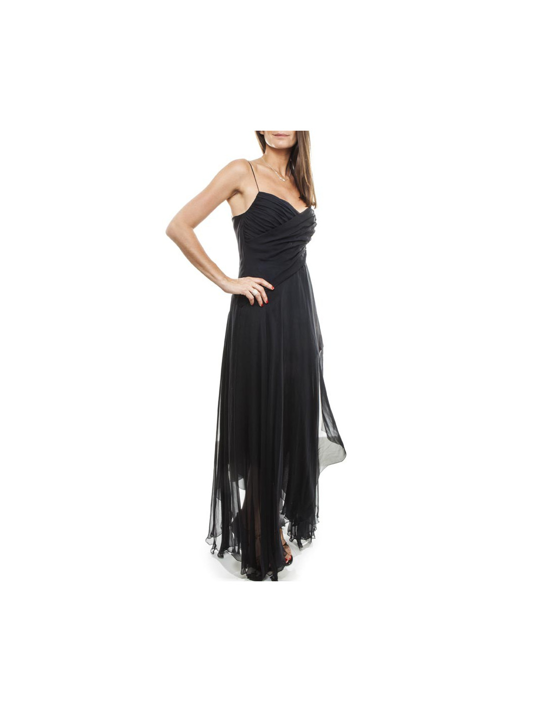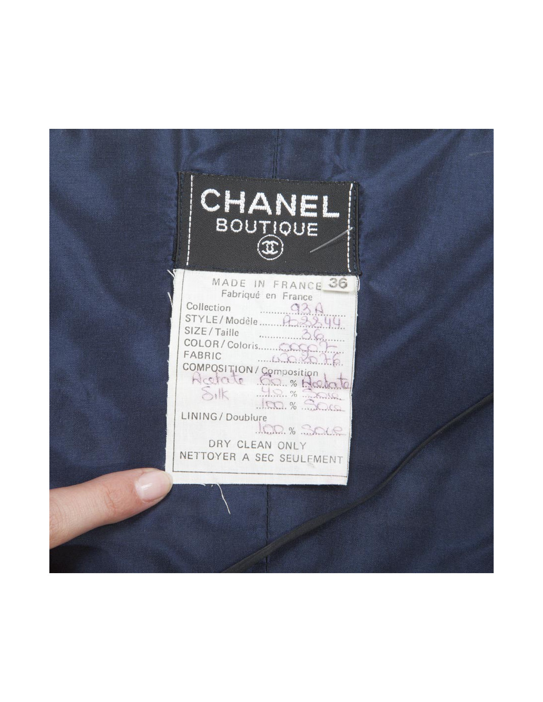 Robe du soir taille 36 EU, Chanel bleu foncé en soie. Coupe fluide, avec une fermeture éclair sur le côté. La doublure sur la poitrine est en satin moiré bleu nuit qui se prolonge par une soie fluide de même couleur. Collection Automne-Hiver 1993.