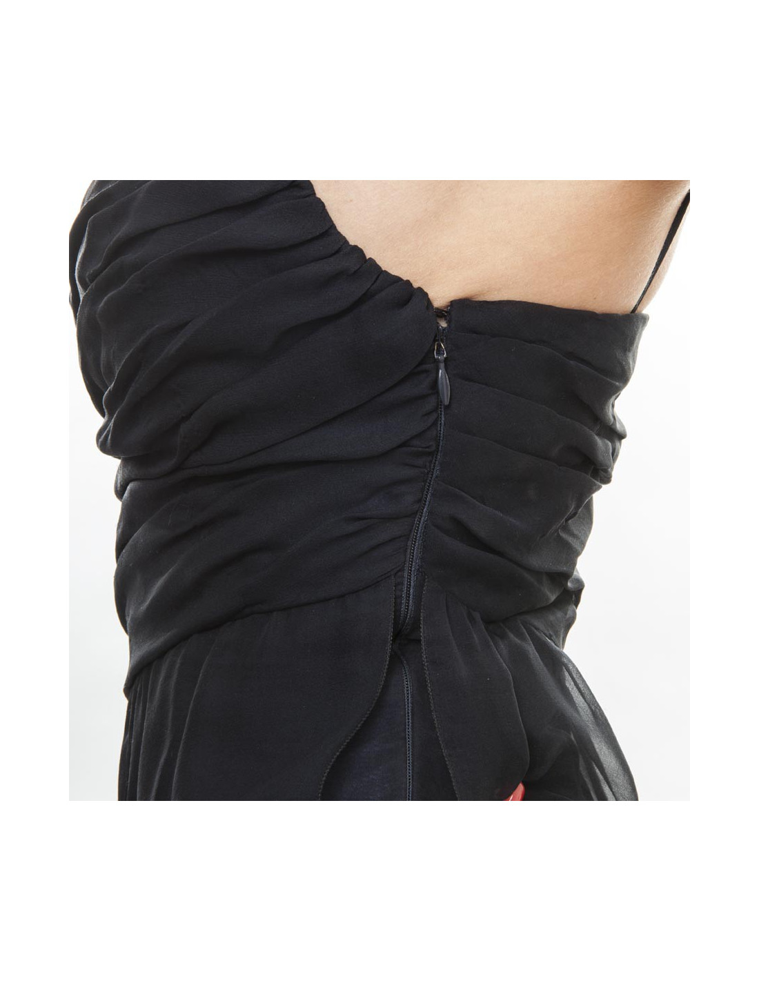 Gauche de la robe : 40 cm de long. Volants croisés sur la poitrine ainsi que sur la partie basse de façon asymétrique.