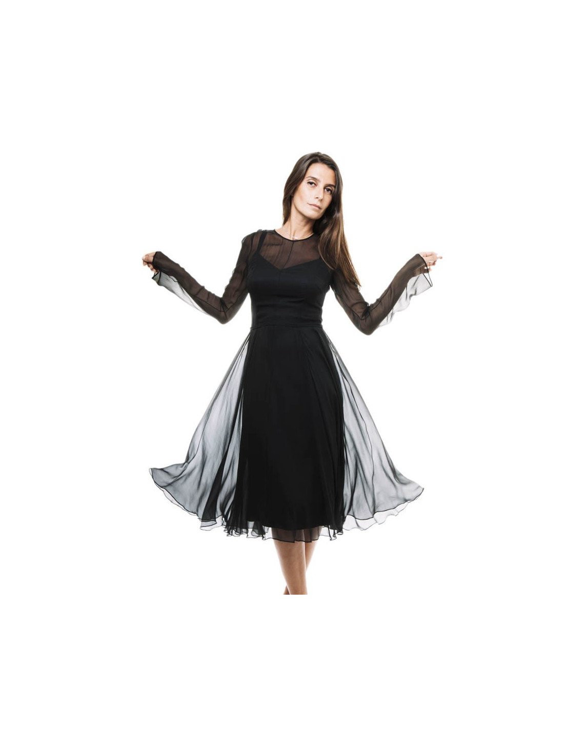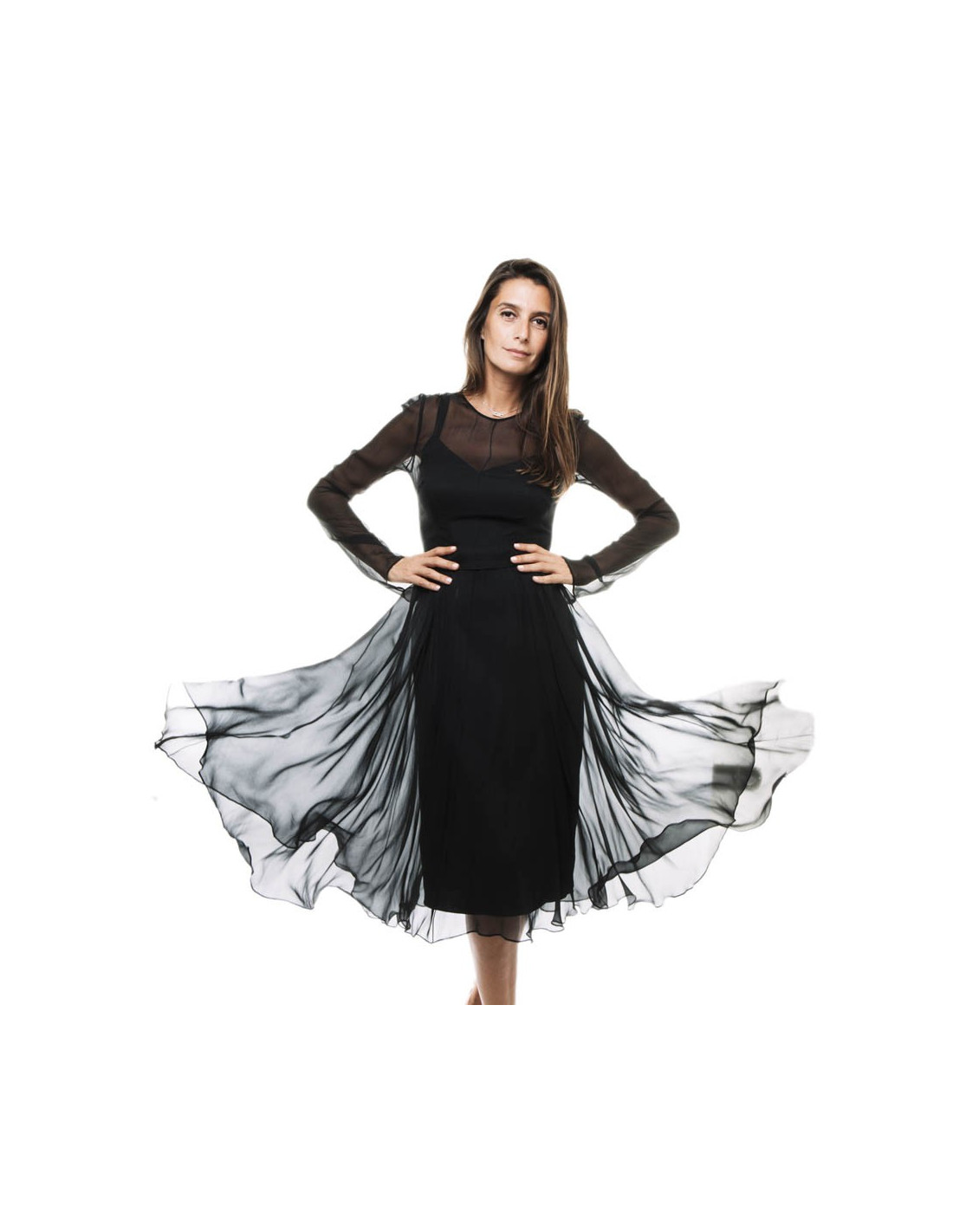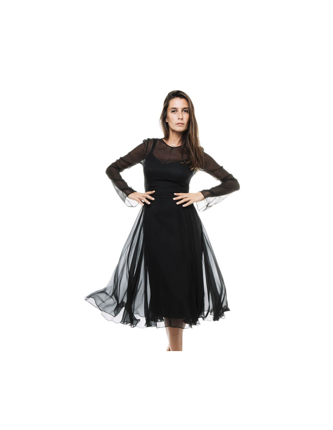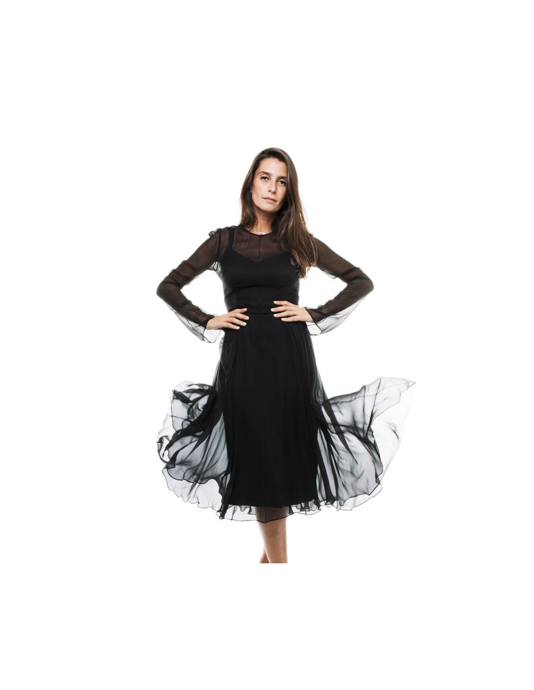 Robe de cocktail de la Maison Dolce & Gabbana en mousseline de soie noire, doublée d'un fond de robe à bretelles en satin noir. Elle se ferme a l'aide d'une fermeture éclair dans le dos. Cette robe est en très bon état. T40 IT/T36 FR.