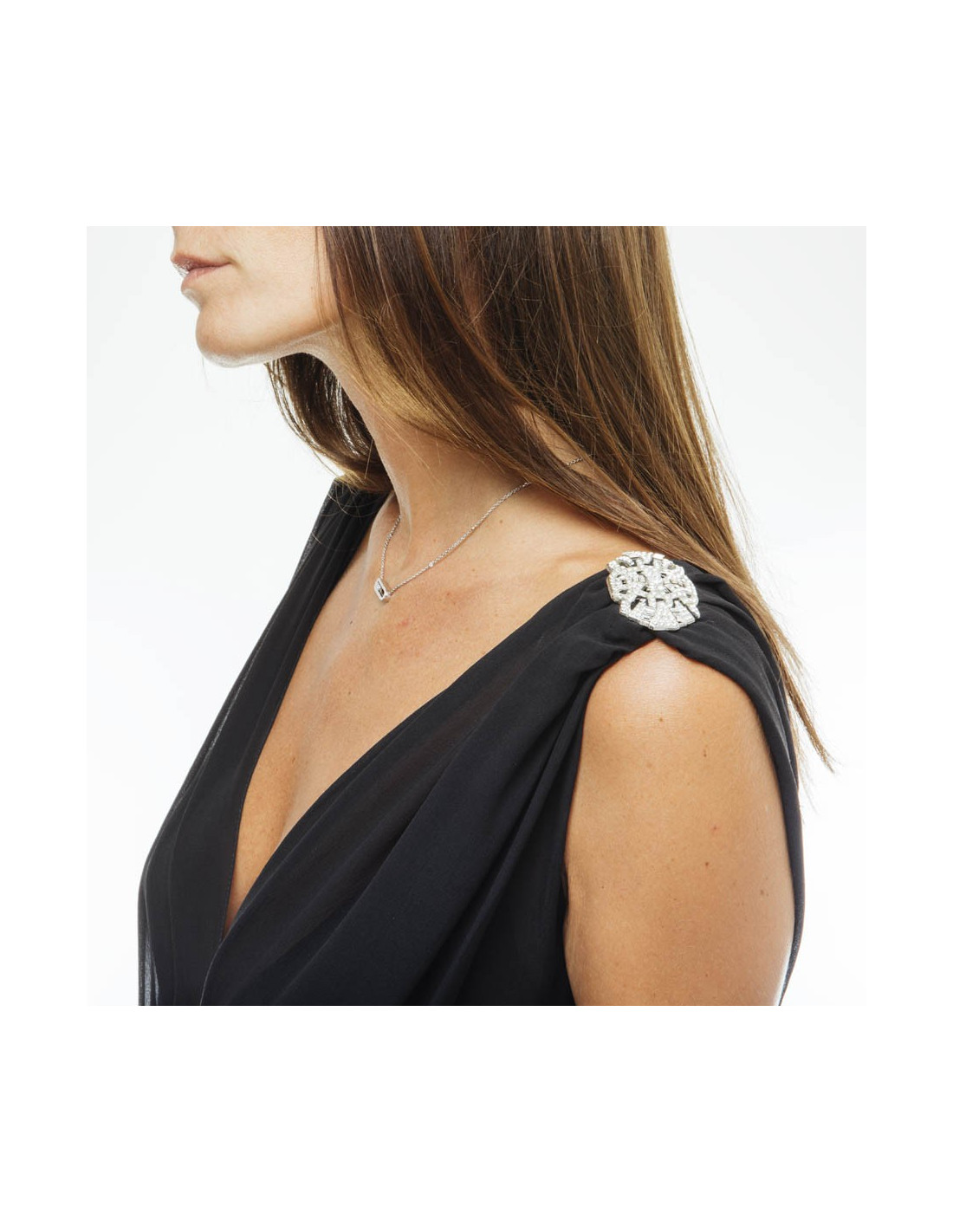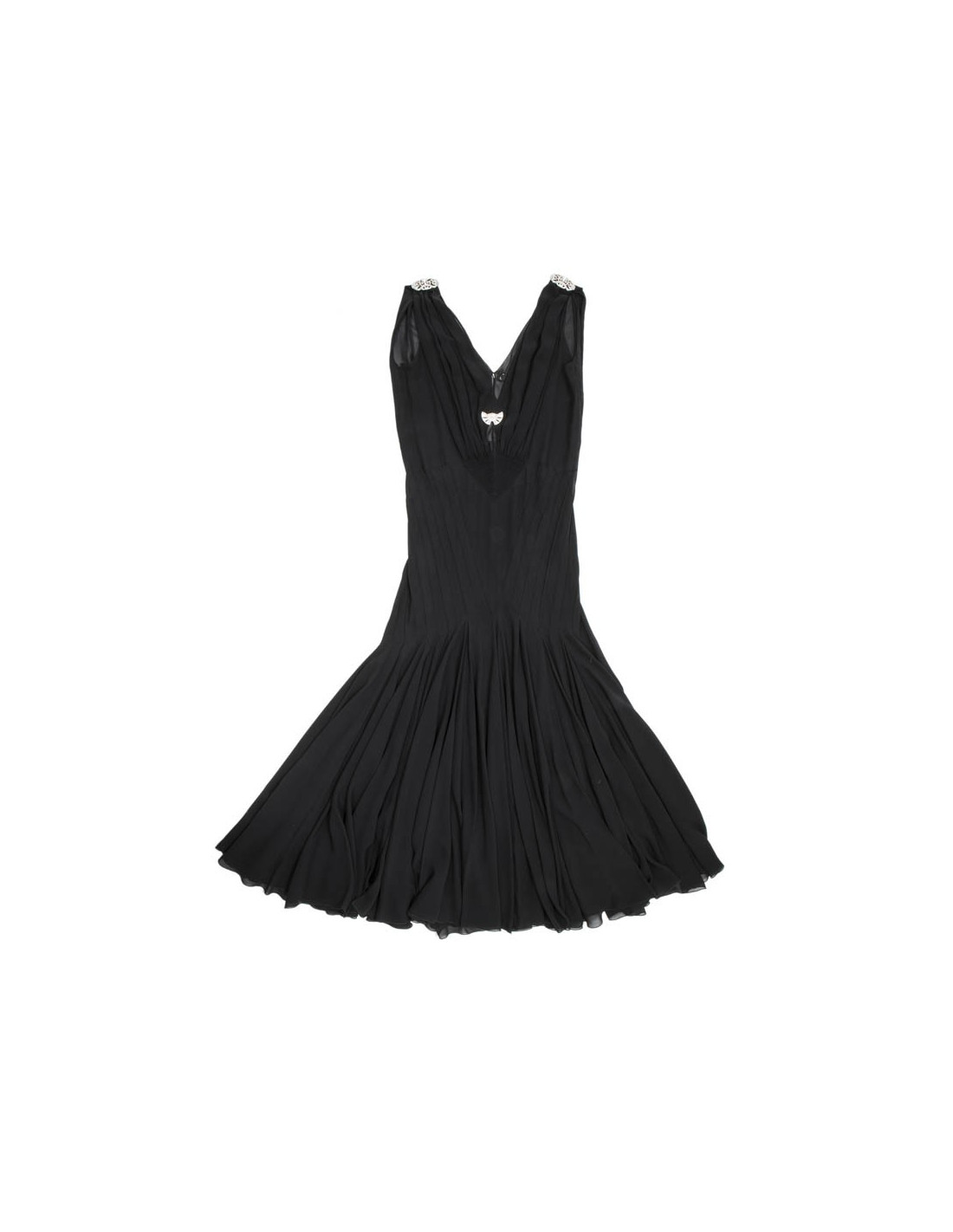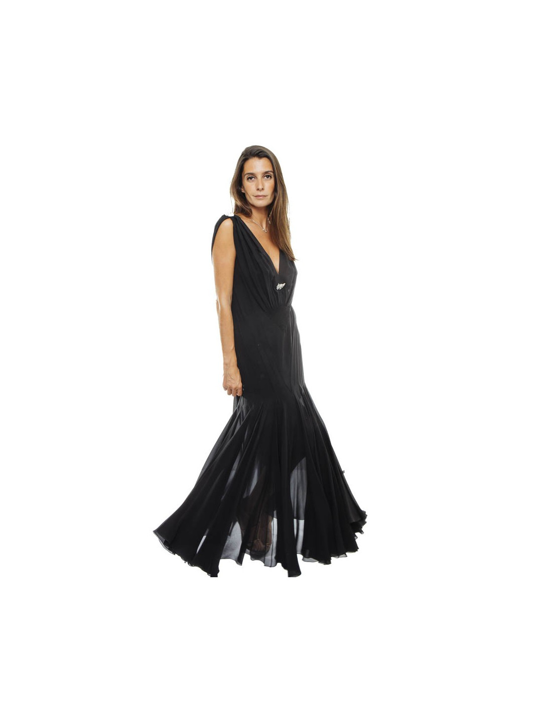 Superbe robe longue du soir Christian DIOR T 38 by John Galliano. Robe très vaporeuse et très chic !!!. Elle est ornée de 4 broches bijoux en métal argent et incrustés de brillants Swarovski, dans l'esprit art déco.