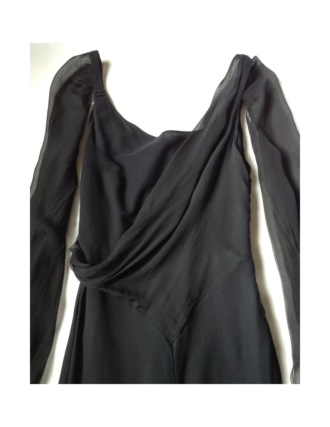 Somptueuse! Robe CHANEL T36Fr de couleur Midnight blue en mousseline, ligne près du corps, encolure bateau, sans manches, épaules agrémentées de panneaux de mousseline dont un revenant sur l'avant de la robe avec un effet drapé. CC serti de strass, sigle sur la bretelle droite. Fermeture sur le côté gauche par un long zip "Très discret".
