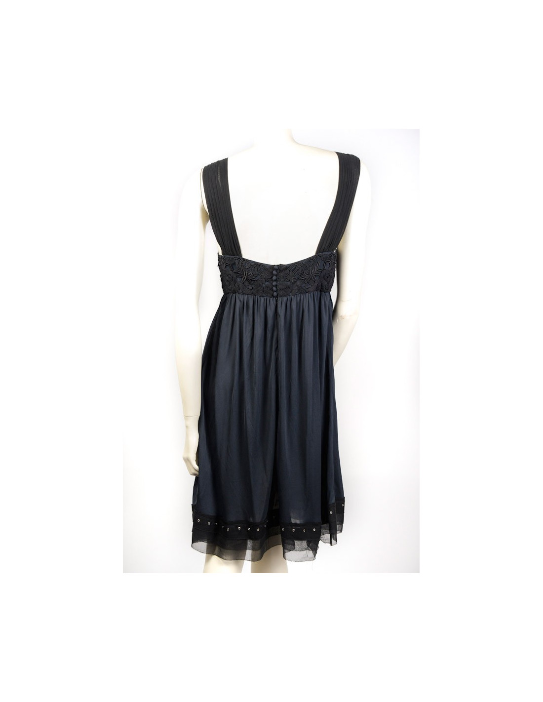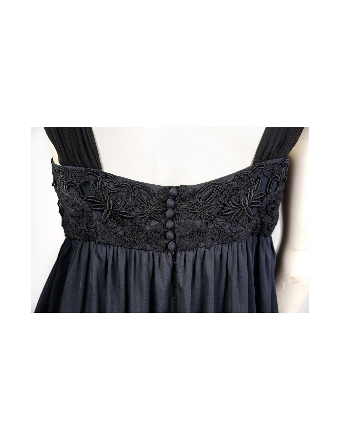 Robe Louis Vuitton T 38 fr en viscose noire fluide, le haut est en dentelle noire et les bretelles plissées larges en soie noire. Fermeture à l'arrière par 6 boutons recouverts de soie et boutons pressions.