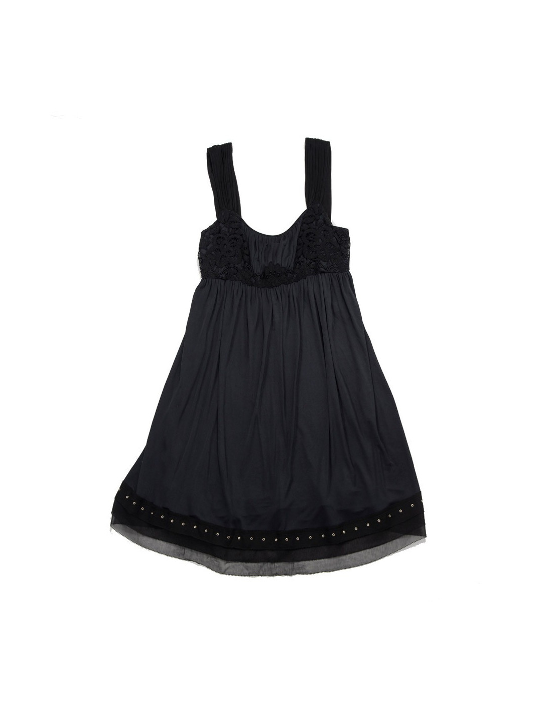 En bas de la robe, trois rangées de soie noire dont une est cloutée or.