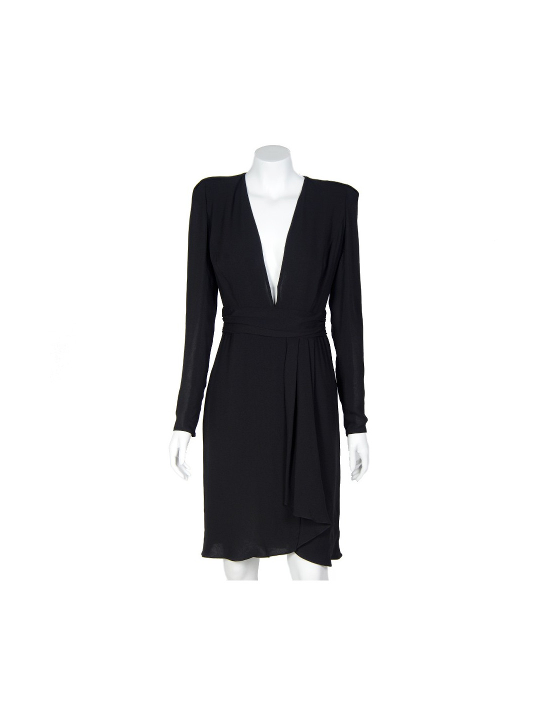 Robe du soir manches longues Guy Laroche en mousseline de soie noire. Taille 38. Col V. Ceinture avec des fronces. La partie basse de la robe est portefeuille. Fermeture zippée dans le dos ainsi que sur le bout des manches. Epaulettes. En très bon état.