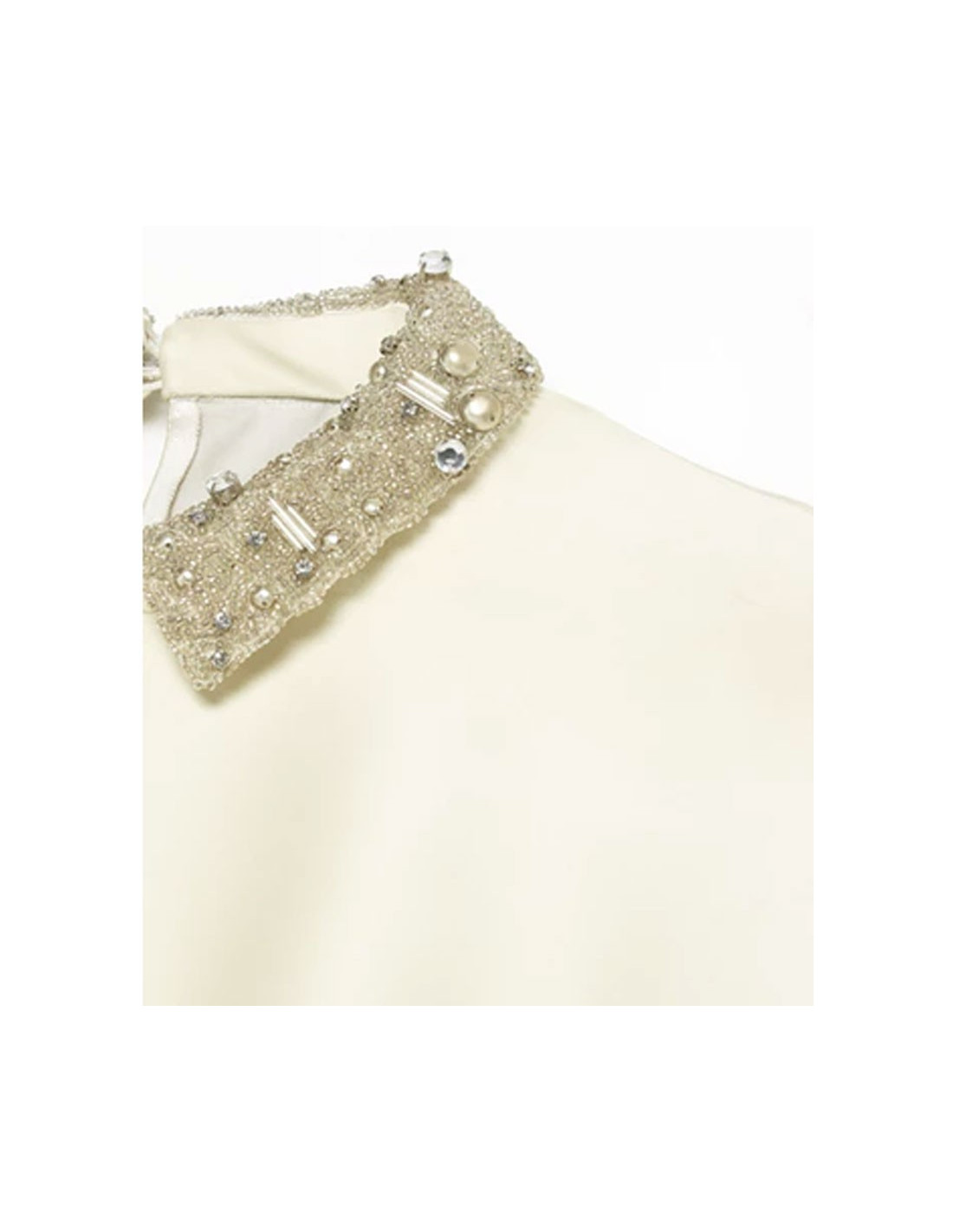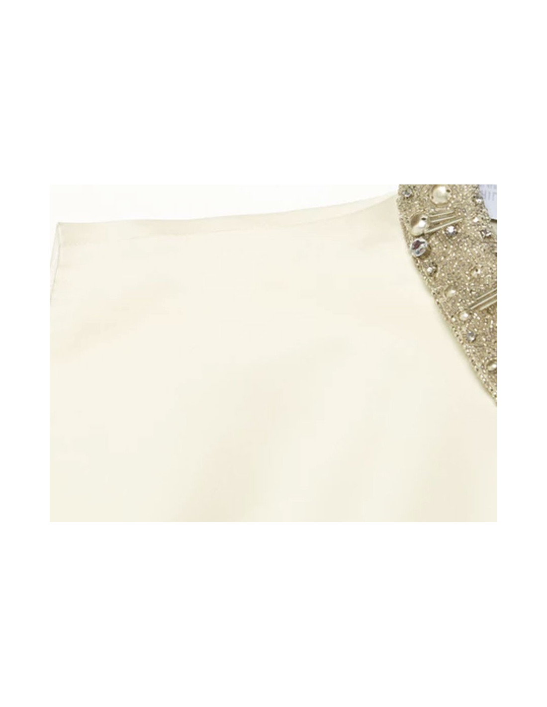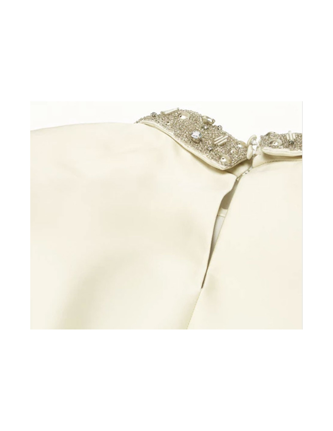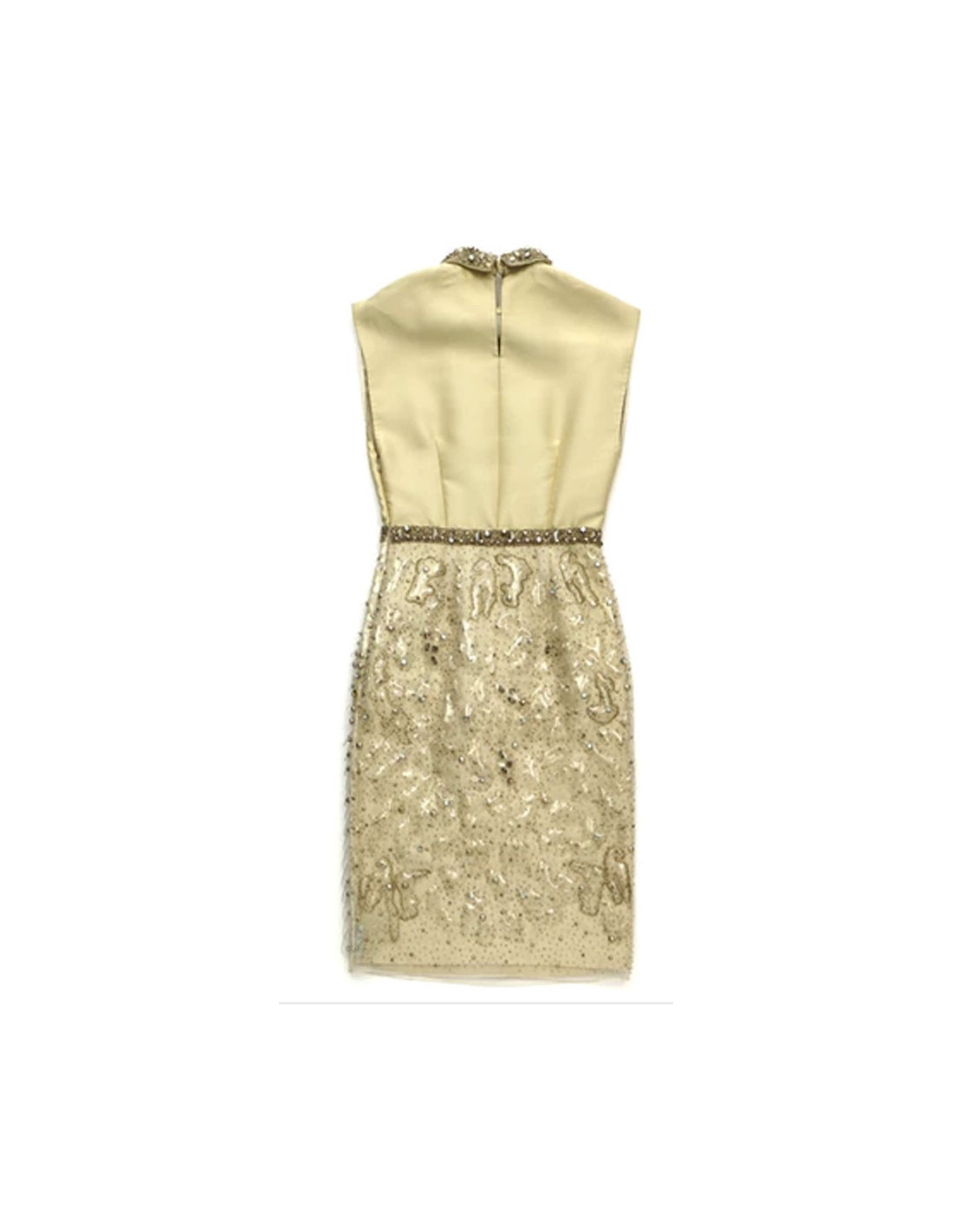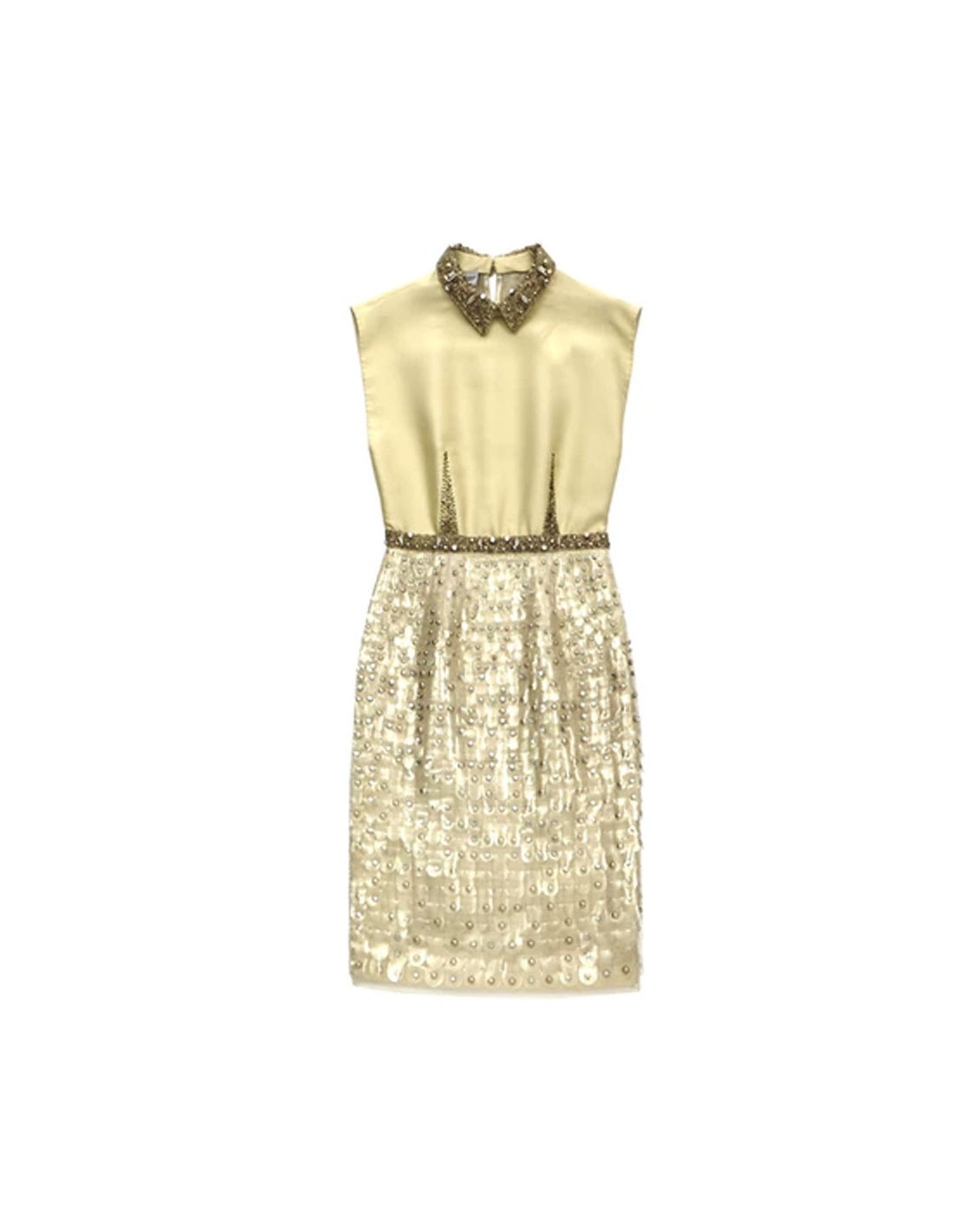 Robe de cocktail ou de soirée T40IT (correspond à un 36FR) Philosophy par Alberta Ferretti sans manche en satin ivoire. Le col et la taille sont brodés de strass et de perles en métal et argentés. La jupe est recouverte d'écailles en plastique transparent, clous et strass. La robe se ferme par un zip latérale invisible.