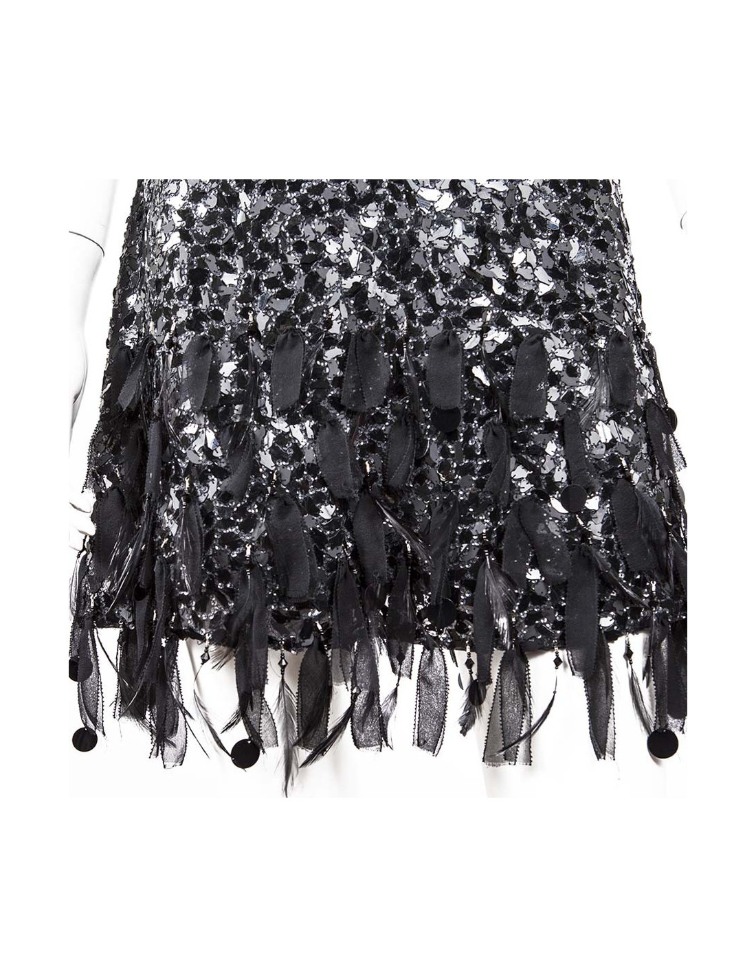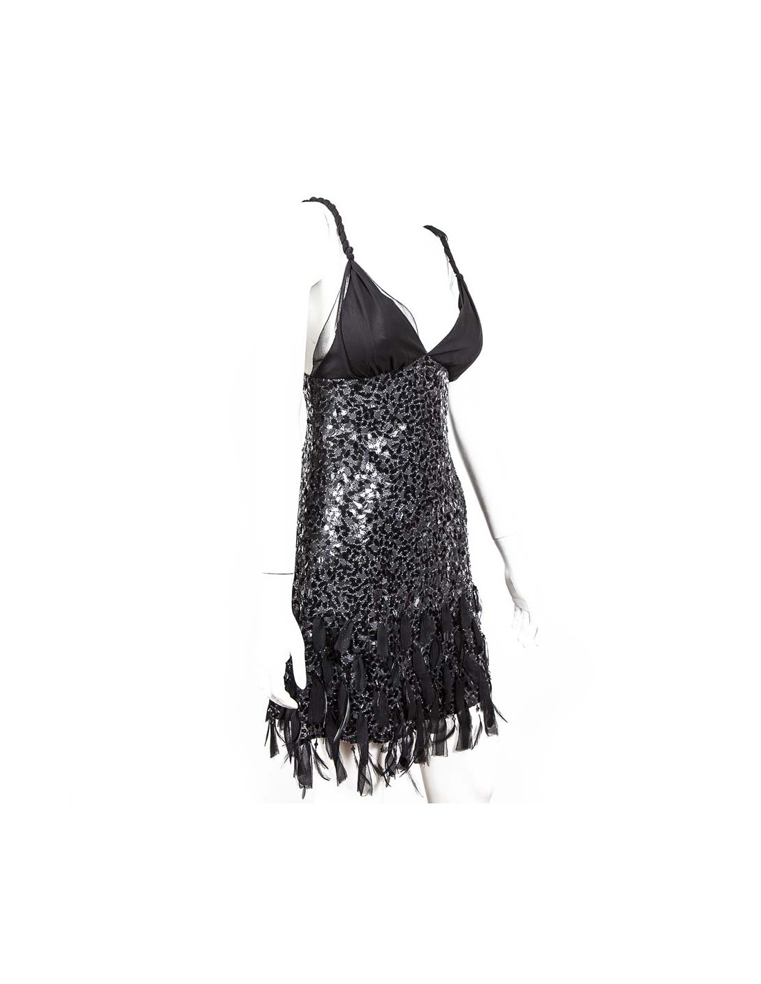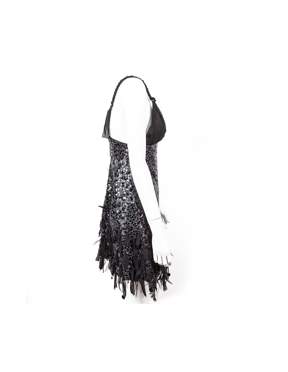 Superbe robe de cocktail Jenny Packham en voile, soie noire recouverte de sequins noirs et plumes. La poitrine est renforcée par de la mousse sous le voile.