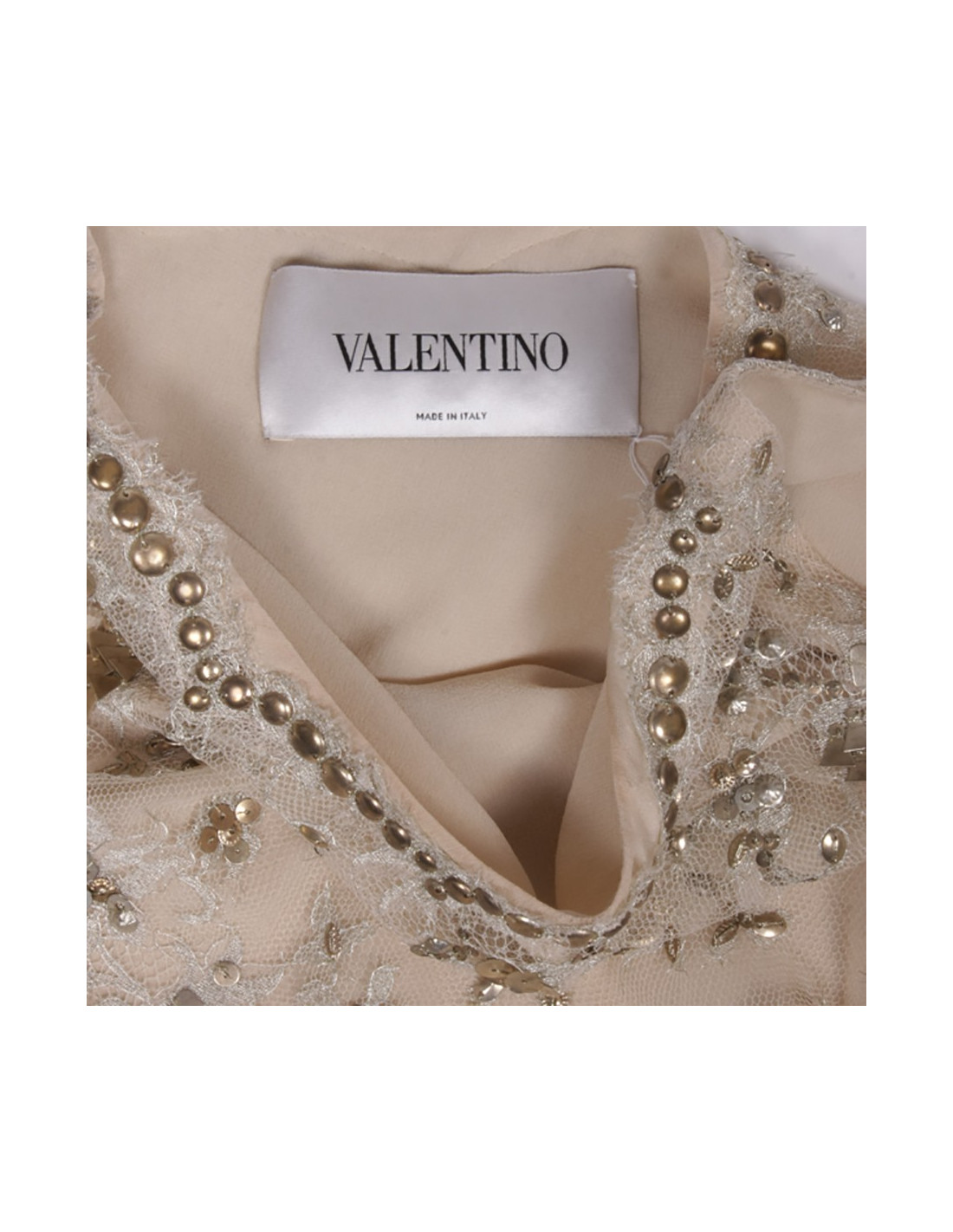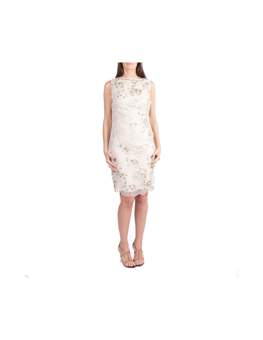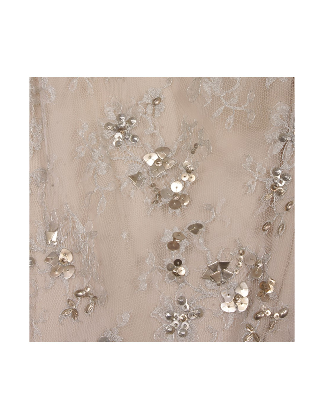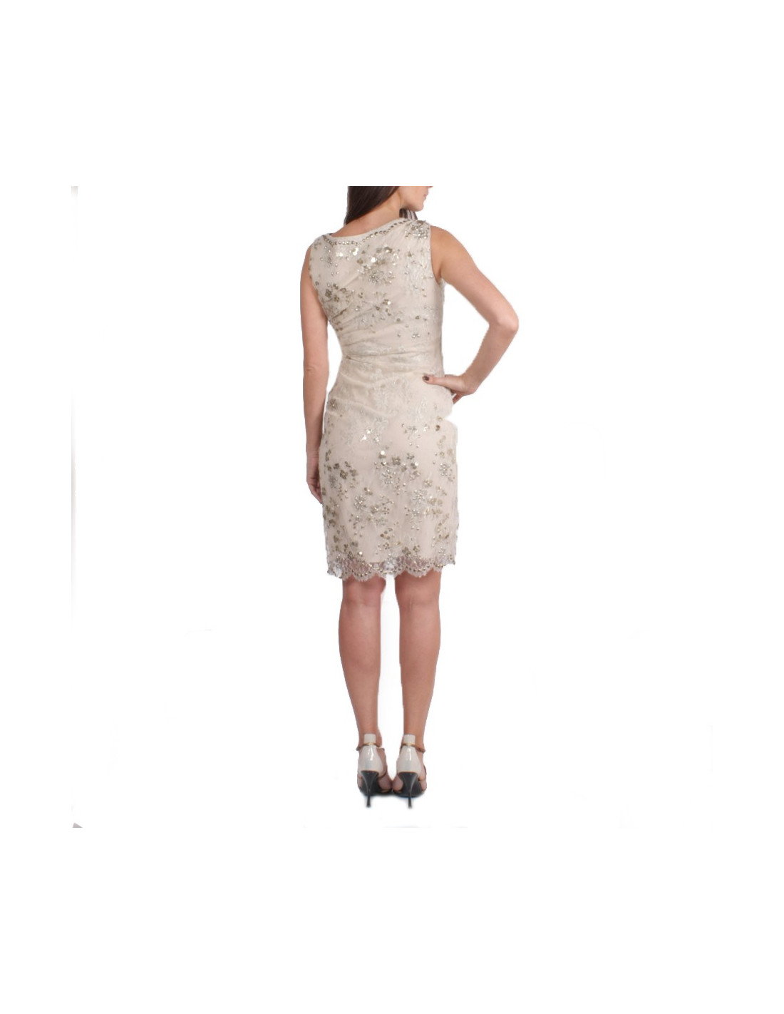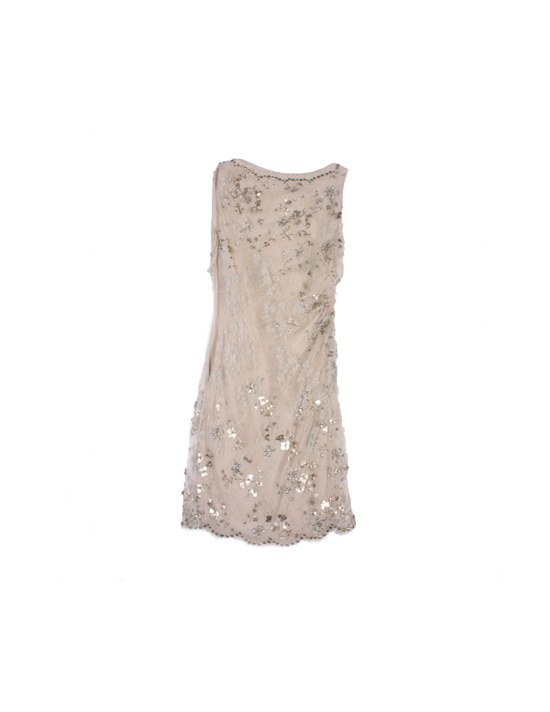 Elégante robe de cocktail VALENTINO sans manches en dentelle argentée brodée de sequins métalliques doublée (2 fois) de mousseline de soie couleur beige, drapée sur le côté gauche.