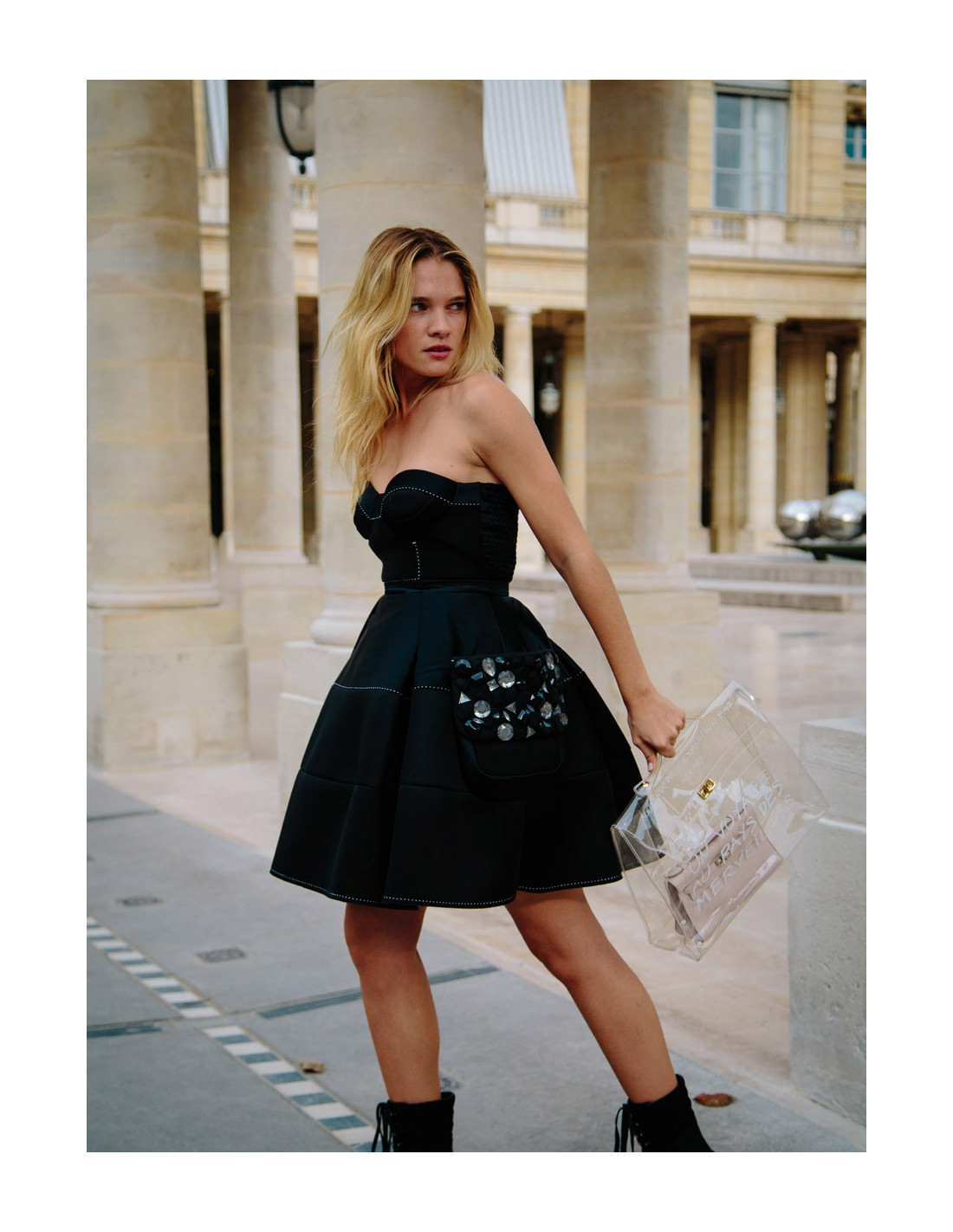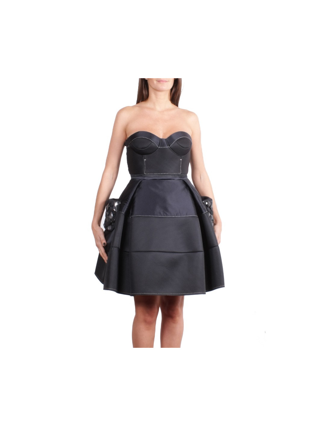 C'est une robe bustier surpiquée de blanc, jupe corole avec de grandes poches plaquées sur les côtés incrustées de pierres.
