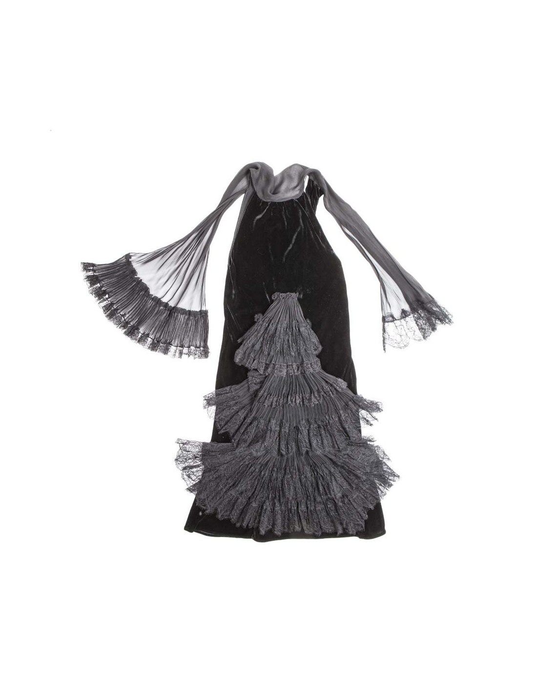 Exceptionnelle robe de cocktail/soir JEAN PAUL GAULTIER en velours de soie noir, emmanchure américaine avec un long col en mousseline de soie et dentelles Chantilly se noue dans le dos.