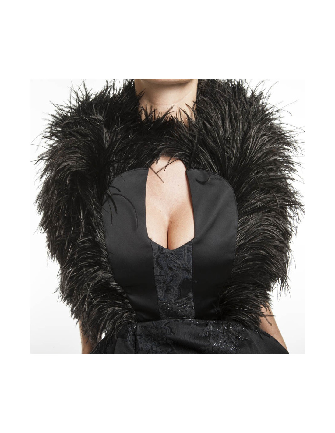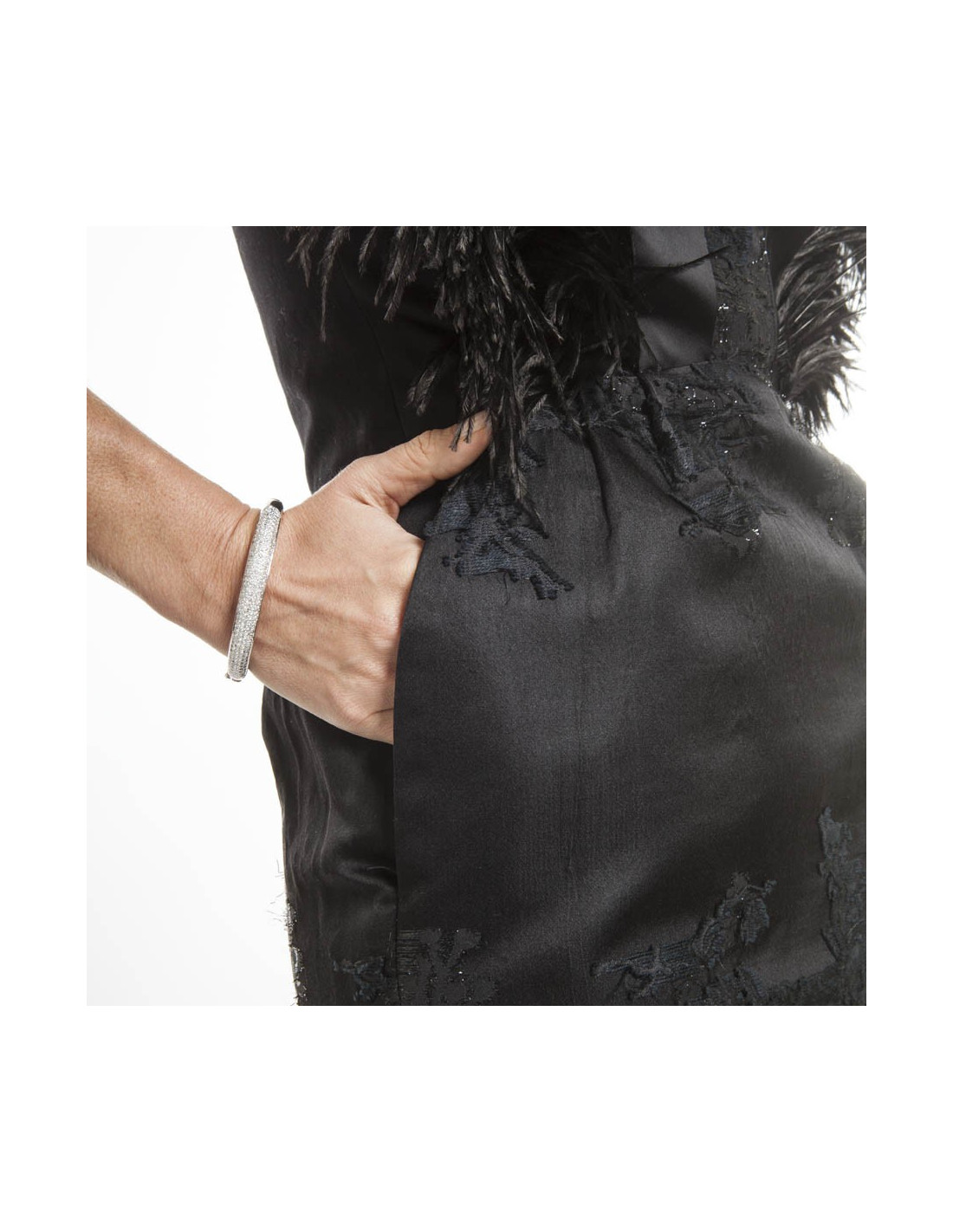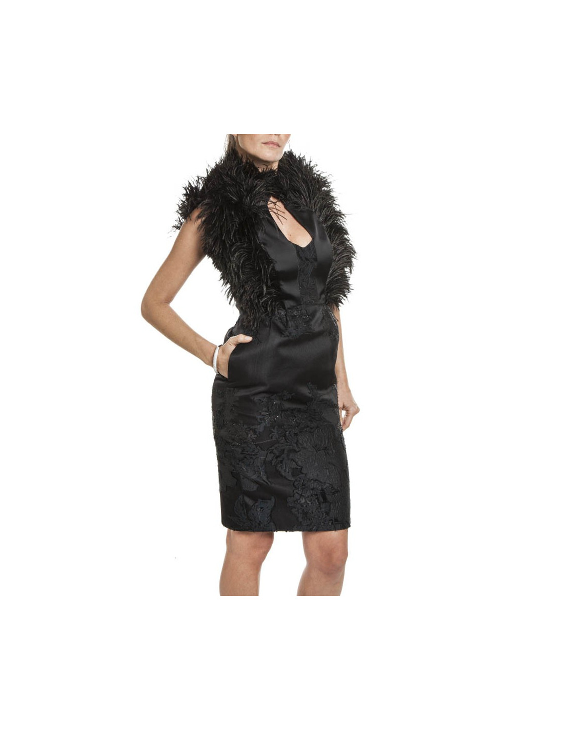 Magnifique robe de cocktail/soir MAXIME SIMOENS en damas et satin noir avec des découpes sur le buste, brodée de fines plumes noires.