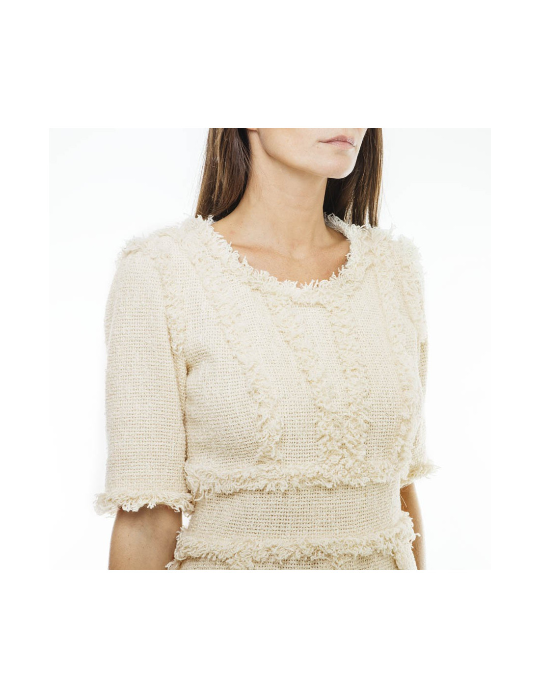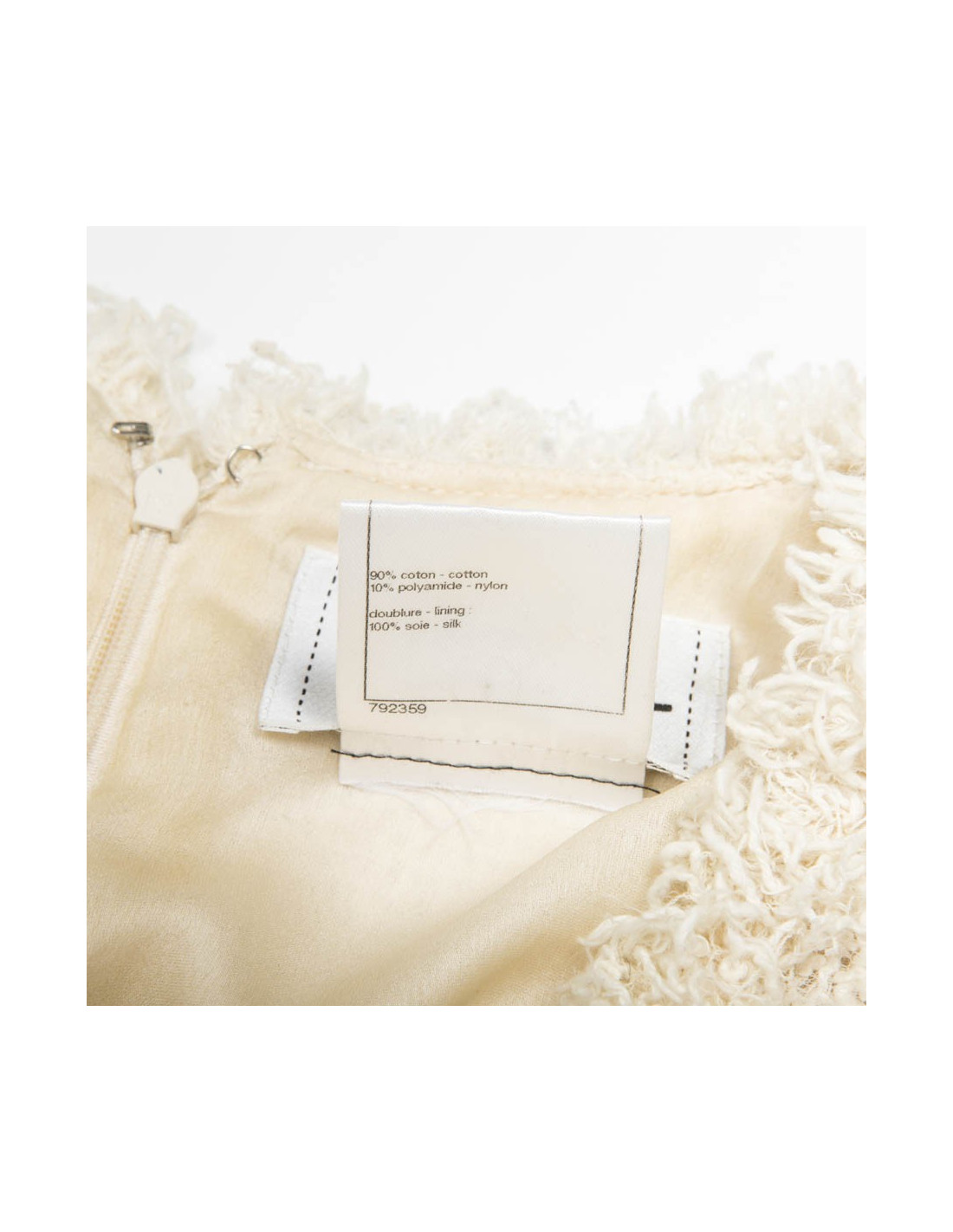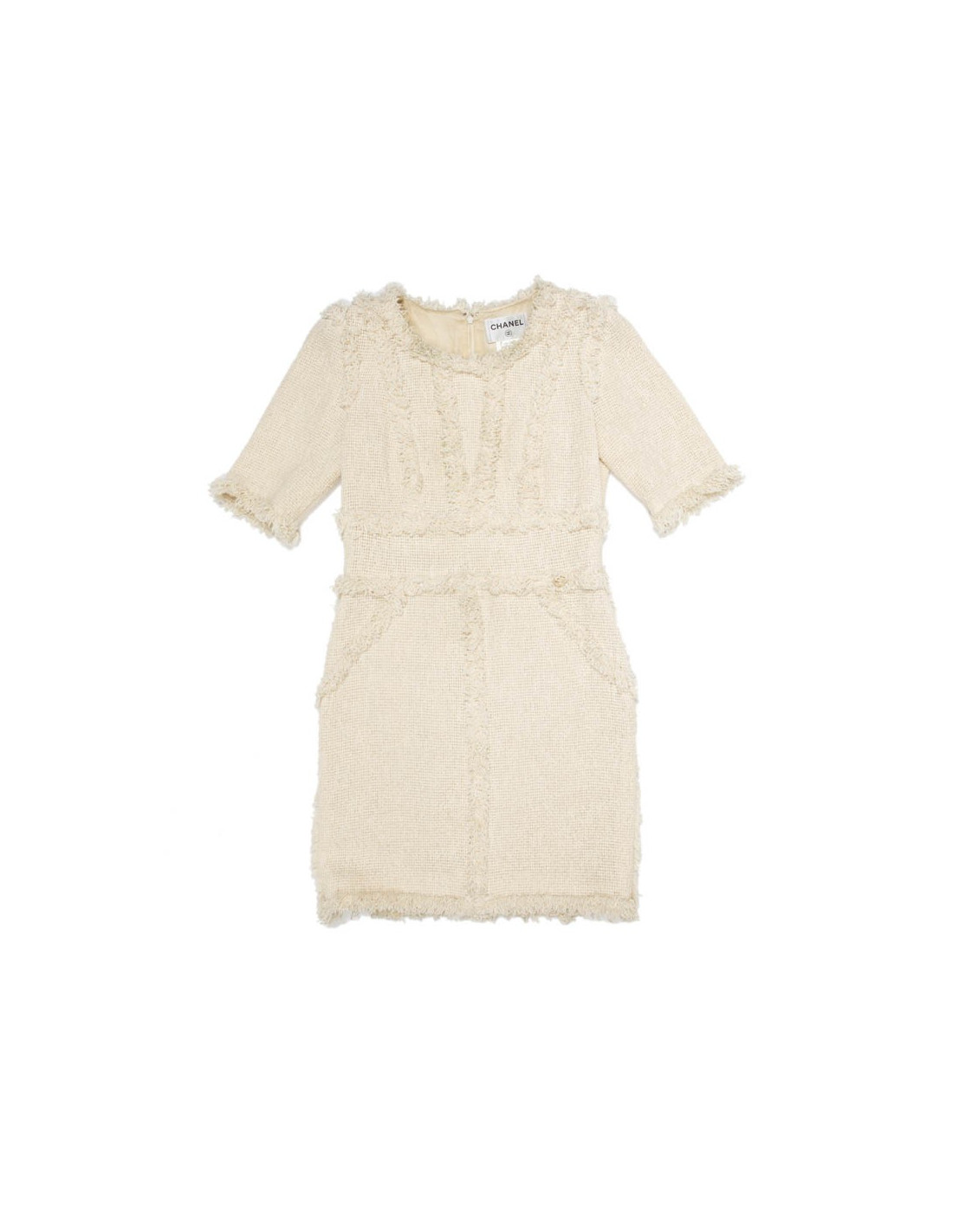 Robe Chanel T 38 FR en tweed beige. Elle est coupée près du corps et est marquée à la taille. Fermeture éclair le long du dos : 60 cm. La doublure est en soie beige.