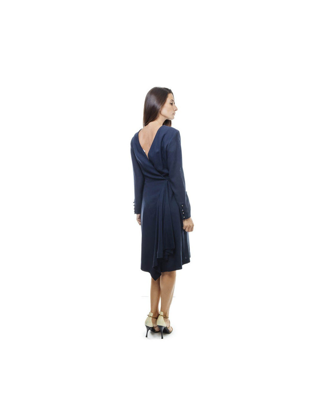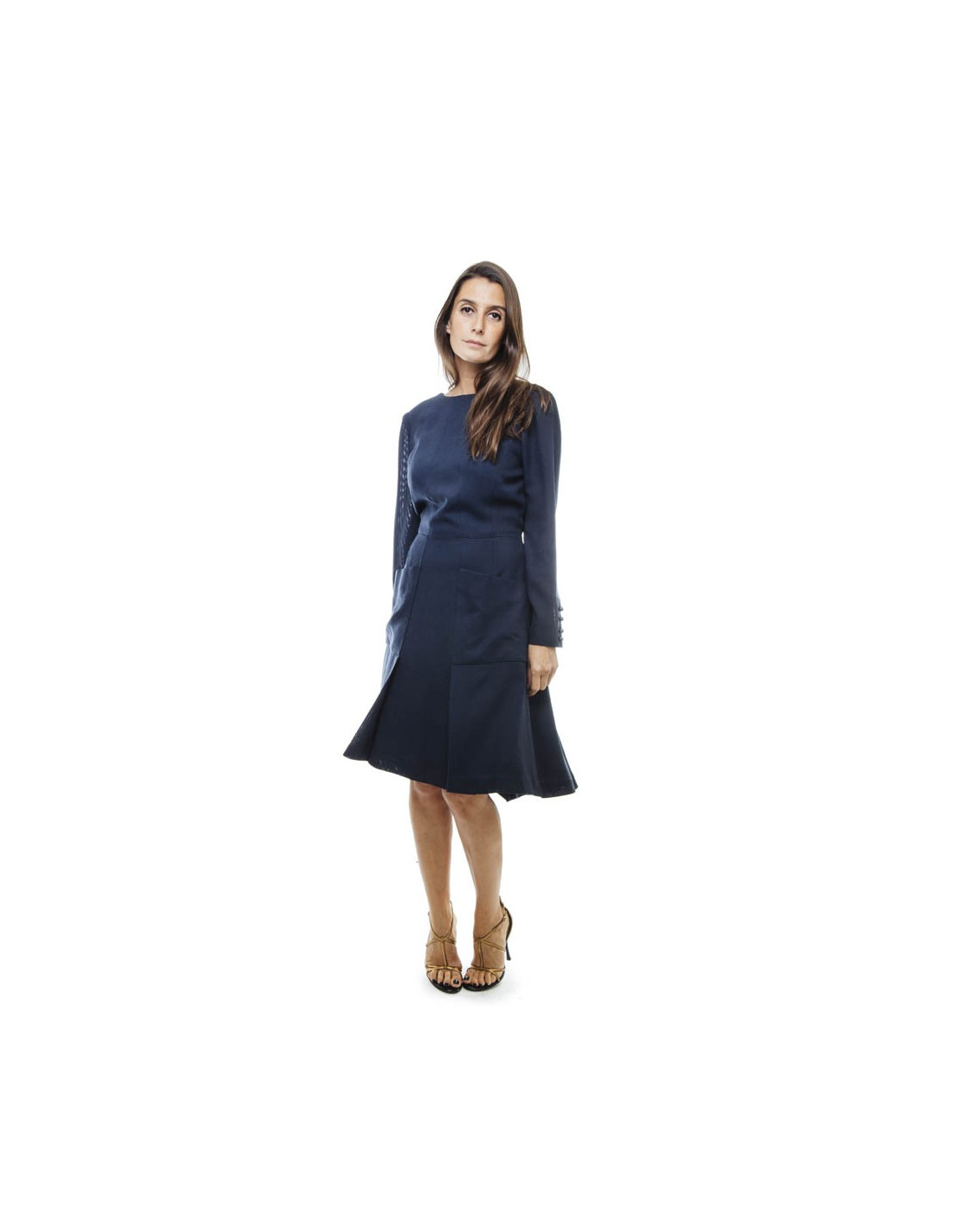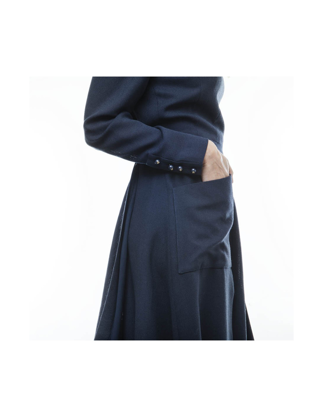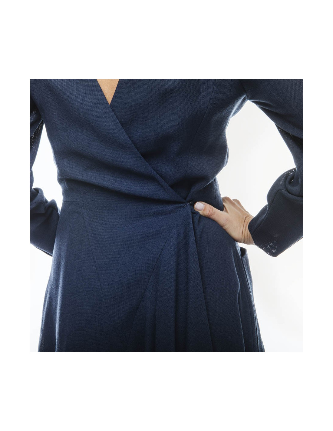 Robe portefeuille avec 2 larges poches Chanel bleue. Elle correspond à une taille 38/40 (absence d'étiquette de taille et de matière). Elle se ferme à l'avant par des crochets invisibles. Le long des poignets 4 boutons en forme de perle siglés "CC" dorés. Elle est doublée de soie bleu marine.