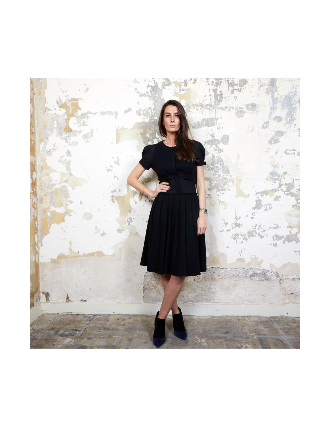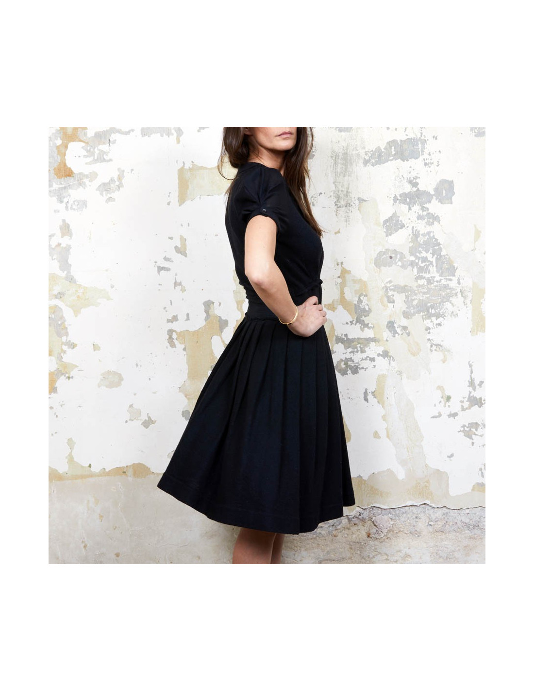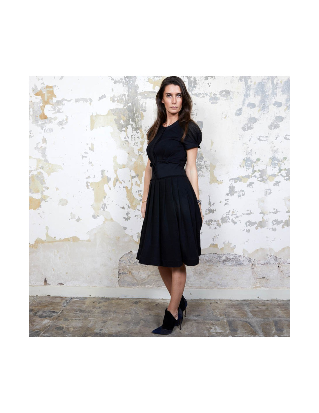 Robe à manches courtes fermées par un bouton, Viktor & Rolf Taille 40IT/36 FR cintrée à la taille puis plissée et évasée. 100% Laine. Elle est doublée. Elle a sur le côté une longue fermeture éclair de 38 cm. Made in Italy. En très bon état.