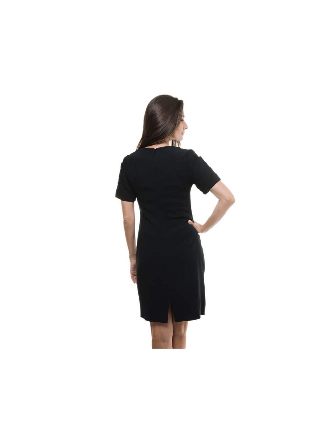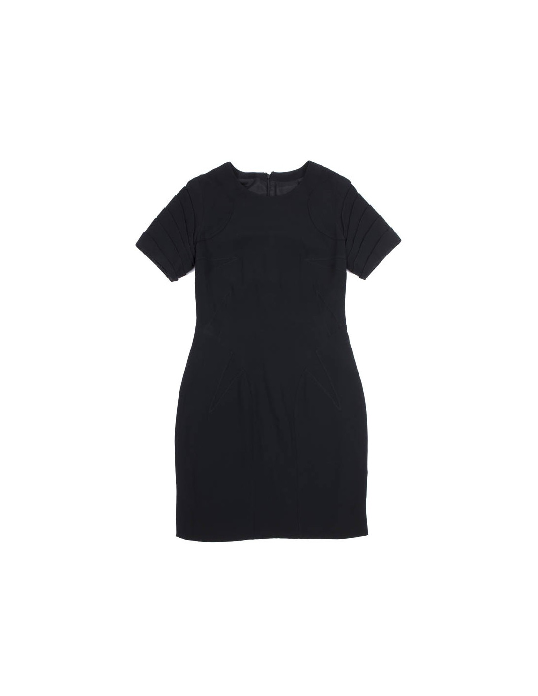 Robe courte taille 38, de la maison Christian Dior (par John Galliano) en crêpe Georgette noir, plusieurs découpes sur la poitrine et les hanches. Les manches courtes avec un éventail de plis vers le haut.