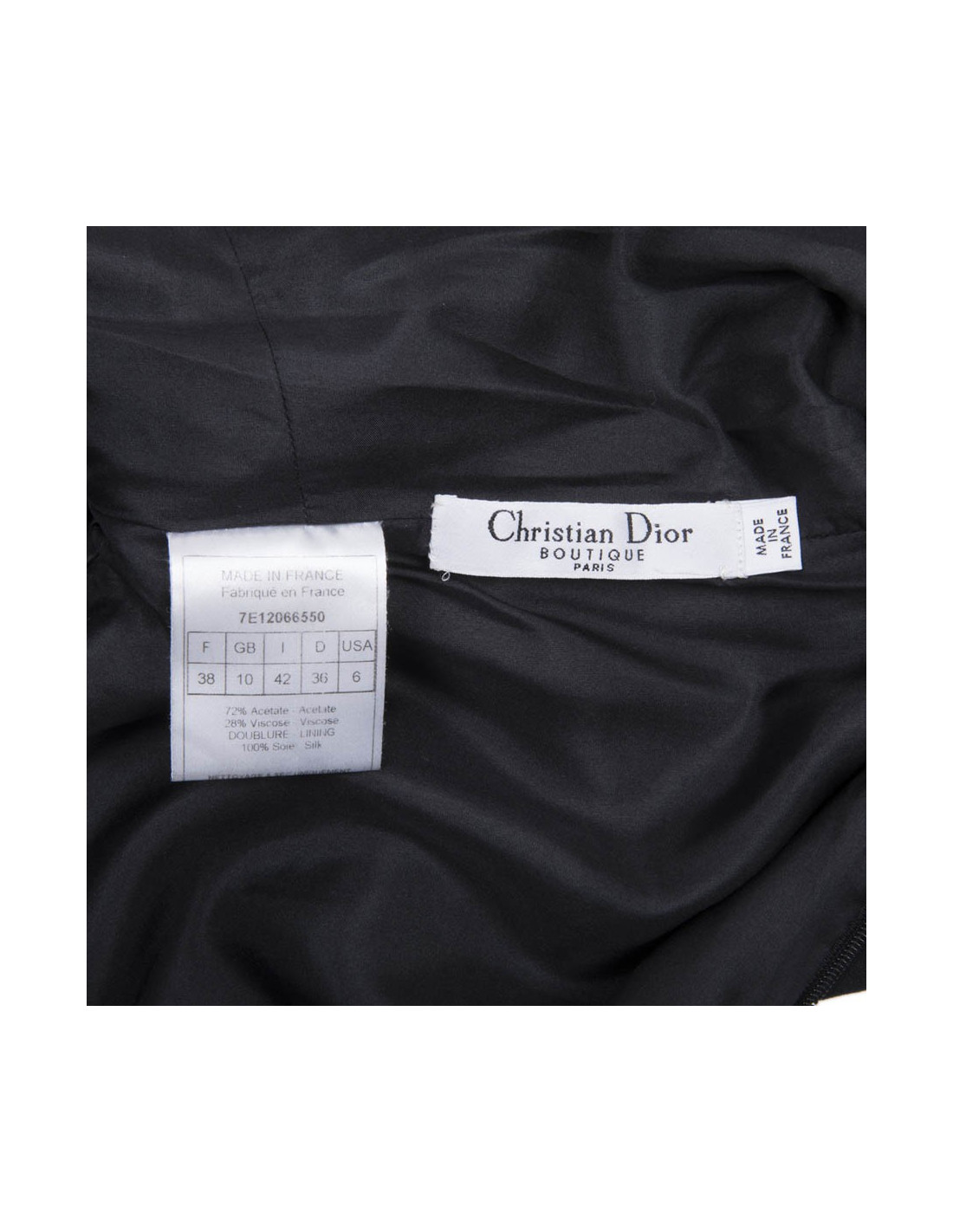 La doublure est en satin de soie noire. Cette robe se ferme a l'aide d'une fermeture éclair dans le dos.