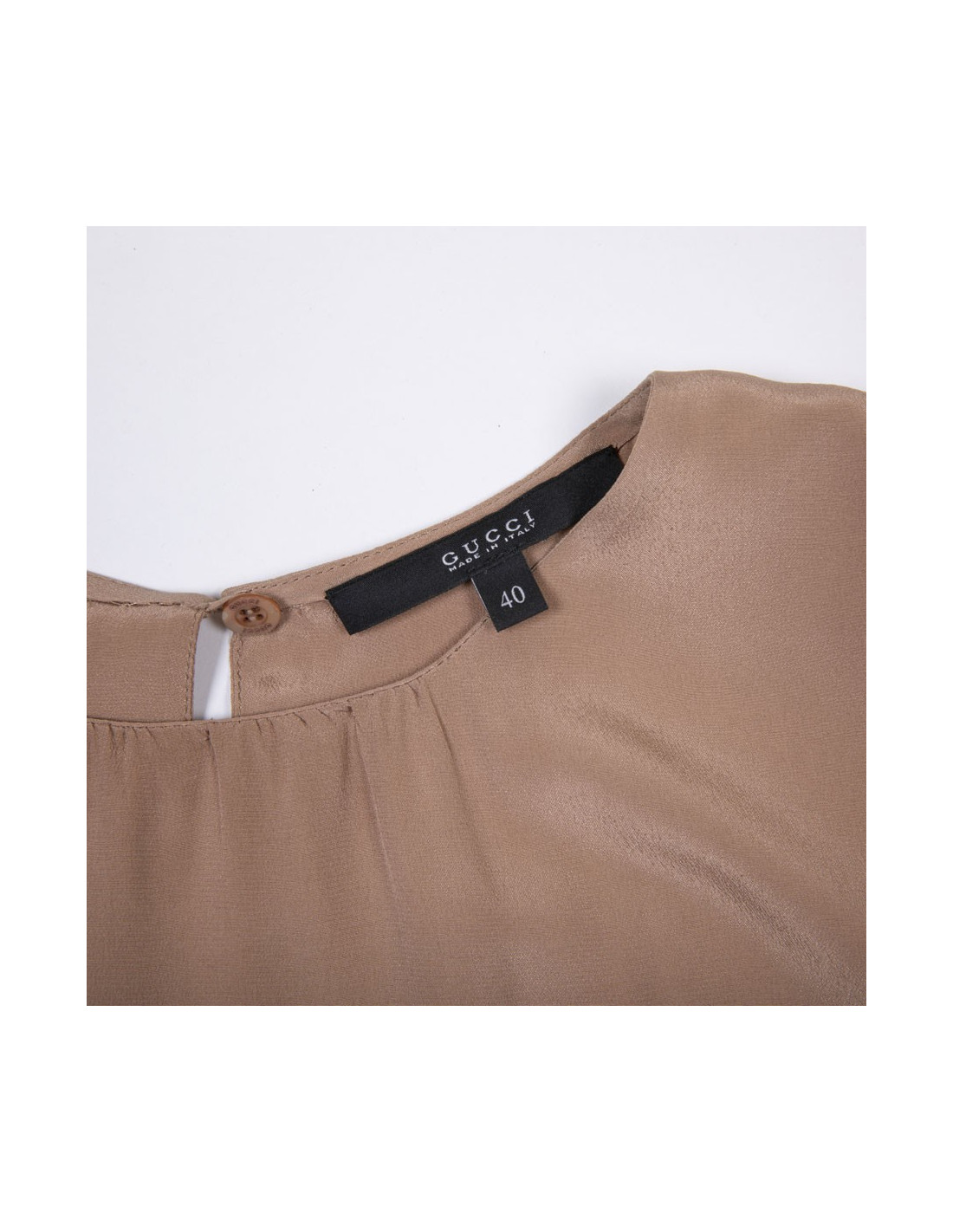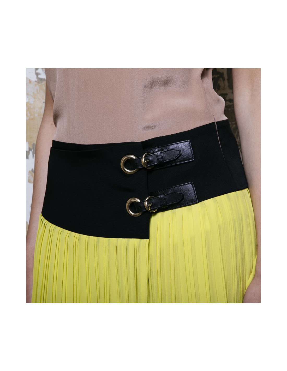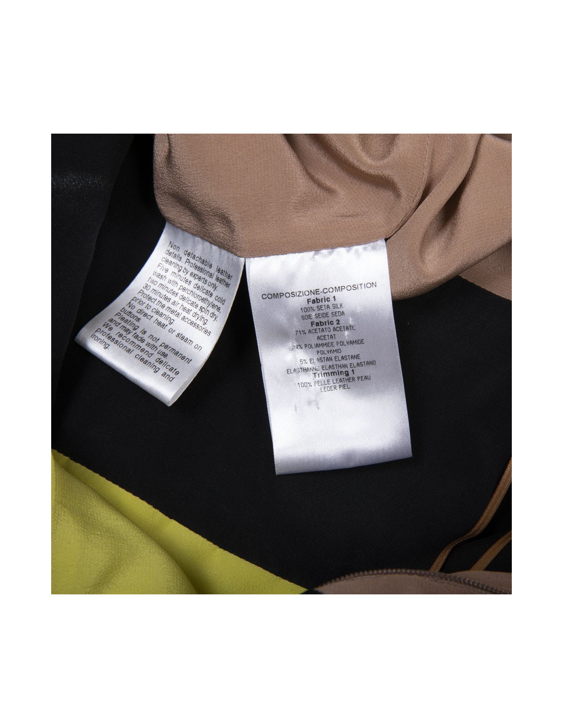 Robe Gucci en soie camel, noire et jaune. Taille 40 it / 36 FR. Robe 3 trous façon ensemble jupe kilt et top. Deux boucles en cuir noir et métal doré sur les hanches. Fente sur le haut du dos avec bouton. Fermeture à glissière sur le côté gauche. Made in Italy. Très bon état. Micro trace grise sur la soie camel.