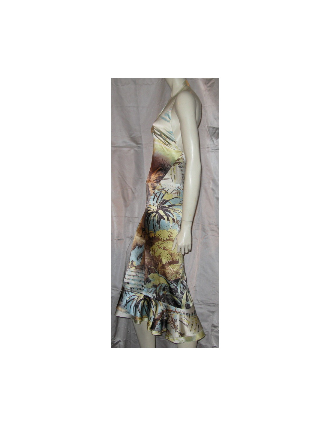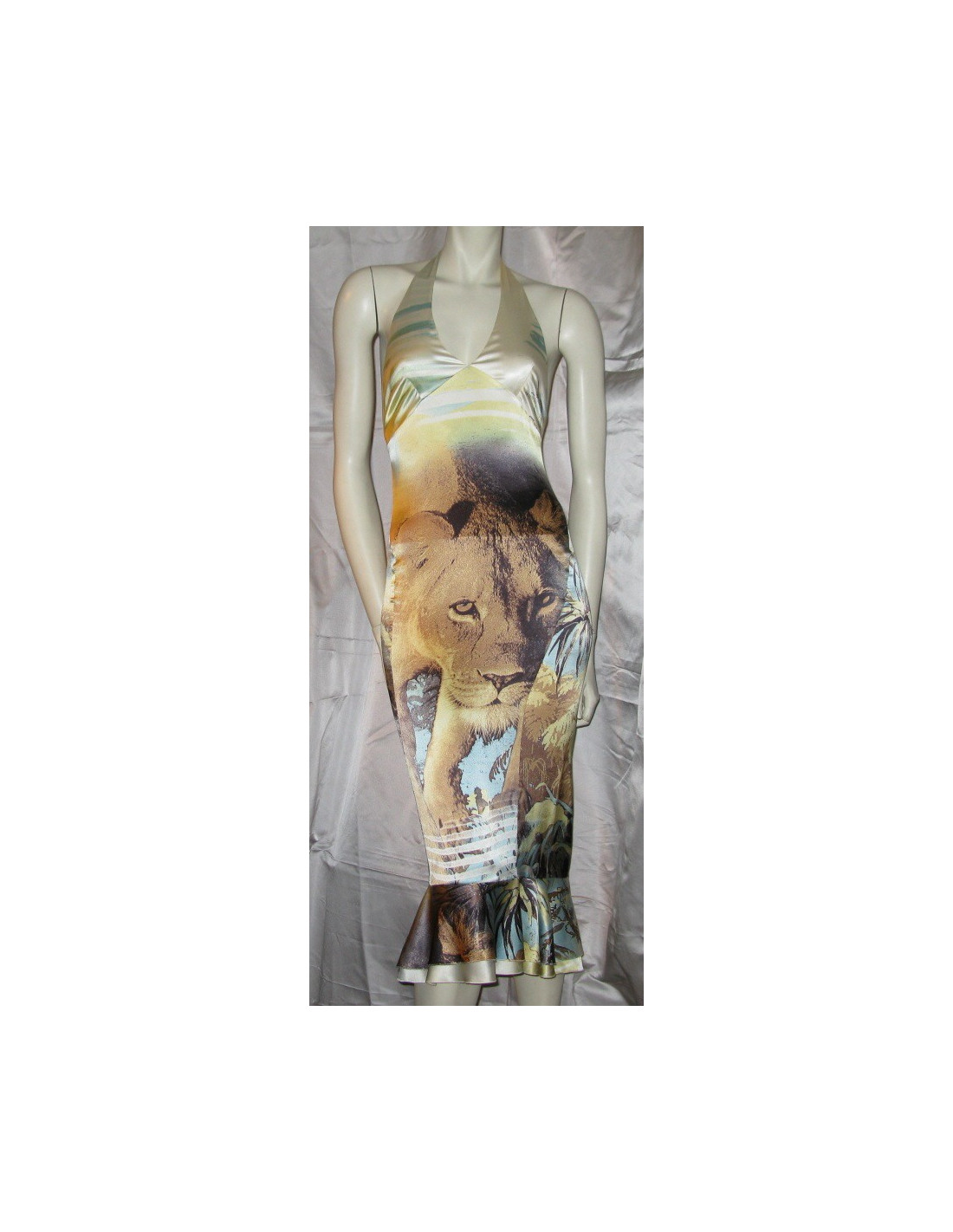 Superbe robe ROBERTO CAVALLI taille XS en soie imprimée. Le motif représente un fauve dans la savane. La robe se ferme à l'aide d'une fermeture zippée dans le dos.