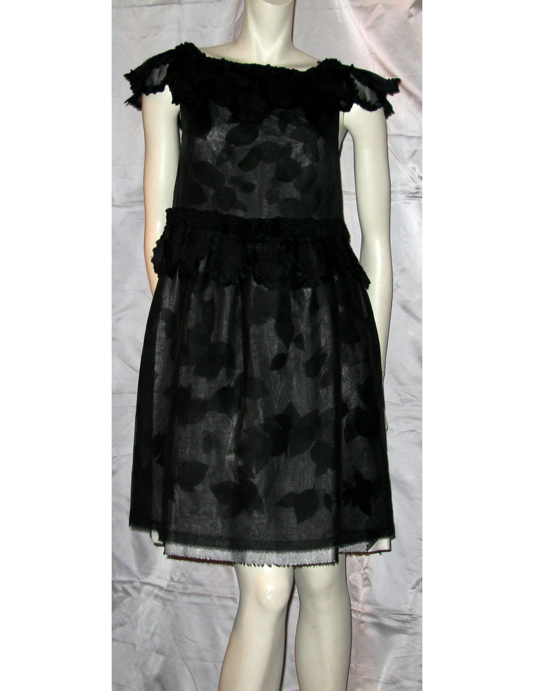 Sublime robe CHANEL en soie et mousseline de soie noire. La doublure est en soie blanche. La mousseline de soie est brodéé de feuilles en soie noire. La robe se ferme grâce à un zip dans le dos ainsi que 3 boutons en métal noir serties de strass noir et siglés CC.