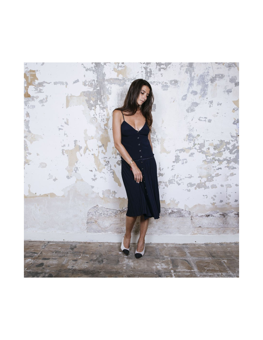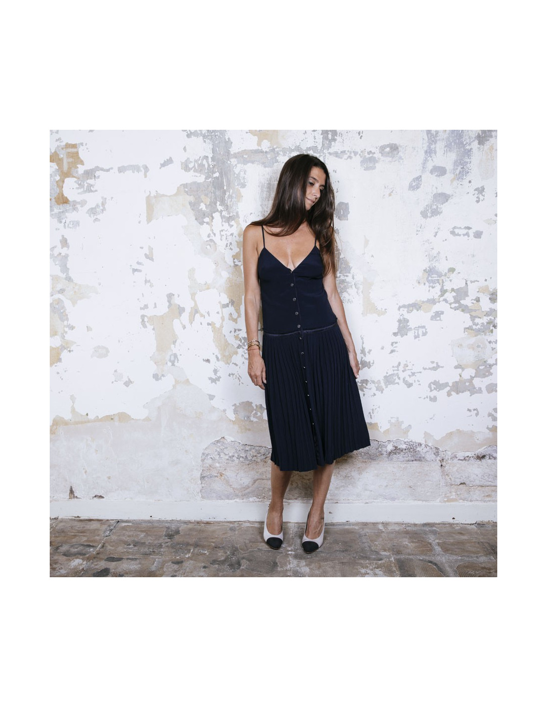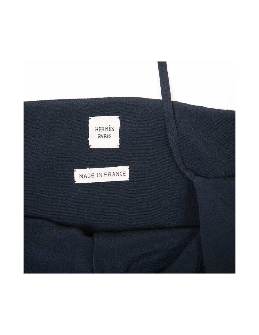 Robe Hermès en soie bleue marine à fines bretelles et boutonnée sur l'avant. Taille 34.