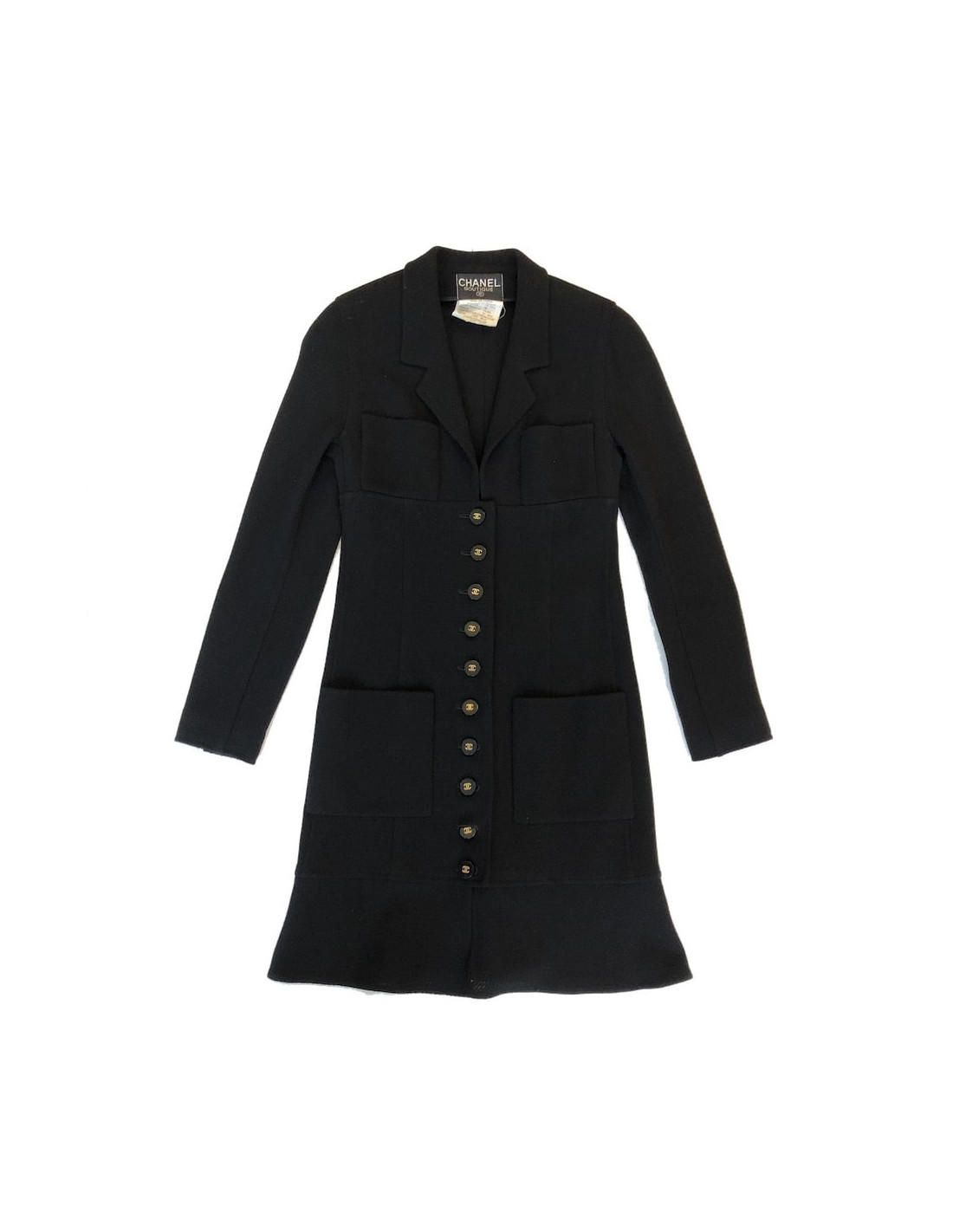 Wow! Incroyable pièce qui symbolise les années 90 de la Maison CHANEL, pièce créée par Karl Lagerfeld qui a su perpétrer le style incomparable de Gabrielle Chanel, tout en le modernisant. C'est aussi la naissance des supermodels telles que Claudia Schiffer, Carla Bruni ou la somptueuse Naomi Campbell portant à merveille les pièces de la Maison. La coupe de cette veste est droite et près du corps se finissant par un volant. Il y a quatre poches à l'avant de la veste. Les boutons sont noirs siglés "CC" dorés. Cette pièce peut être portée soit décontractée soit de façon plus élégante, aussi bien sur une robe que sur un jean. Cette veste longue peut se transformer en robe manteau, elle n'est pas doublée donc très légère.