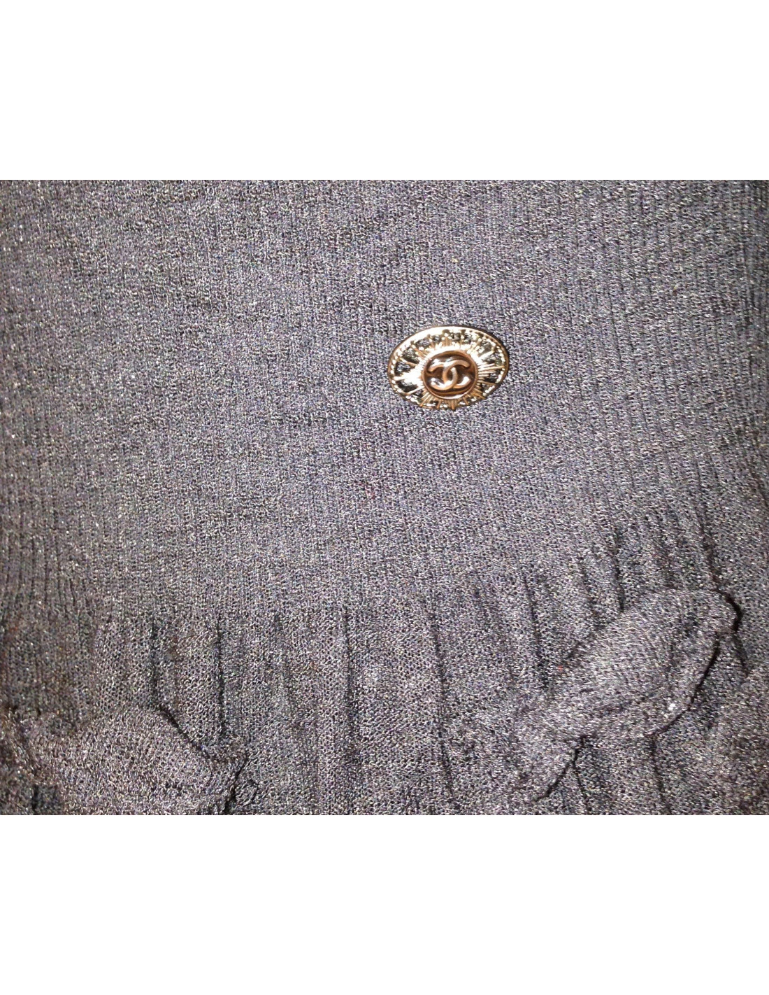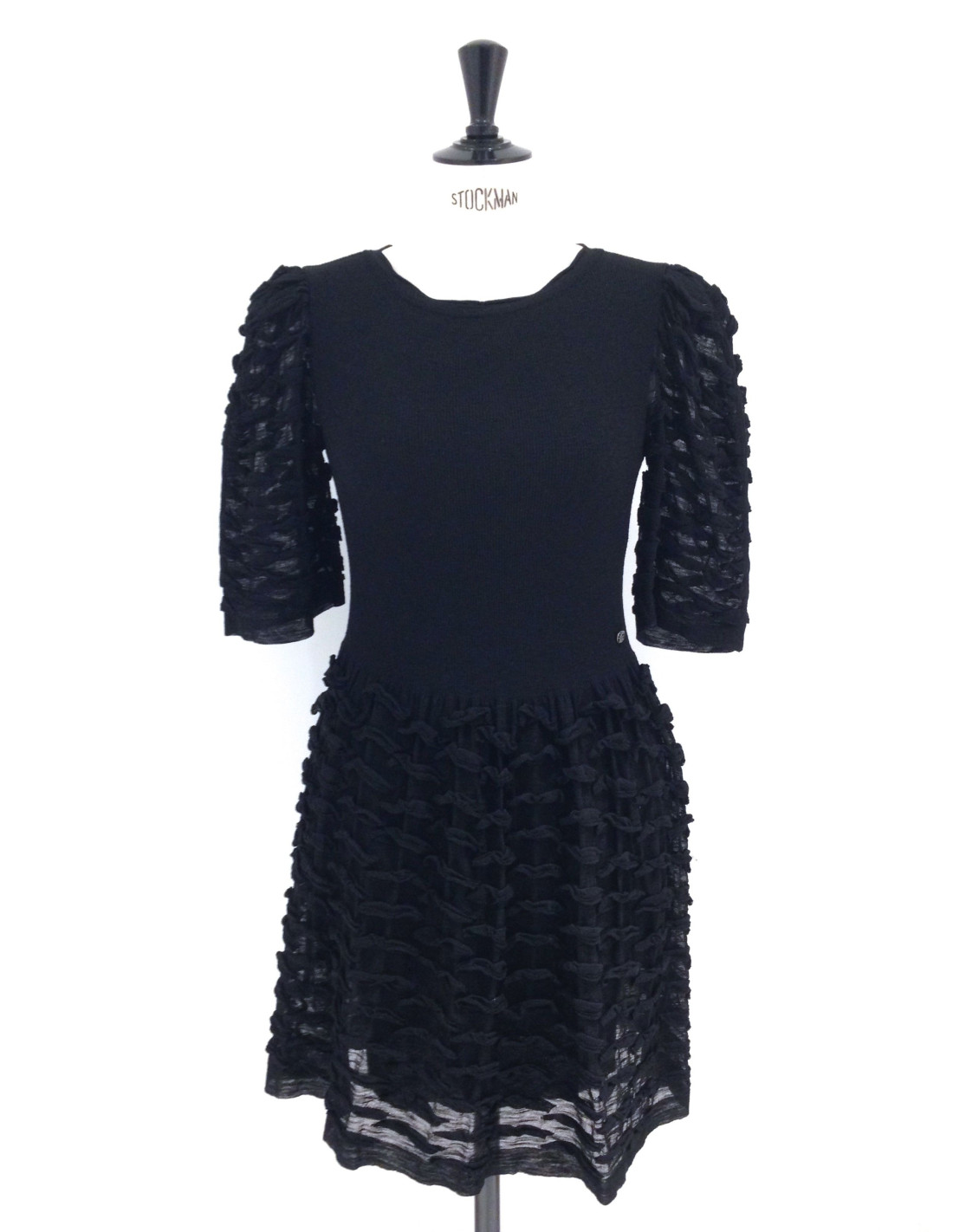 Robe CHANEL noire, taille 42, en coton modal, de la Collection 2012. Cette robe, brodée de tissu tressé, a un tombé fluide. La légère transparence du tissu des manches donne une touche très féminine à cette pièce. Se porte aussi bien pour une soirée que décalée agrémentée de bottes plates, rock ou chic, à vous de choisir!