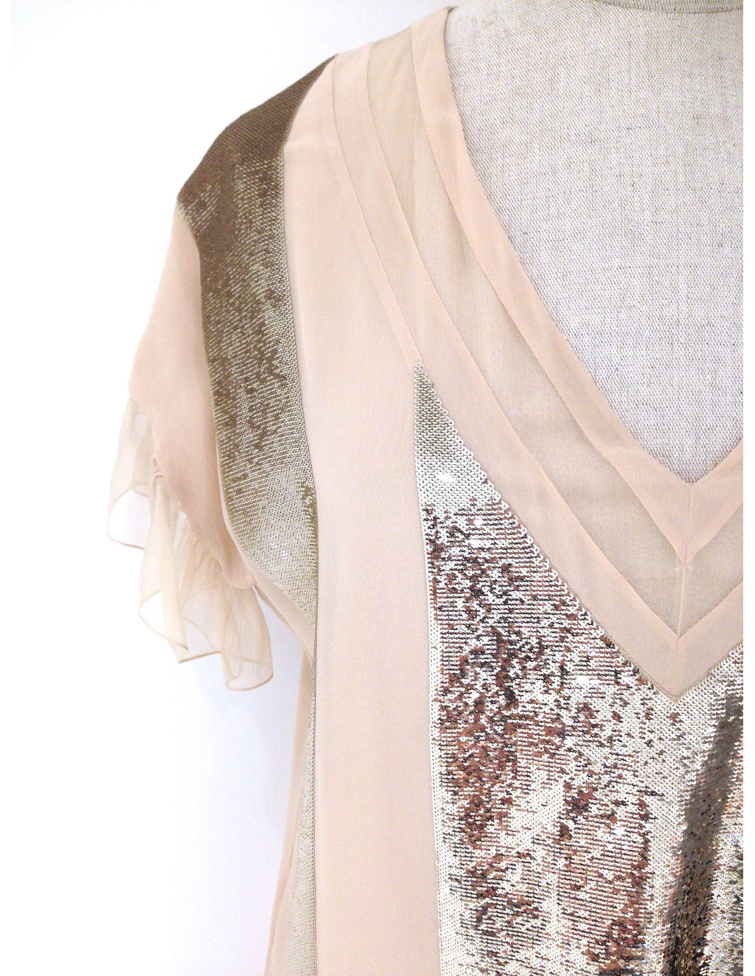 Robe CHRISTIAN DIOR en 100% soie naturelle, taille 34, beige poudré. Cette pièce exceptionnelle, comme neuve, est entièrement ornée de micro sequins argentés. Les manches ainsi que le bas de robe sont agrémentés de légers volants de soie. Le col en V est plongeant. Cette robe de style Charleston est MADE IN FRANCE.