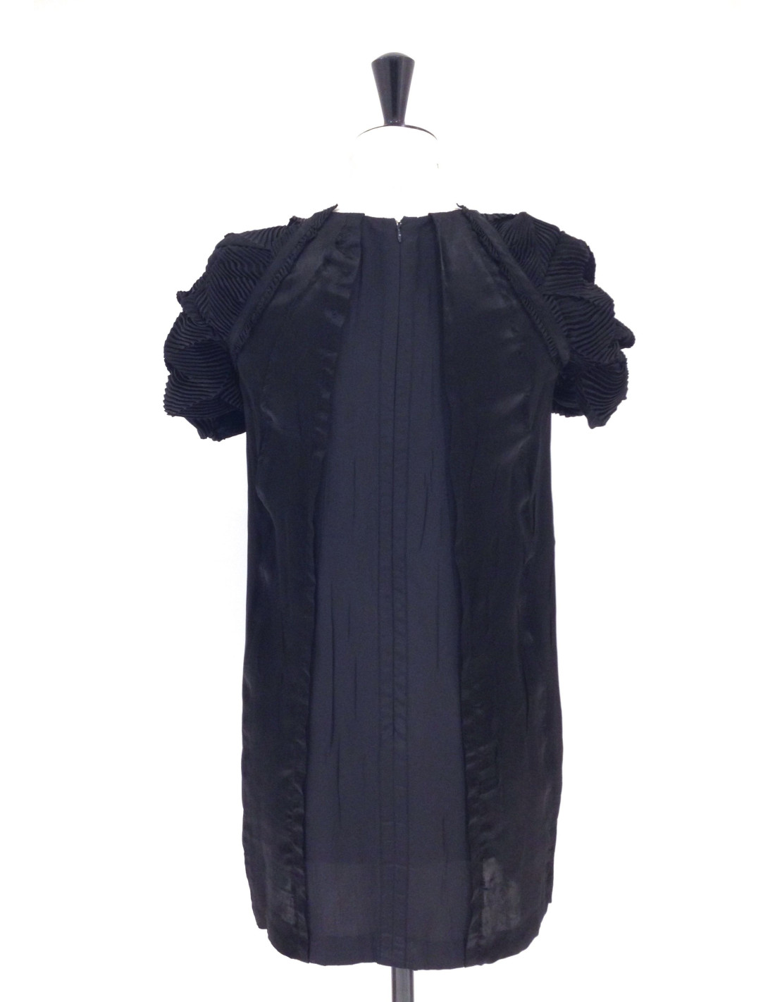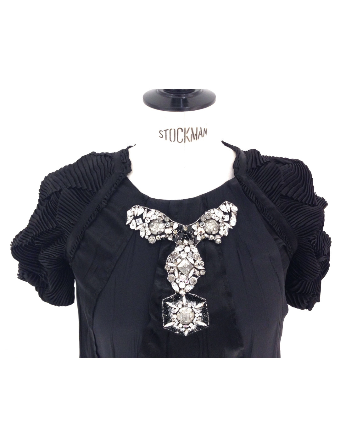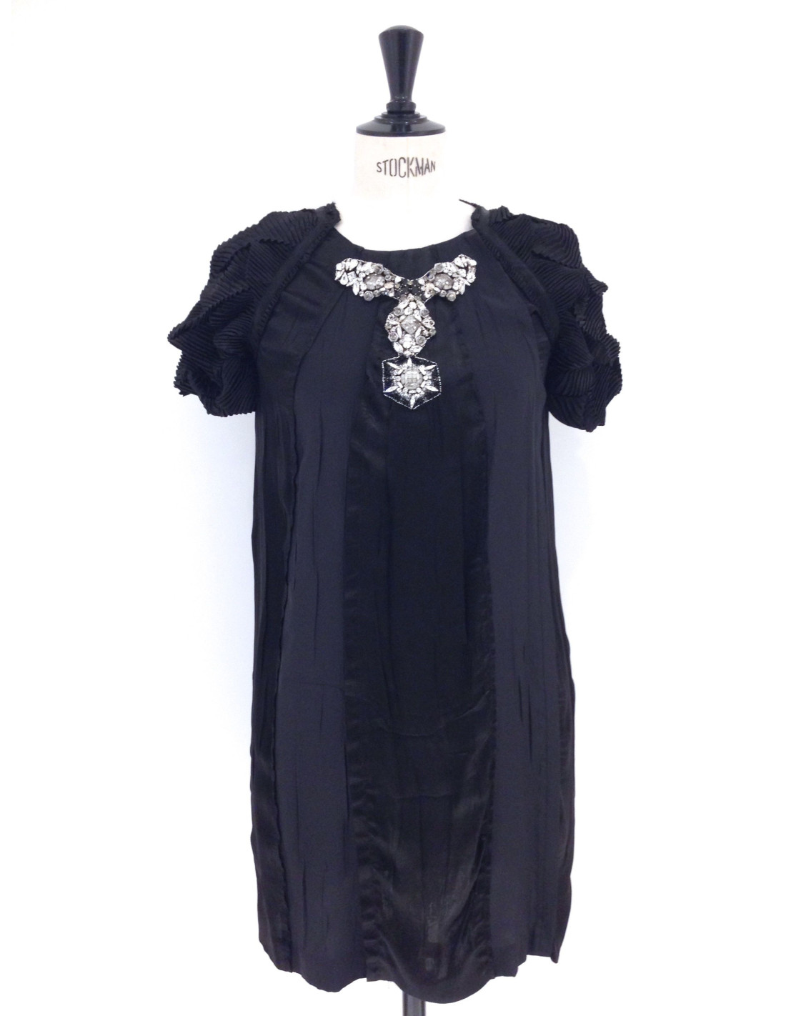 Robe PRADA en soie noire, taille 40. Cette magnifique robe de soirée, col rond, a de très belles manches raglans de soie gaufrée. Le col est orné d'un empiècement en cristal argent, noir, en perles noires, ainsi qu'en pièces martelées argentées.
