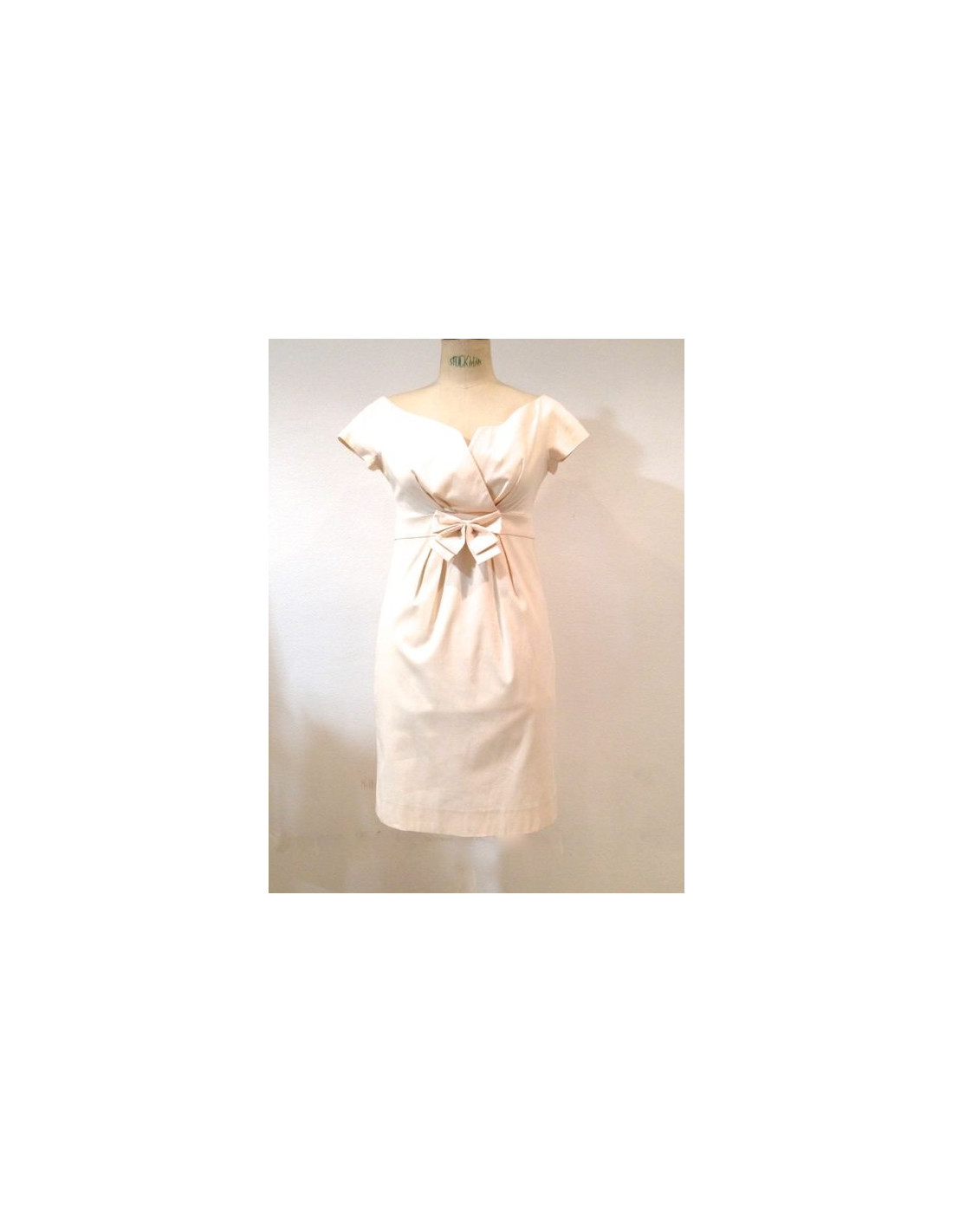 Robe de cocktail CHRISTIAN DIOR, taille 38, rose pâle, en parfait état. Made in France. Robe très élégante, style Grace Kelly, à manches courtes. Magnifique ouverture en V croisé. Un noeud (13 cm) orne la ceinture.Longueur : 83 cm, Longueur zip dos : 48 cm