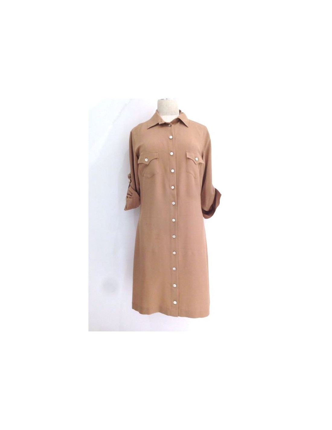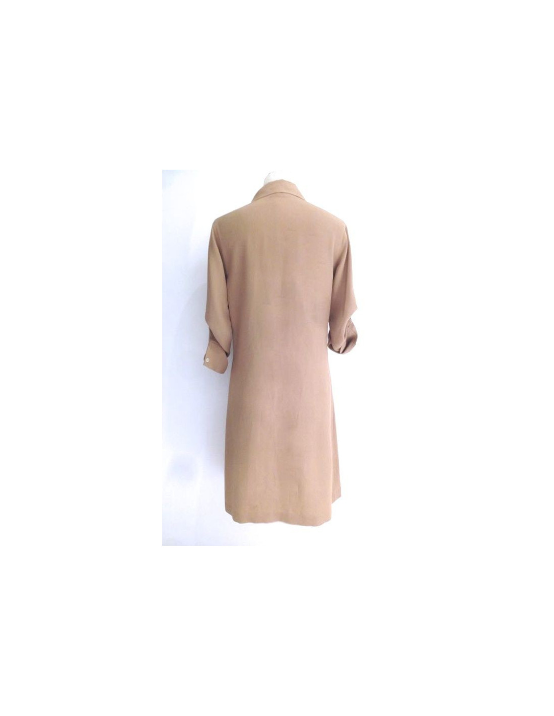 Robe CHLOE, camel, taille 40. Cette magnifique robe-chemise, couleur camel, peut être portée comme une blouse, ou accessoirisée d'une large ceinture de taille.De jolis boutons de nacre blanche dans le style d'un bouton de manchette permettent de fermer cette robe. La plaque intérieure des boutons est gravée CHLOE. Deux petites poches au niveau de la poitrine. Chaque manche dispose d'une très belle boucle or. Attention : il manque un petit bouton de nacre sur la manche gauche.