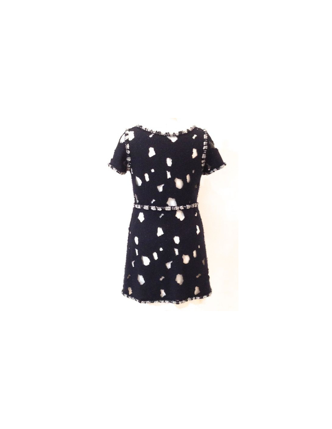 Robe CHANEL en tweed bleu marine et résille ajourée avec fond de robe blanc. La robe blanche est en 100% viscose, donc très confortable et légère. Il s'agit d'une robe trois trous, cintrée avec de très délicates franges sur le col. Les deux robes disposent d'une fermeture éclair le long du dos (53 cm et 50cm). Le dos de la robe en tweed est légèrement décolleté, ce qui laisse apparaître la robe blanche. Collection Printemps-Eté. Made in France.