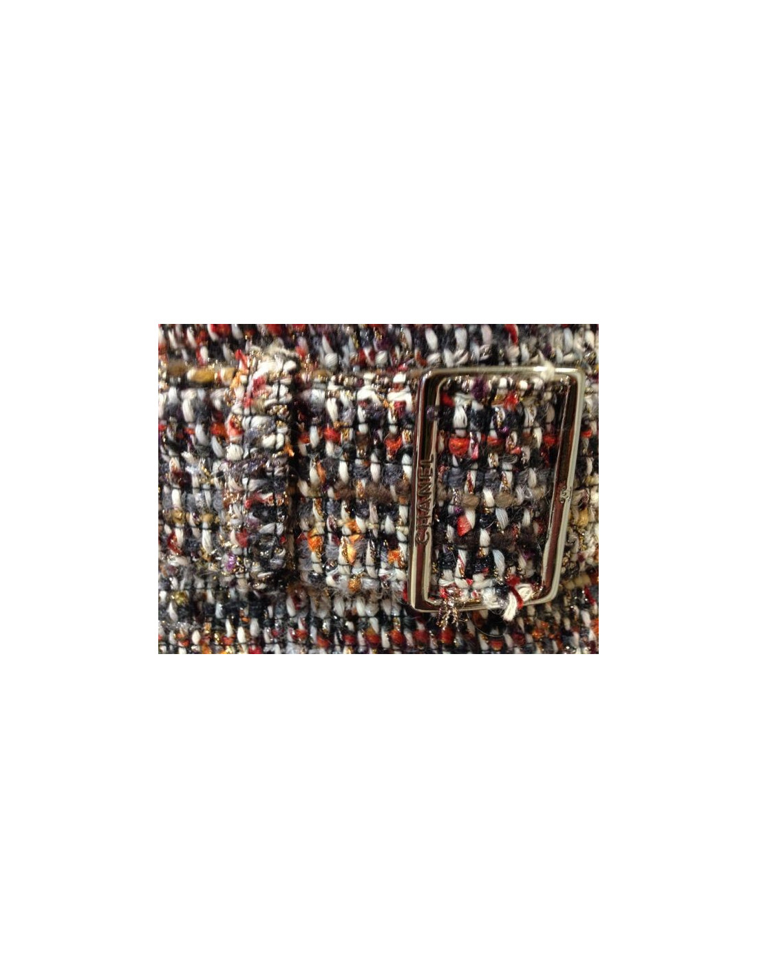 Robe CHANEL en tweed multicolore ( écru, gris souris, rouge, moutarde, doré), forme patineuse en parfait état. Collection Automne-Hiver 2007. Cette robe est accessoirisée d'une ceinture à la boucle en métal argenté signée CC et "CHANEL". Doublure intérieure en soie beige. Fermeture éclair invisible dans le dos. Made in France.