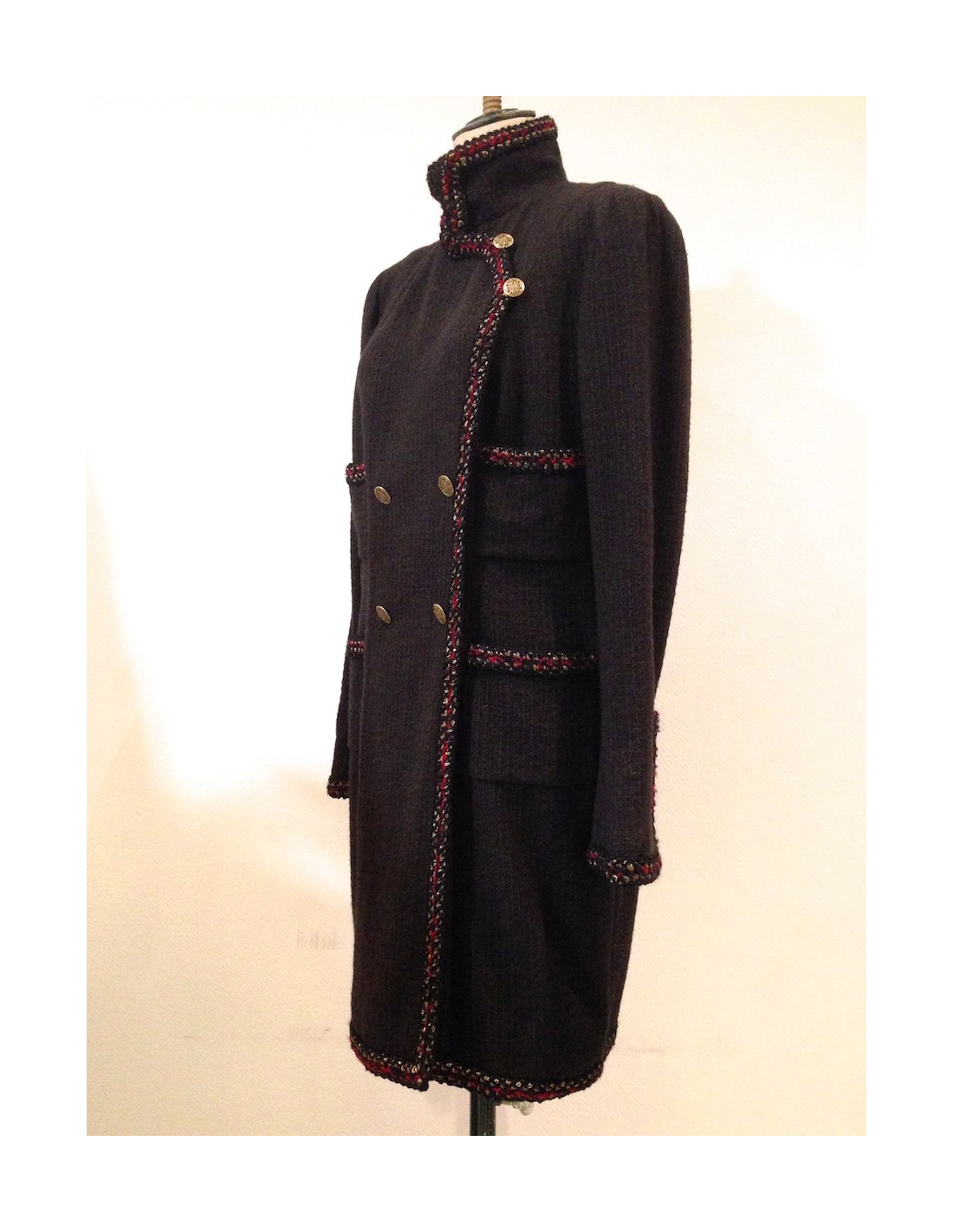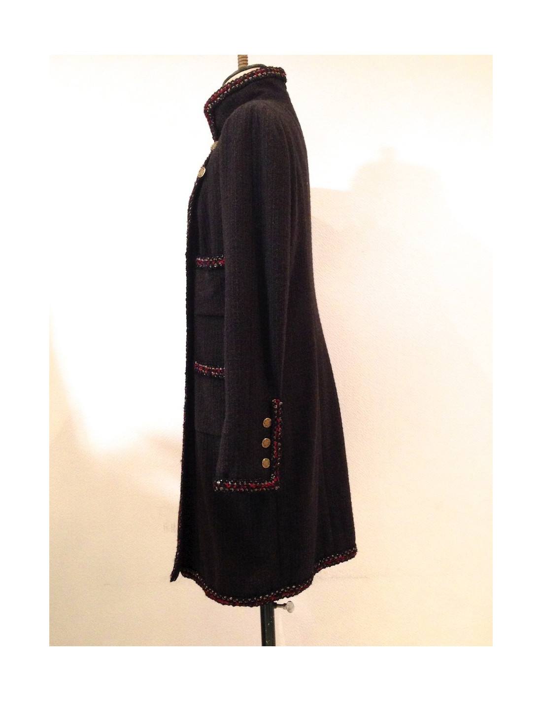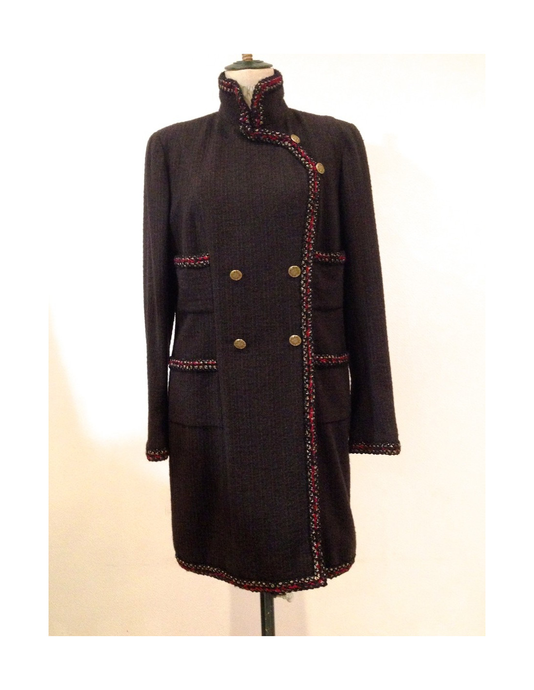 Robe Chanel, façon manteau de la Célèbre Collection des métier d'art PARIS-SHANGHAÏ, taille 46 en tissu chiné marron. La robe est gansée en tweed rouge, noir et doré et n'a jamais été portée.
