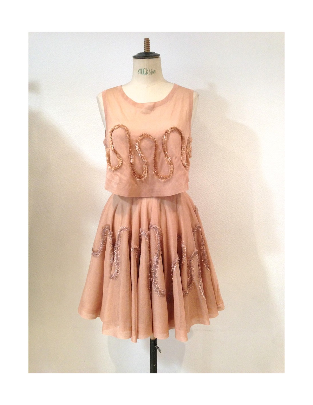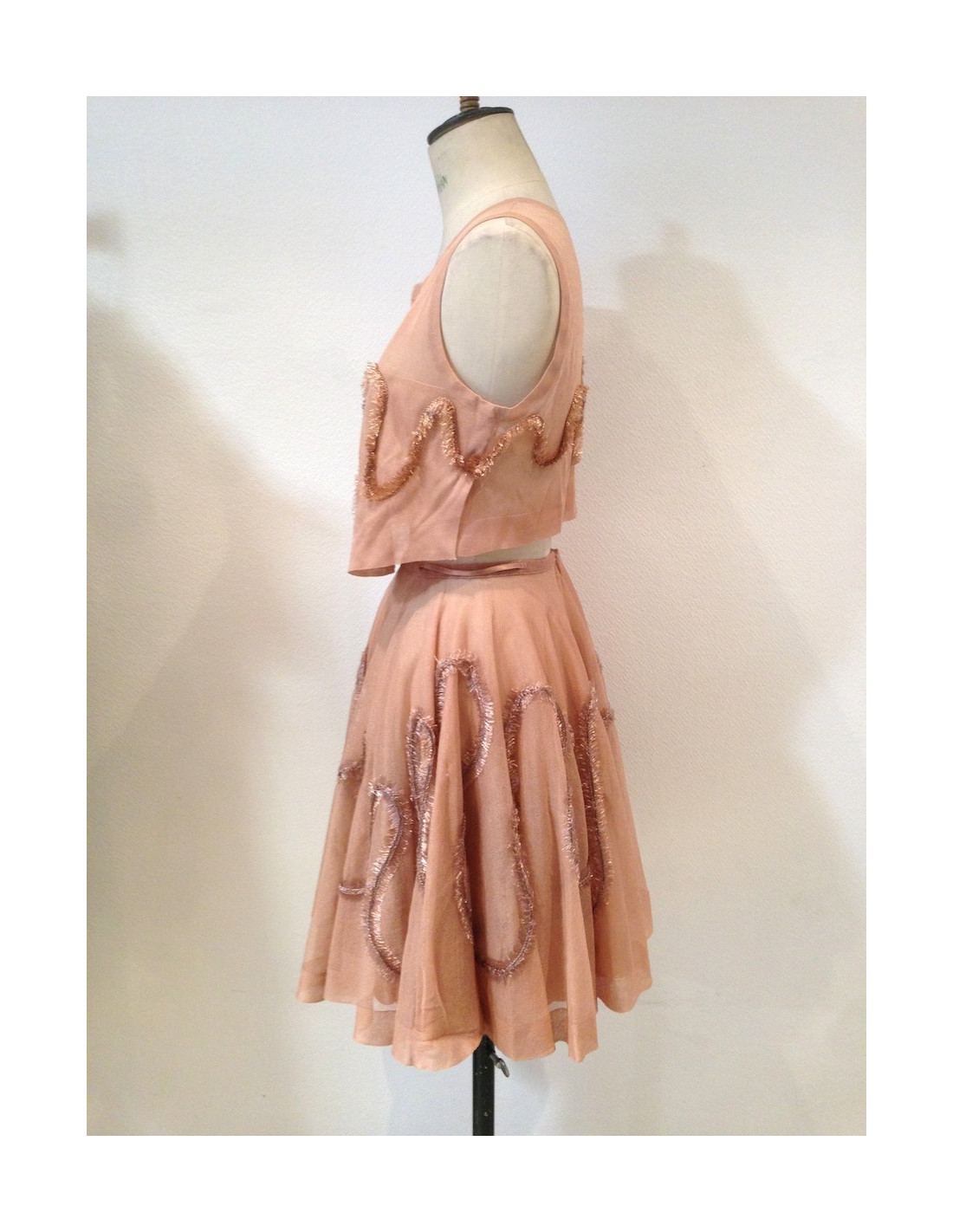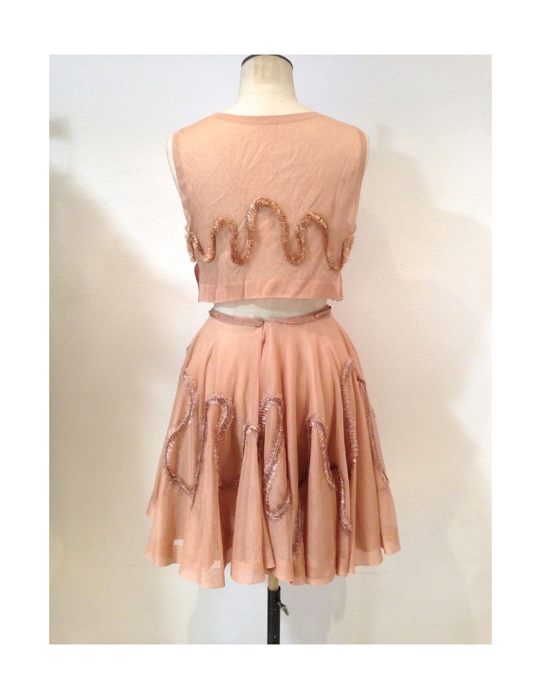 Ravissante jupe à volant Alaia assortie de son top en forme de petit débardeur court sans manche; couleur rose poudré. Composition : 60% Soie/ 40% Viscose; Taille 40fr pour la jupe (ceinture élastique) taille 42fr pour le débardeur. C'est un ensemble couture, beaux détails et finition impeccable.