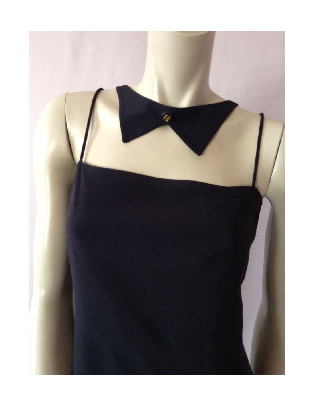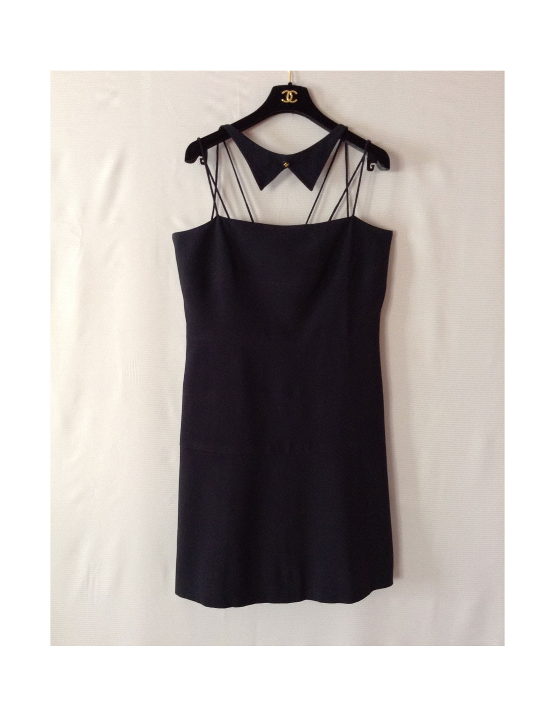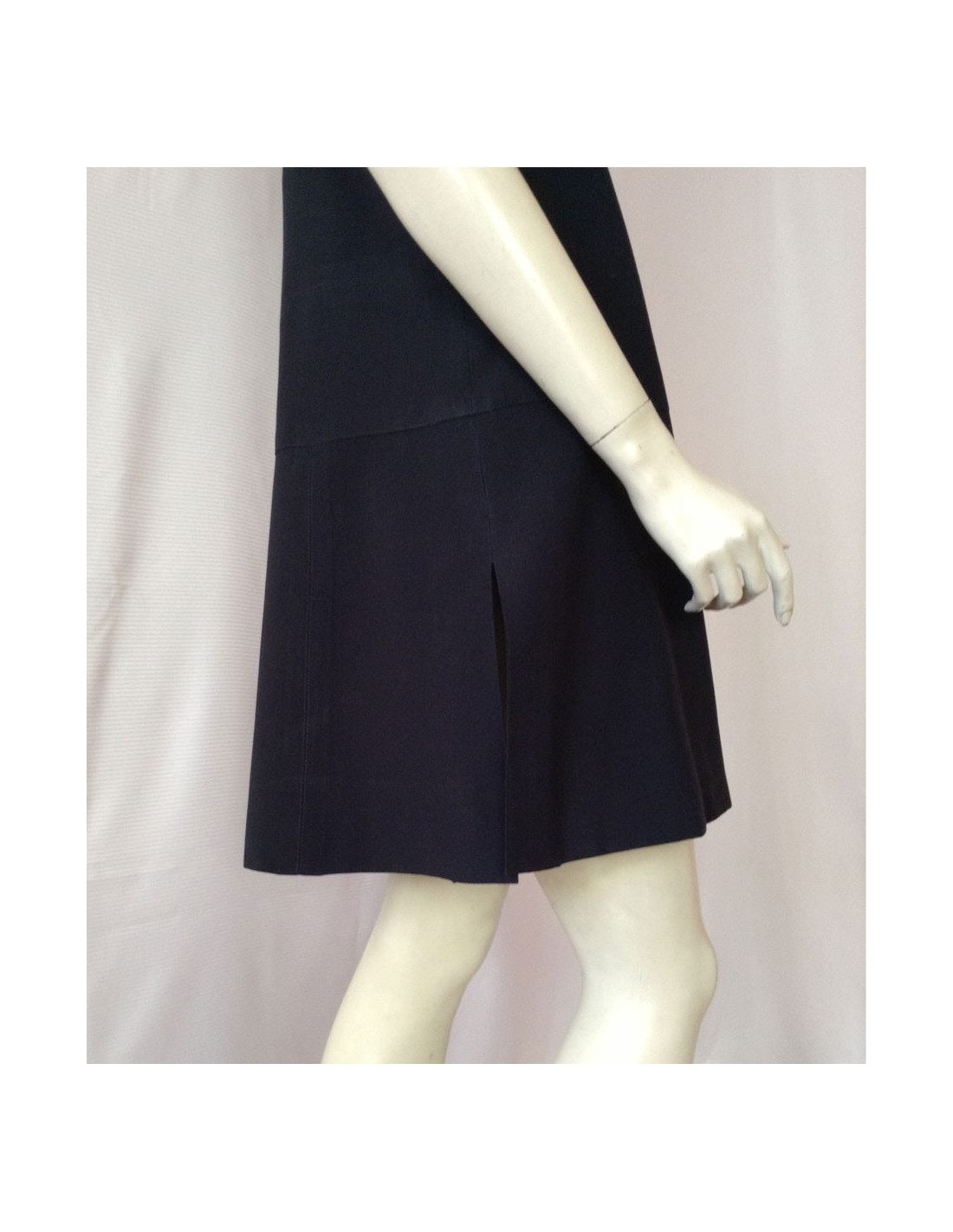 Robe Chanel "Très Mademoiselle Chanel" avec son petit col "Karl Lagerfeld" de couleur bleu marine, la coupe est ajustée à la taille puis légèrement évasée avec sa petite fente sur les côtés de 21cm. C'est une taille 42fr. Sa composition est la suivante: 52% viscose ,48% Acétate et la doublure est en soie 100%. - collection : 97/P vintage