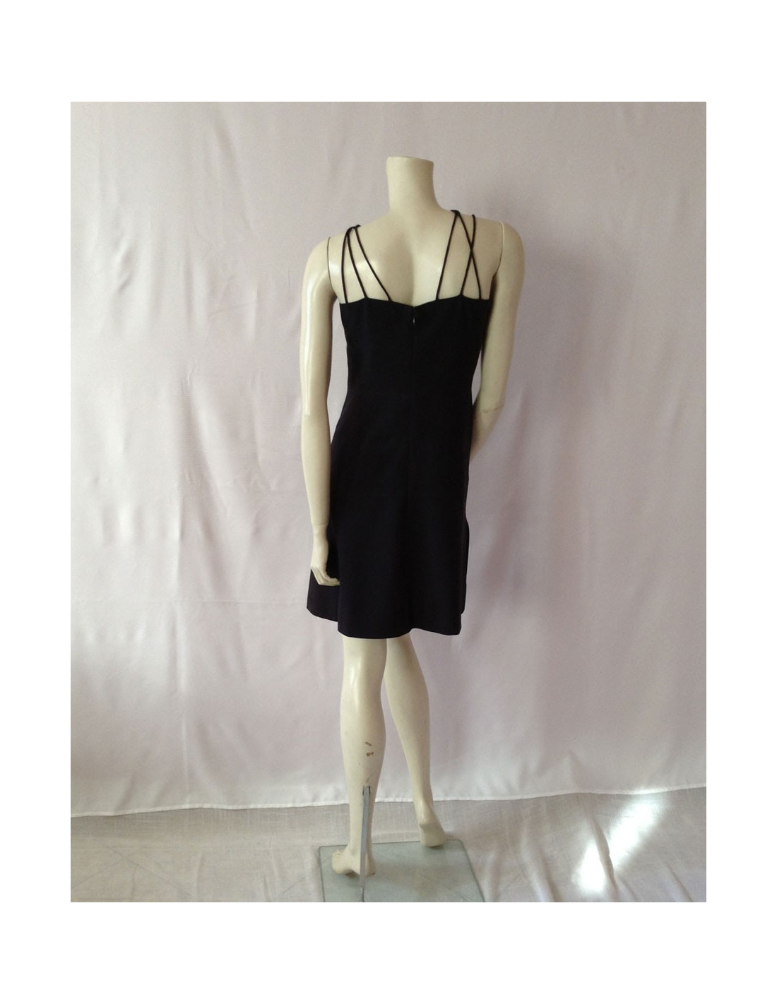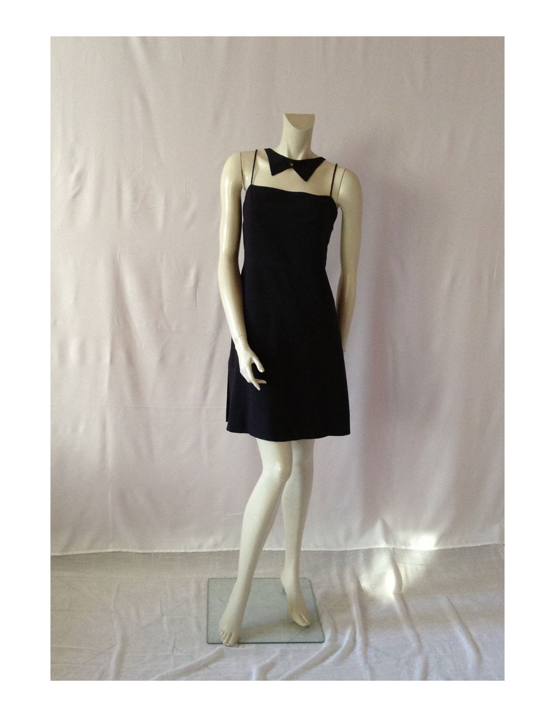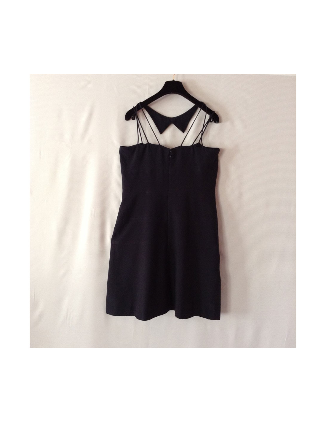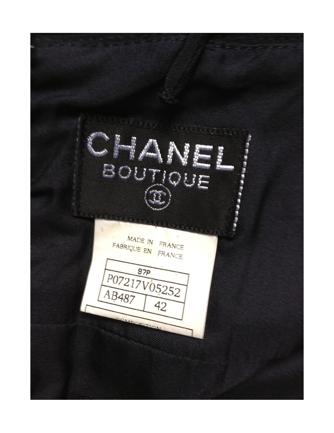 Robe Chanel "Très Mademoiselle Chanel" avec son petit col "Karl Lagerfeld" de couleur bleu marine, la coupe est ajustée à la taille puis légèrement évasée avec sa petite fente sur les côtés de 21cm. C'est une taille 42fr. Sa composition est la suivante: 52% viscose ,48% Acétate et la doublure est en soie 100%. - collection : 97/P vintage