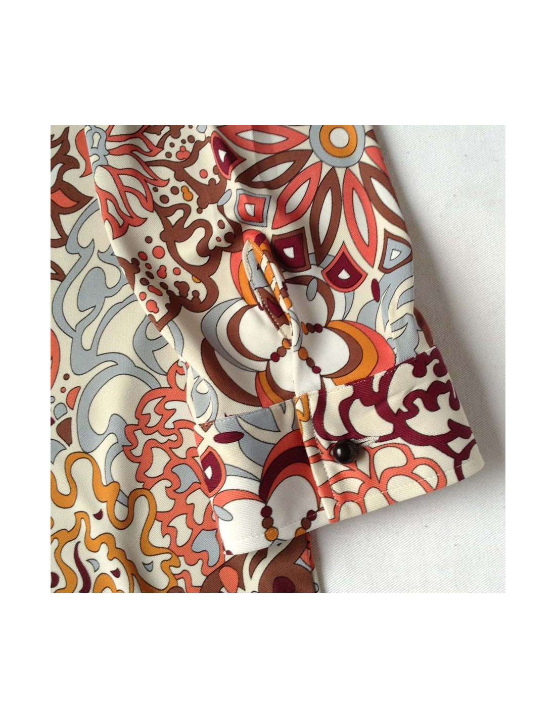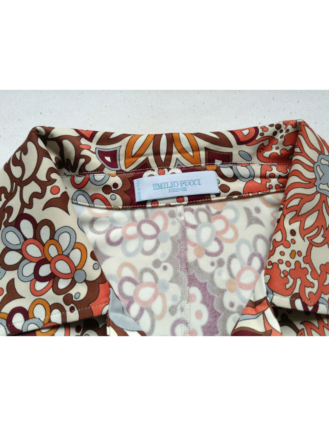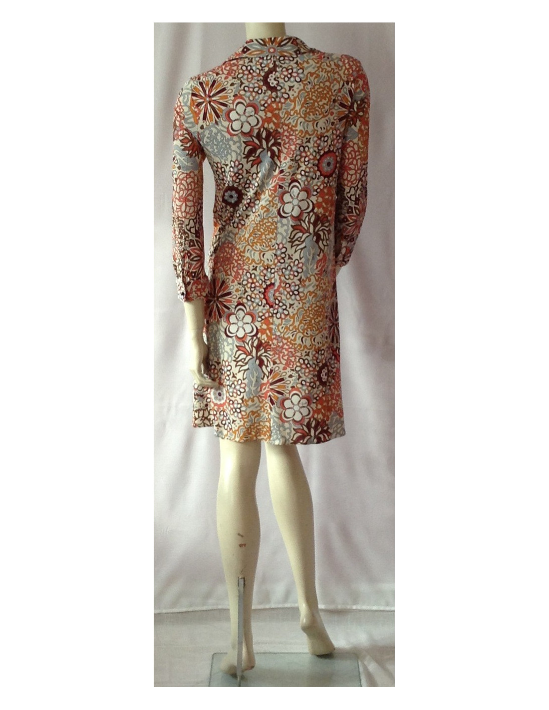 Un Classique! Robe EMILIO PUCCI imprimée dans un joli camaïeux de couleur : bordeaux, marron, orange et bleu ciel sur un fond écru, Signature de la Célèbre Maison Pucci, c'est juste Ravissant!Robe taille 38FR, mi longue,manche longue (50 cm) col souple en V et en100% viscose.