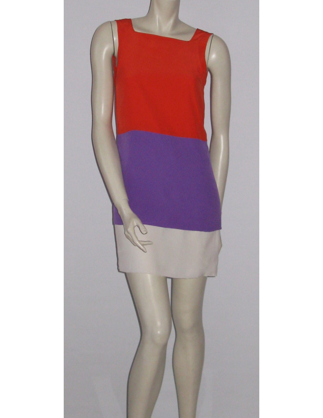 Très jolie robe! "look rétro" Robe Gucci T 40IT, en crêpe de soie tricolore orangé/parme/blanc. Coupe droite, longueur en dessous du genou, décolleté droit, cintré au niveau du buste avec empiècement boutonné à l'intérieur afin de mettre votre poitrine en valeur. Bandes horizontales tricolore: orangé en haut, parme au milieu, blanc en bas. Dos découpe en V.