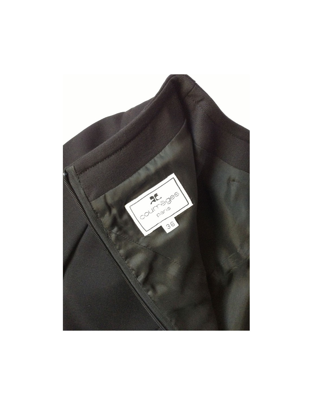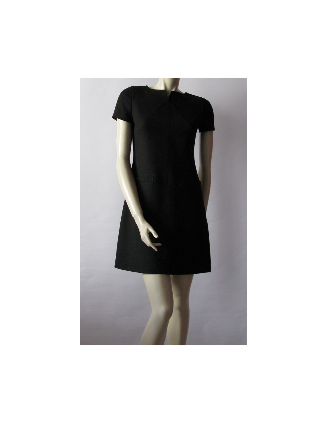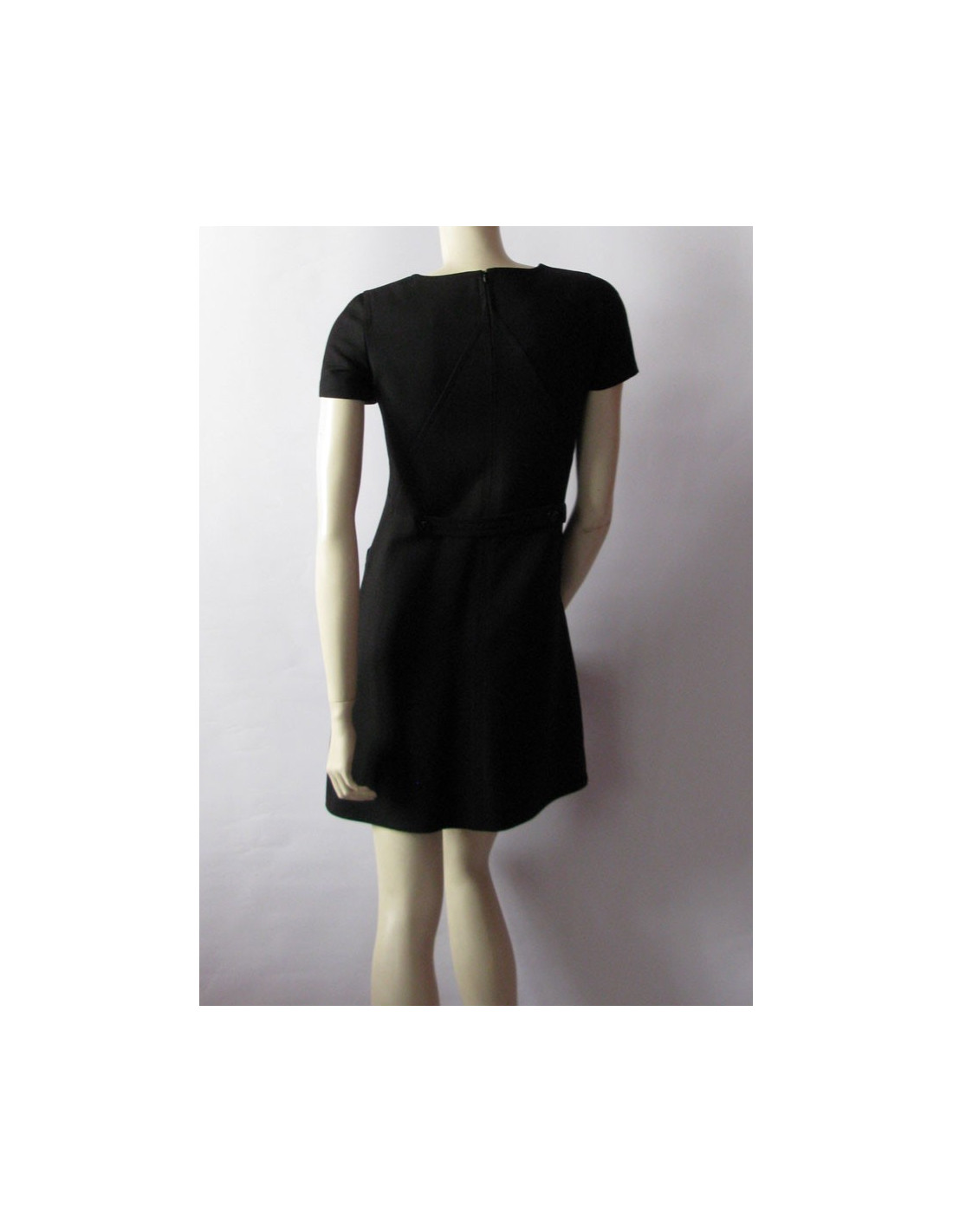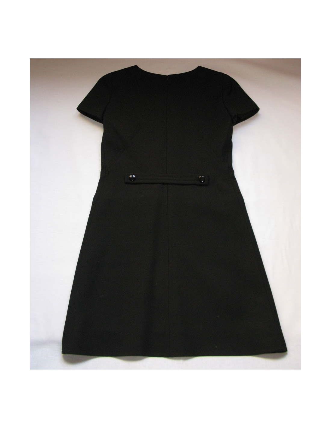 Ravissante! Robe COURREGES noire T36Fr, mi-longue, col ras du cou avec V au centre, manches courtes, ligne cintrée, ajustée en haut et forme trapèze vers le bas, poches plaquées avant à la hauteur de la taille. Au dos long zip de fermeture invisible et bride horizontale boutonnée de décoration. 100% laine.