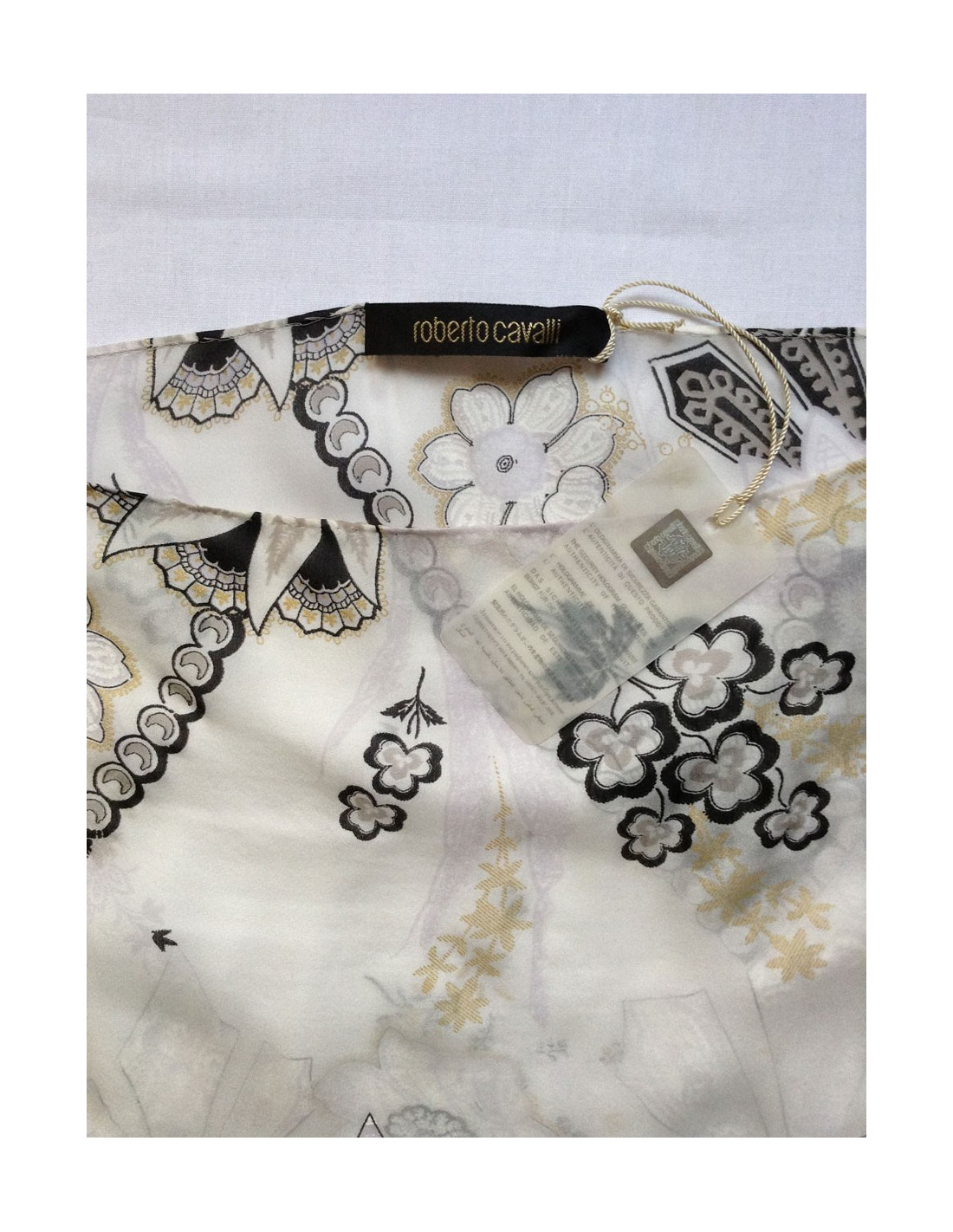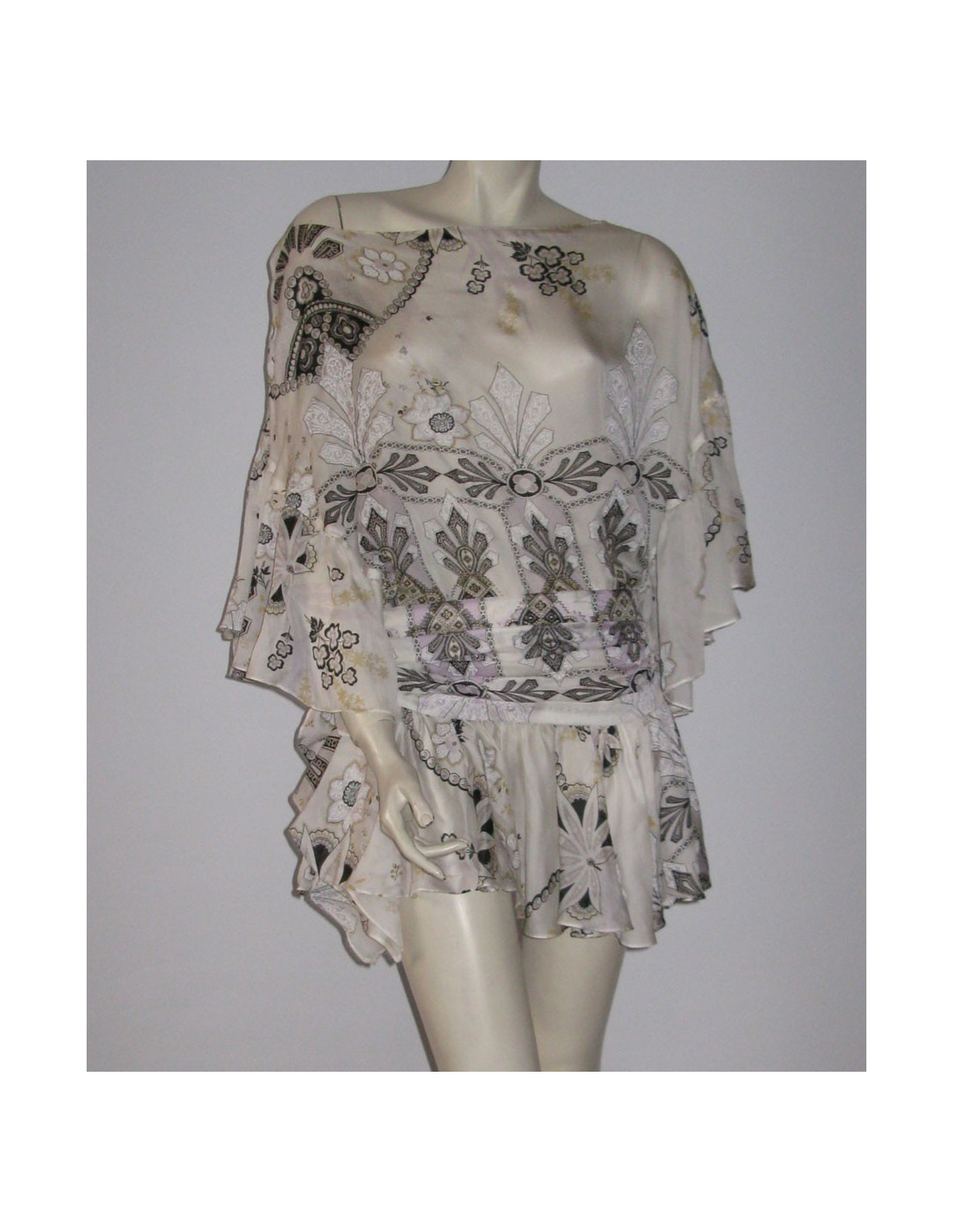 Magnifique! Tunique ROBERTO CAVALLI en soie imprimée assortie d'une ceinture drappé. Encolure ronde, manches à volant asymétrique ainsi qu'au bas du top. Ceinture élastique intégrée à la taille. Taille 40it. 100% soie.