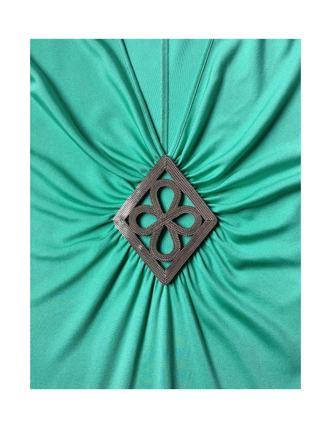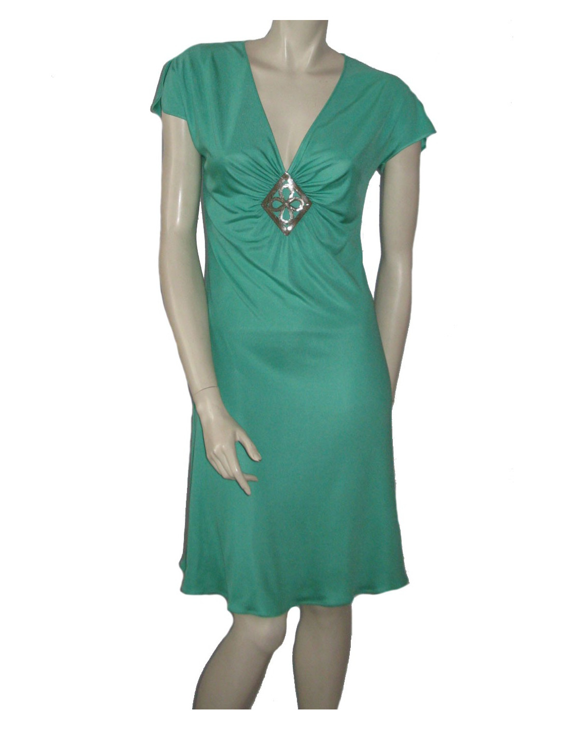 Séduisante par sa fluidité! Robe EMILIO PUCCI en soie turquoise T38Fr, manches courtes fendues sur les côtés, décolleté en V avec empiècement géométrique détachable par boutons pressions. Ligne ajustée en haut et fluide vers le bas. En très bon état.