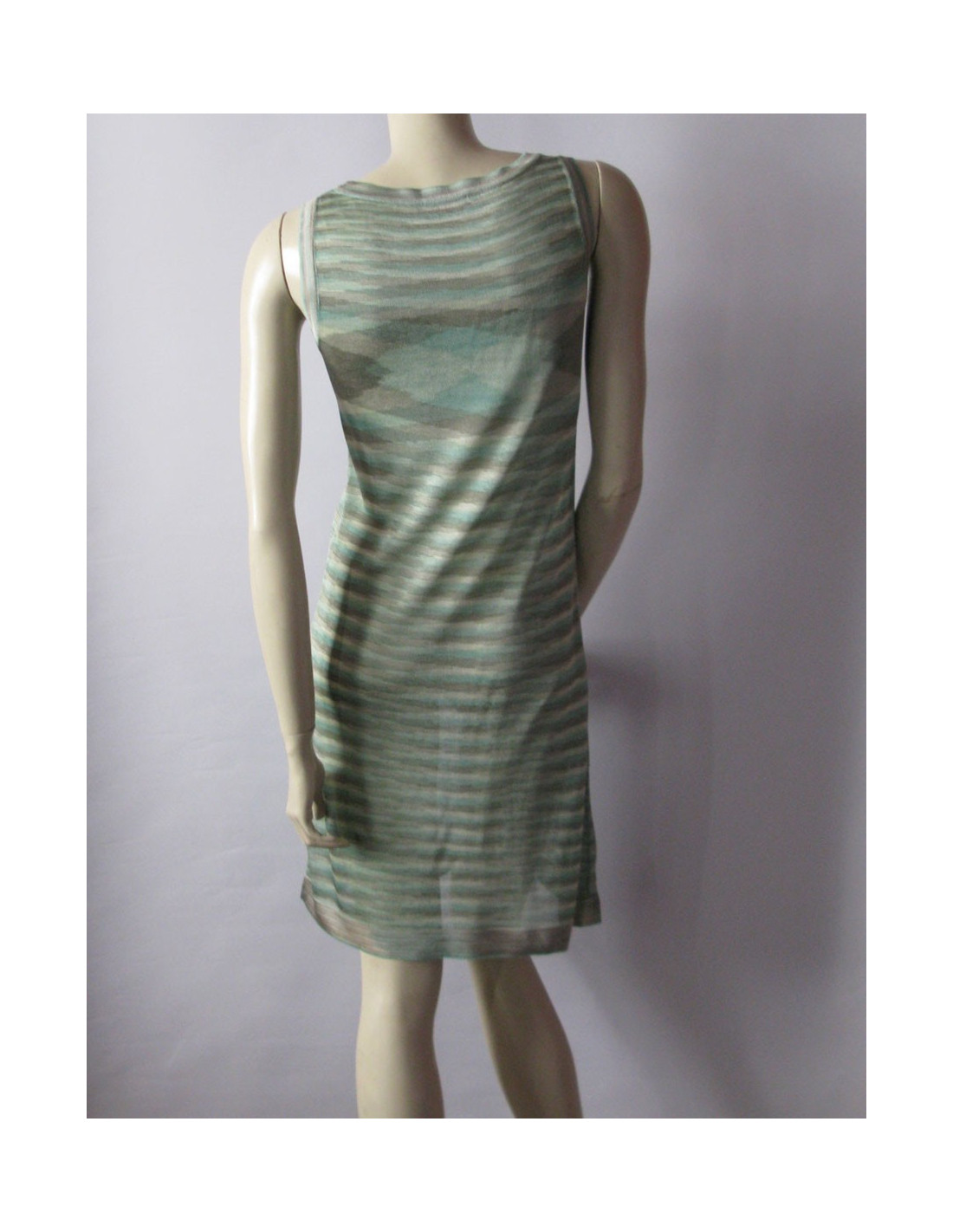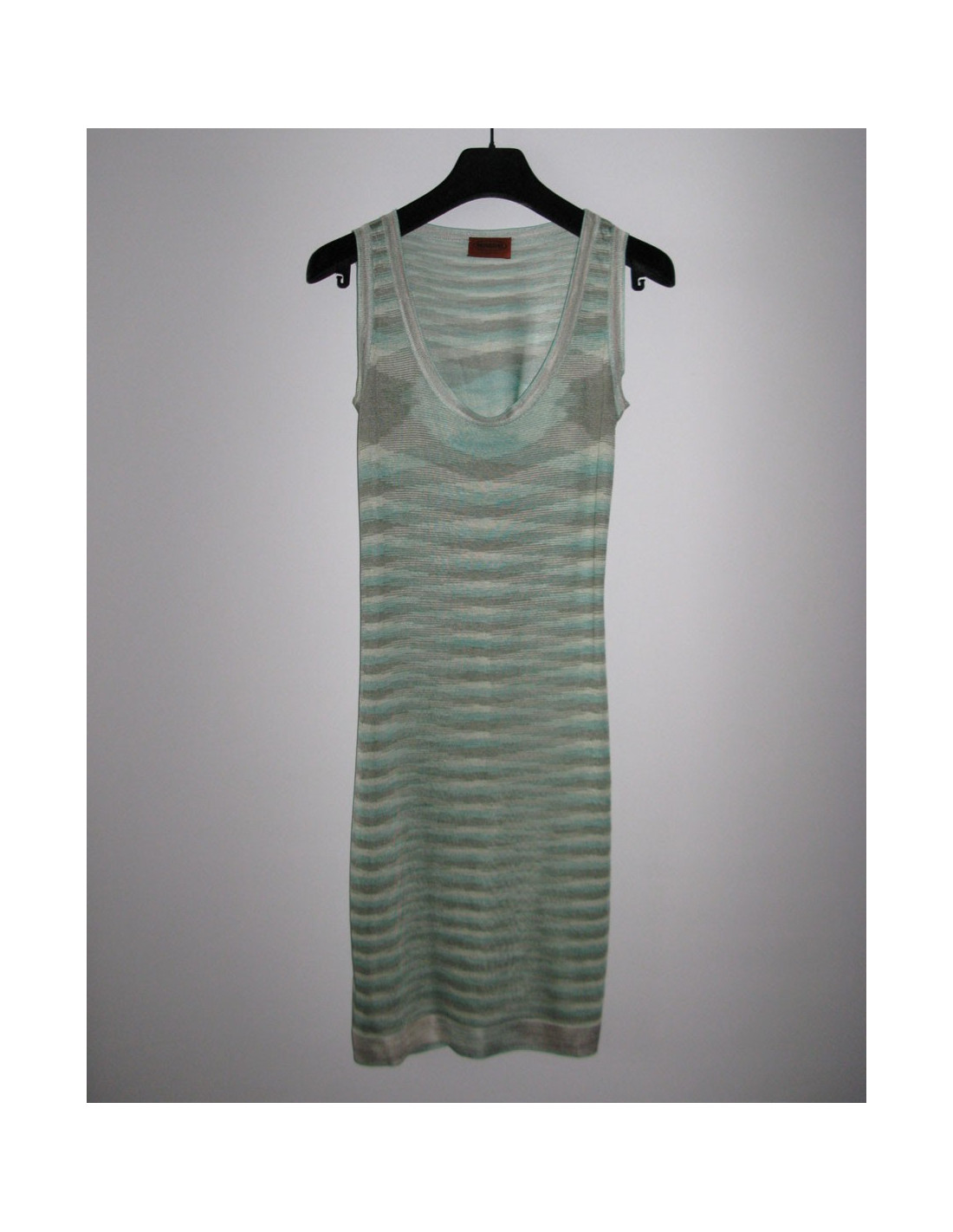 We Love! Robe MISSONI courte rayée aux couleurs pastel gris, vert et blanc. Sans manche, encolure ronde, coupe droite. Taille 38fr. Trés bon état! Pas d'étiquette de taille et de composition.