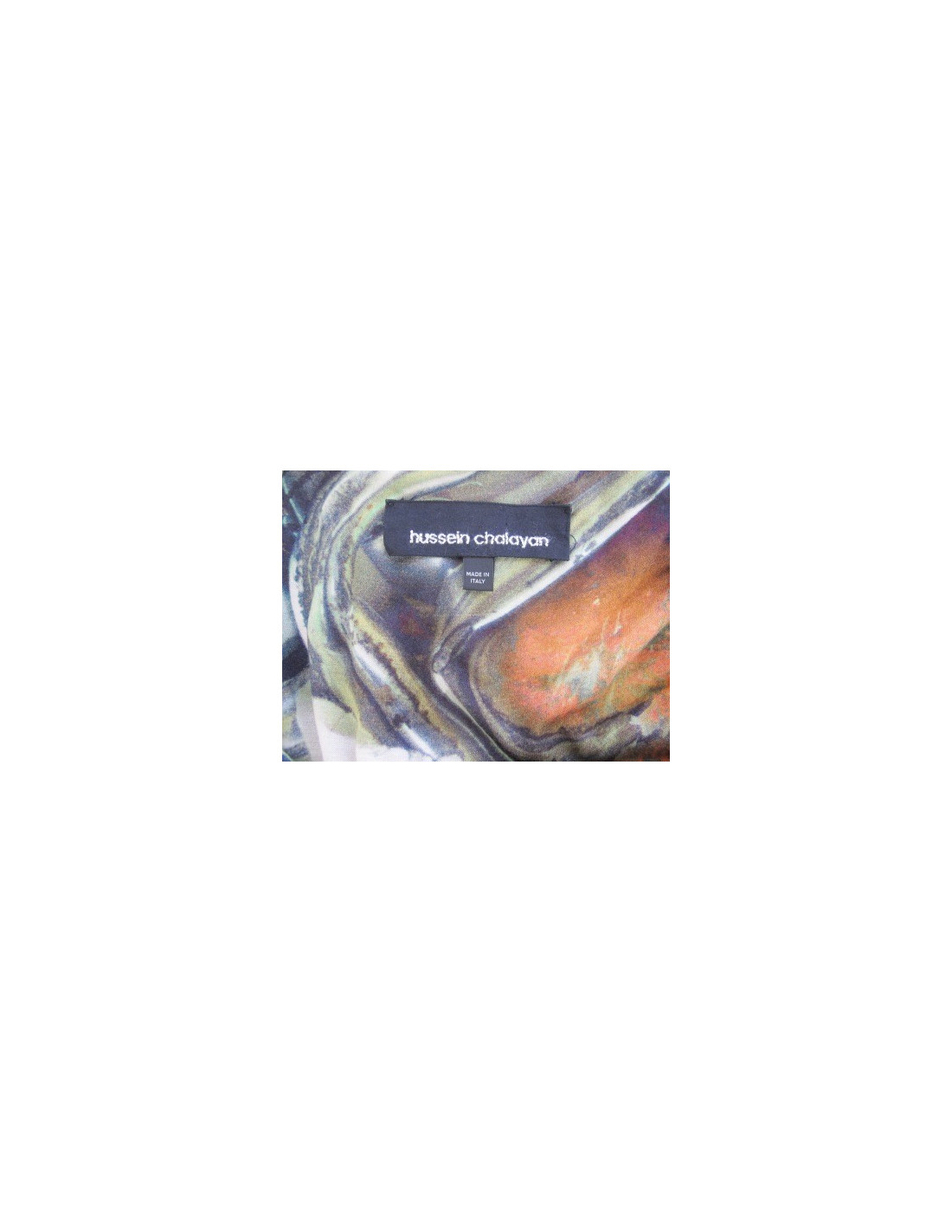 We Love! Robe Hussein Chalayan mi-longue, imprimé multicolore à forte prédominance de vert. Col V, sans manche avec empiècement du même tissu ajouté aux épaules, lui donnant un effet "manches courtes". Cette robe est joliment accentuée grâce à ses fronces gracieuses à l'avant et à son joli drapé au dos. Taille 42it soit 38fr. 100% viscose.