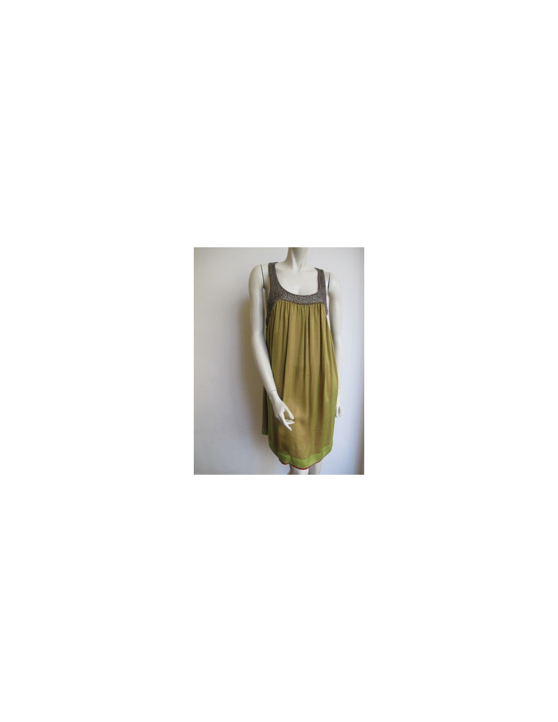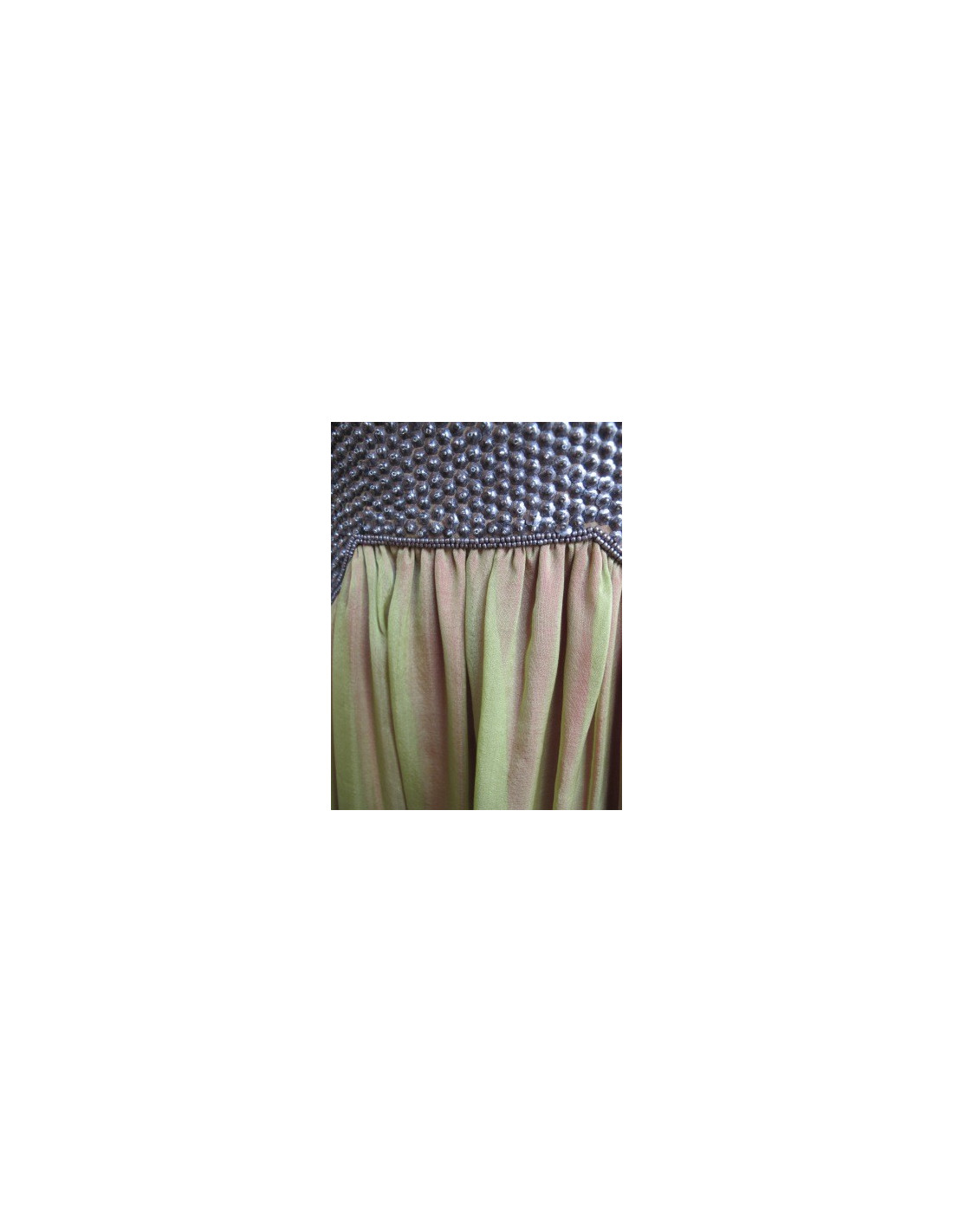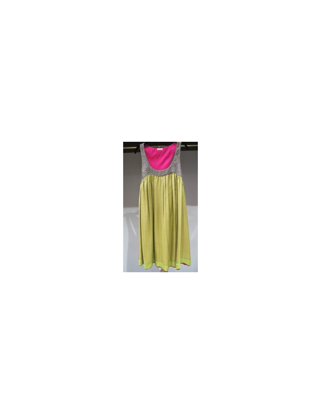 Ravissante! Robe Zazo bicolore sans manche, décolleté arrondi devant, esprit dos nageur. Robe aux genoux, fluide, ligne trapèze. Son haut est brodé de sequins rehaussé de petites perles de couleur bronze et son bas est en soie vert. Doublure fushia. Taille 38. 100% soie.